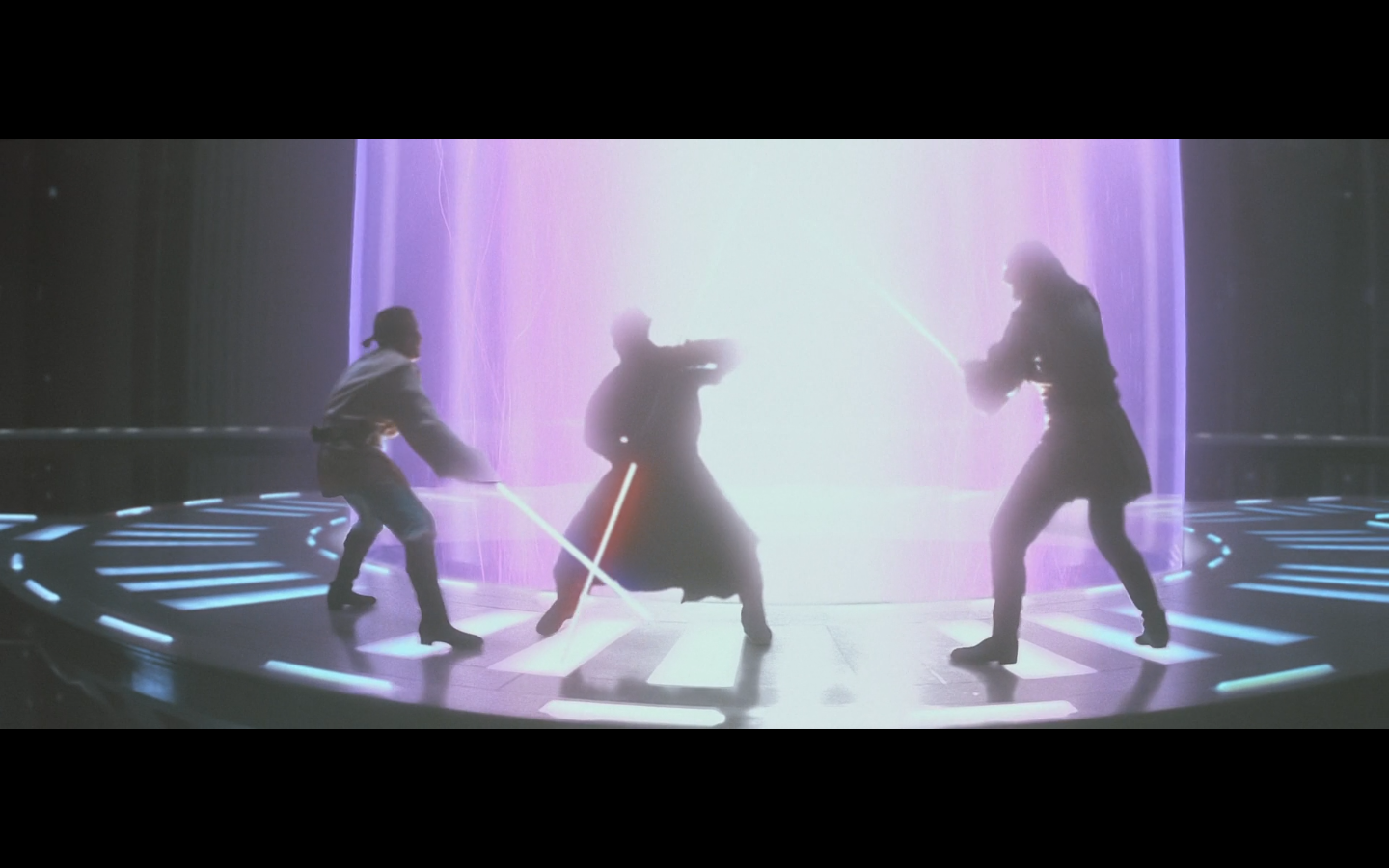 I guess I kind of like the color. I like the abstraction of the lightsabers as them. It’s still kind of a weak shot, now that I think of it. It gets a pass because George doesn’t just show them. I’m sure there are cooler ways to set this up, but this ain’t bad.
