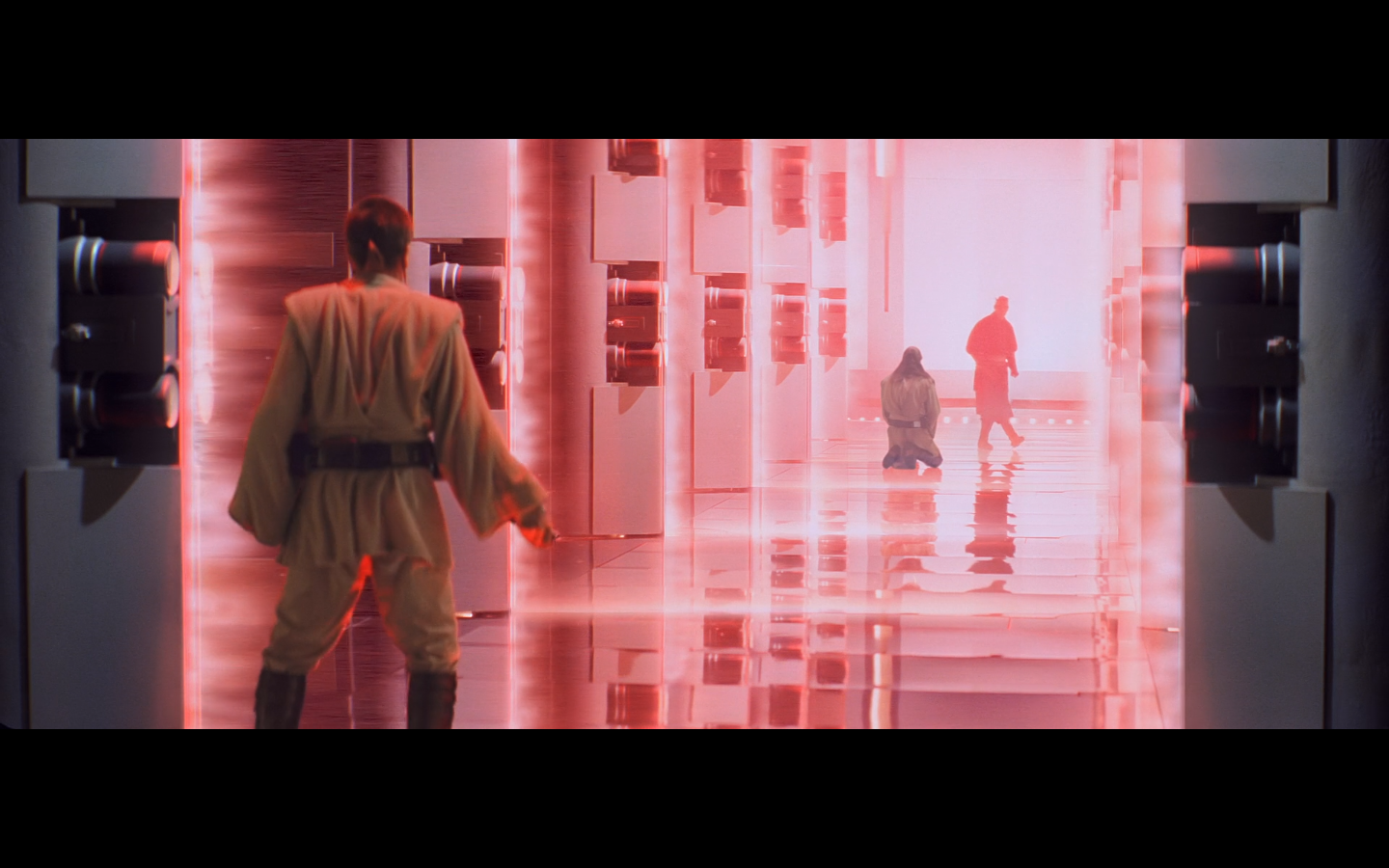 Just walk away. Don’t look back. That’s sexy as hell. That’s how you murder someone. Also of note, this is the first time we see someone run through with a lightsaber, rather than chopped with one. To me, one of the most remarkable things about this shot is that Lucas and his people paid enough attention to have his stupid CGI laser door’s image beautifully reflected in this obsidian floor. Maybe if you paid half as much attention to plot and story as you did to CGI details like this, we’d have gotten a better movie to watch. But whatever, just enjoy the door reflection, I guess.