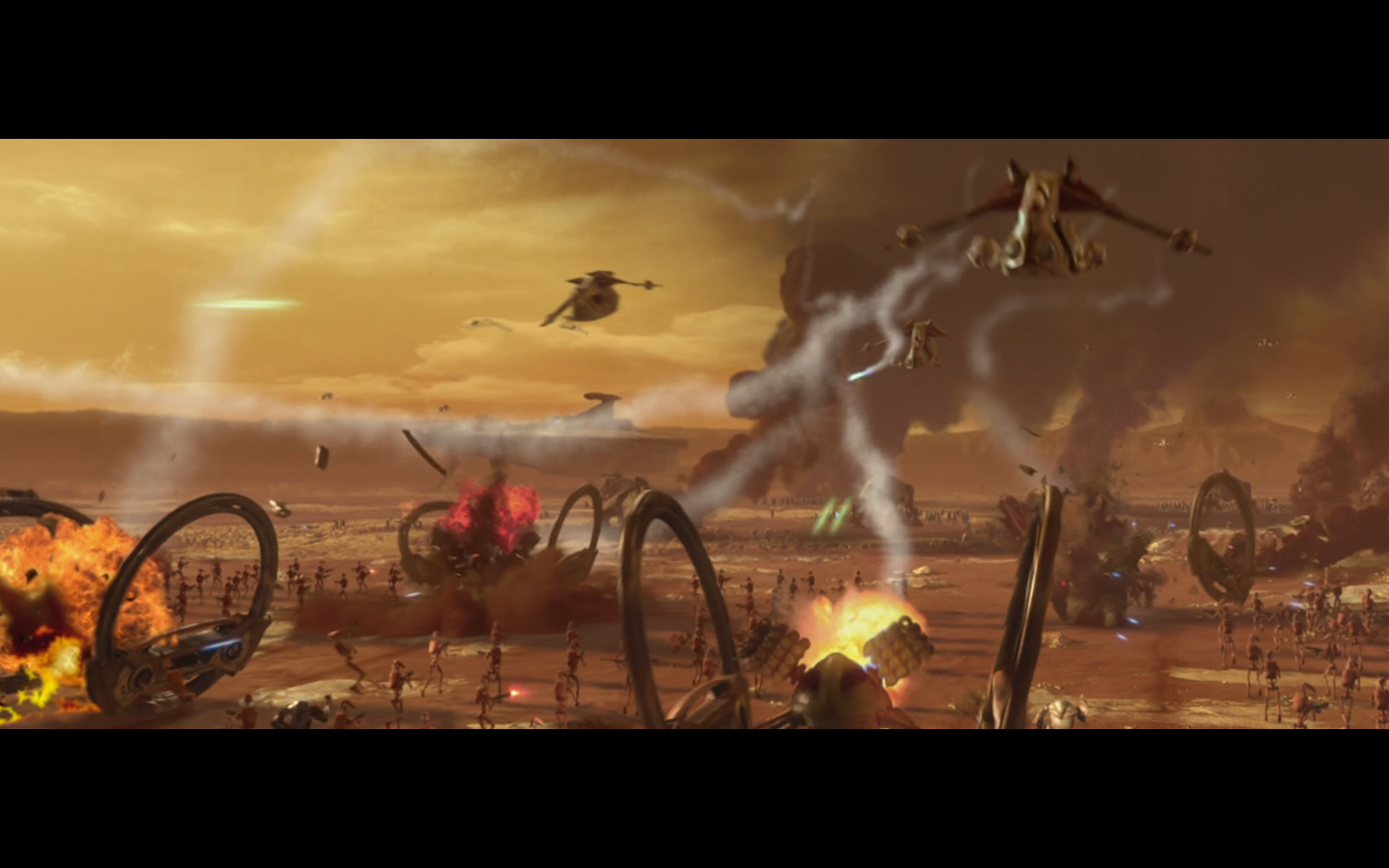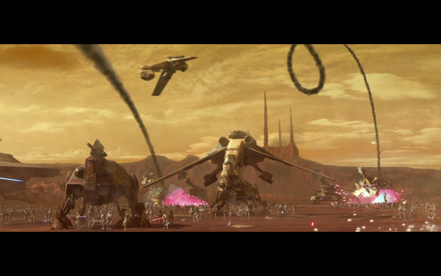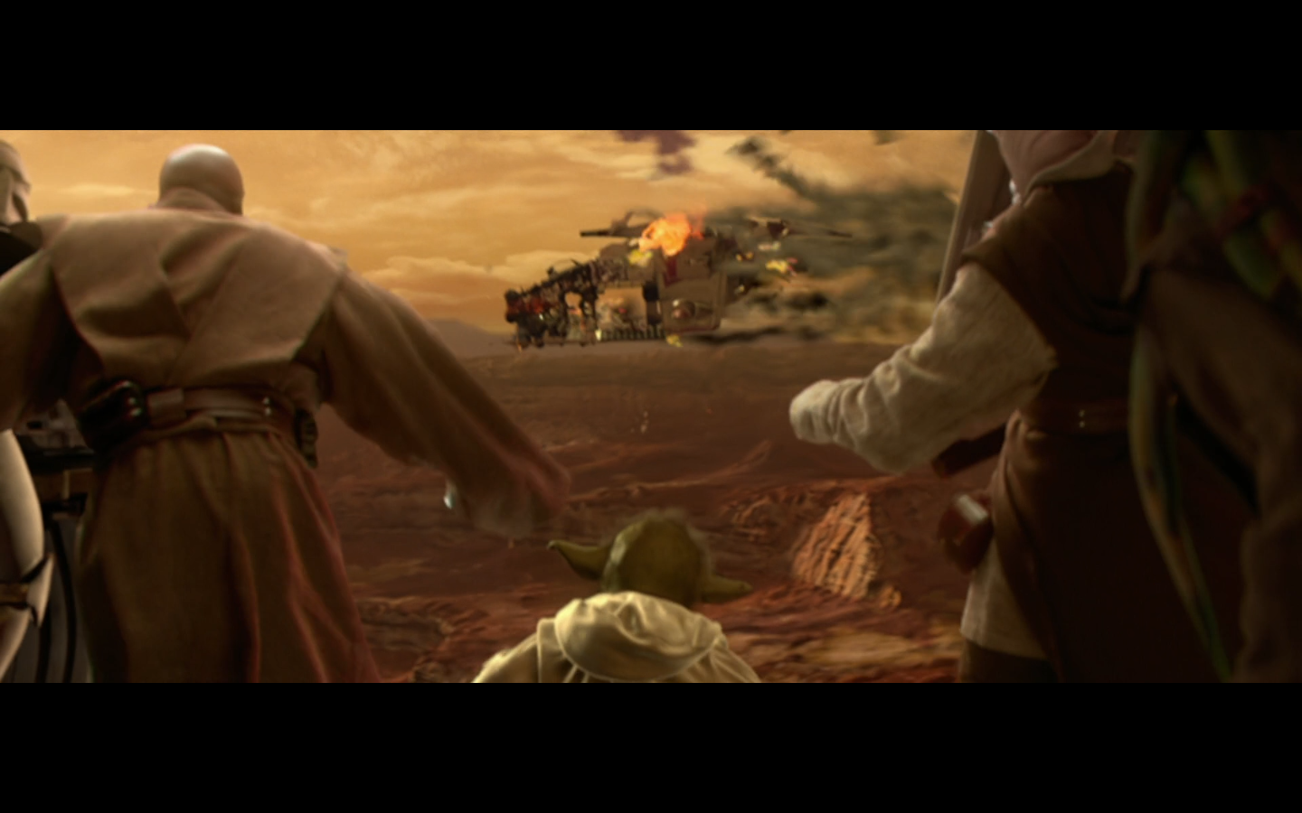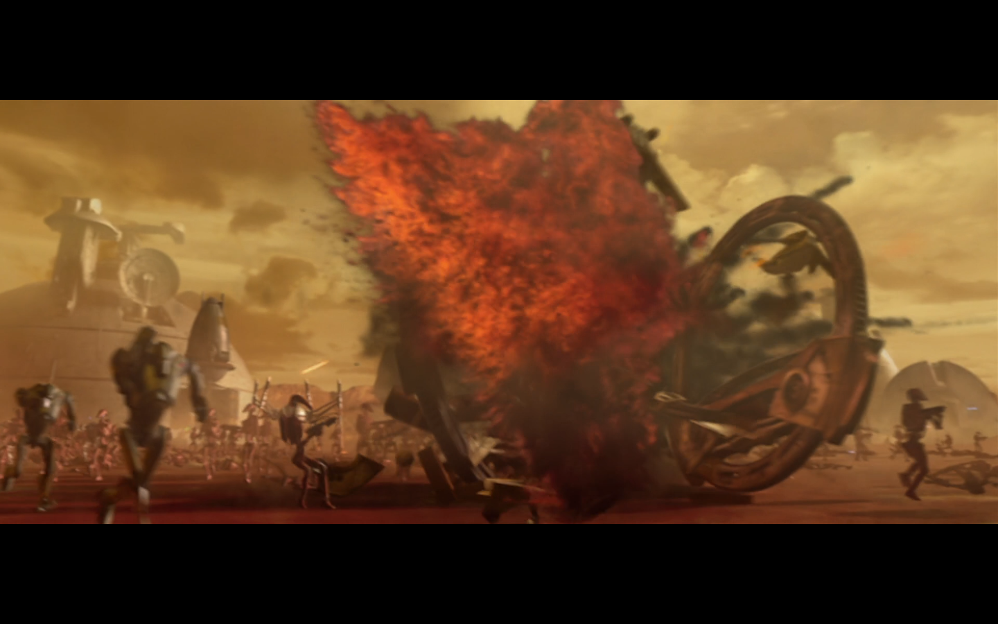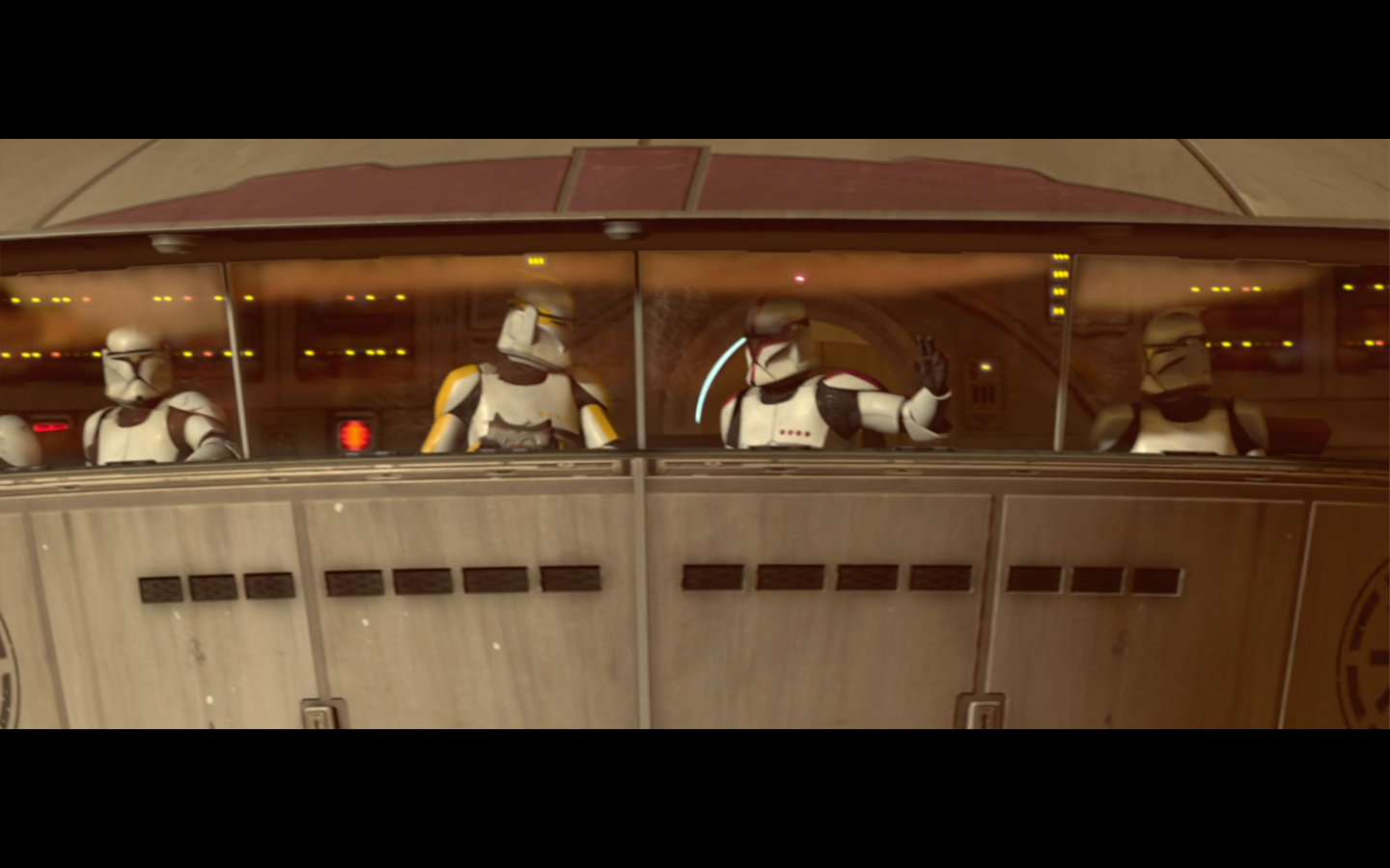 What’s with the camcorder sort of handheld feel to the reaction shots? It happened a few times already when cutting back to a ship flying quickly through the battle, like it was out of focus for a second and the shot was shaky. Now we get it as it cuts back to the clone troopers watching the starship fall.