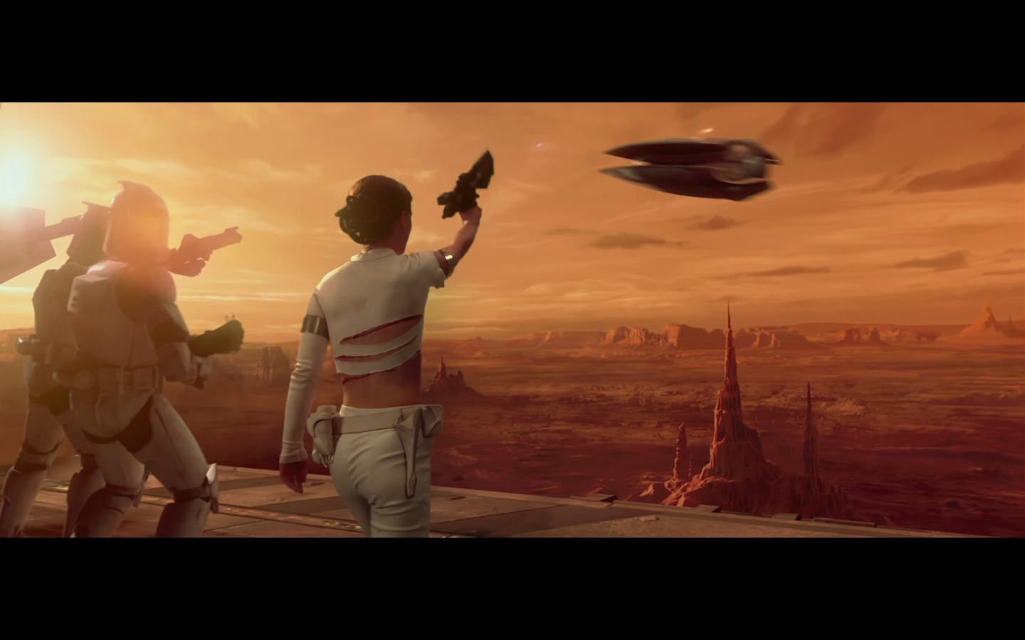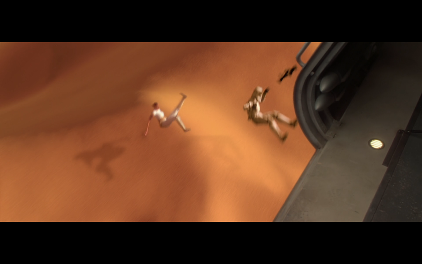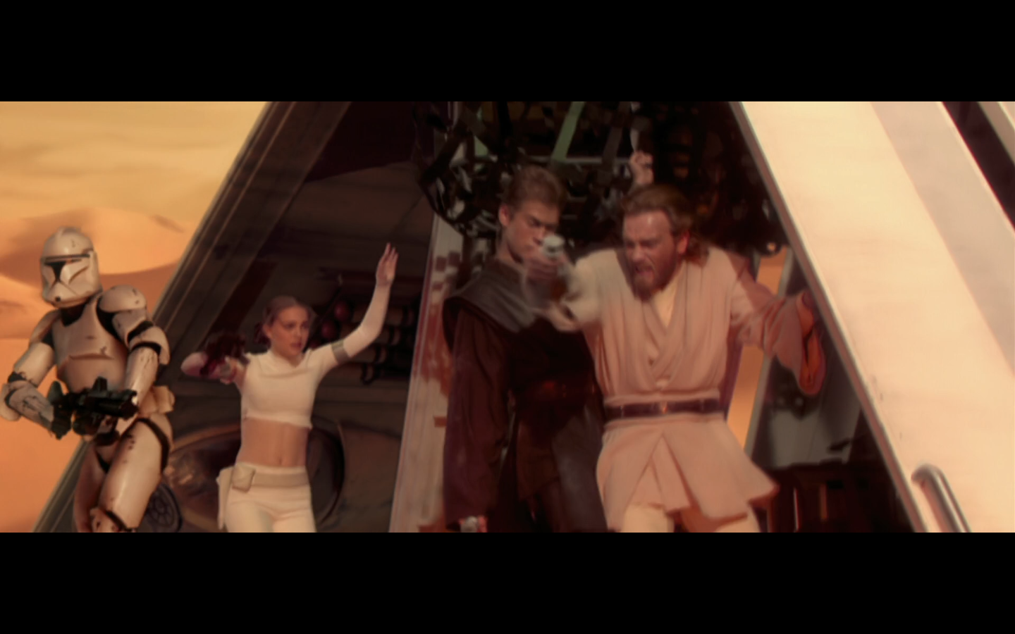 So Dooku escapes, in a moment that’s supposed to remind you of Leia firing at a departing Slave I. The difference is that in that case, she was emotional about the loss of the man she loved. Here, it’s Padme firing at some dude who’s doing….something.