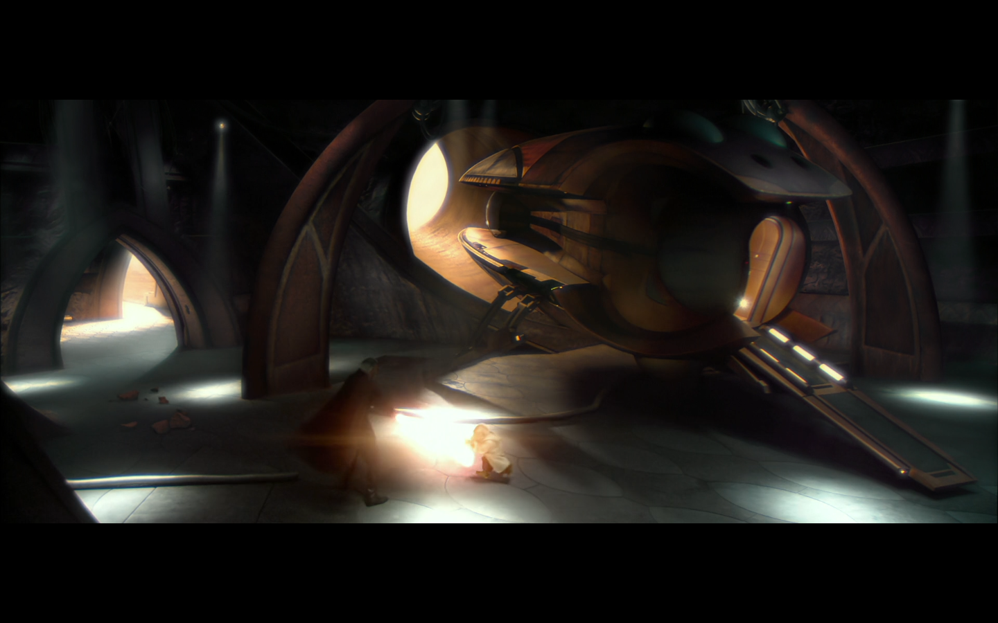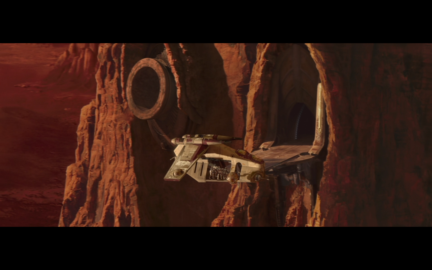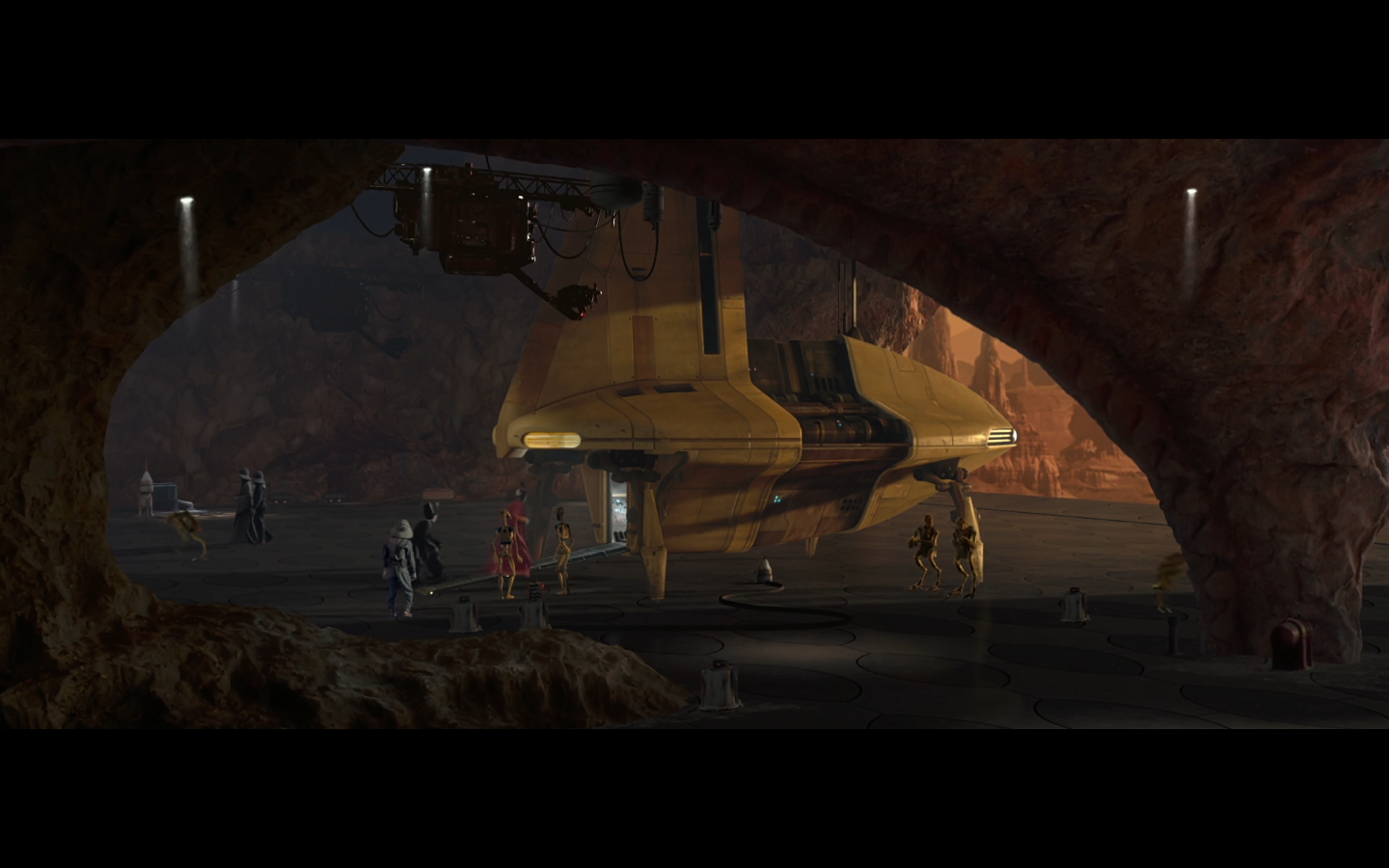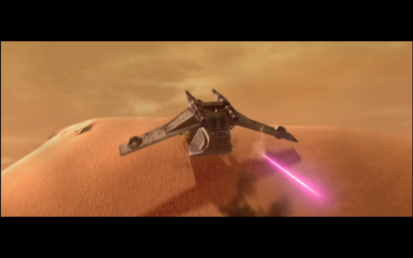 So Dooku escapes, in a moment that’s supposed to remind you of Leia firing at a departing Slave I. The difference is that in that case, she was emotional about the loss of the man she loved. Here, it’s Padme firing at some dude who’s doing….something.