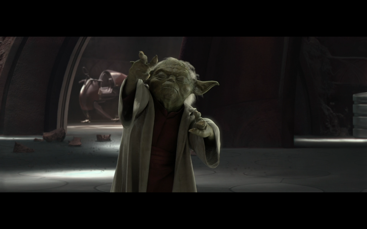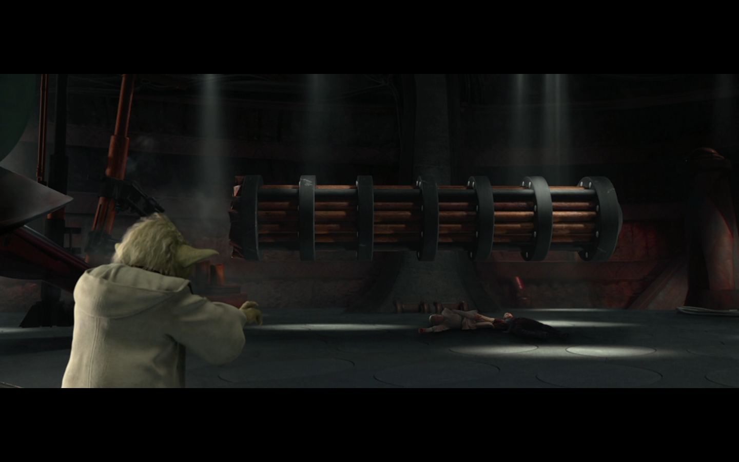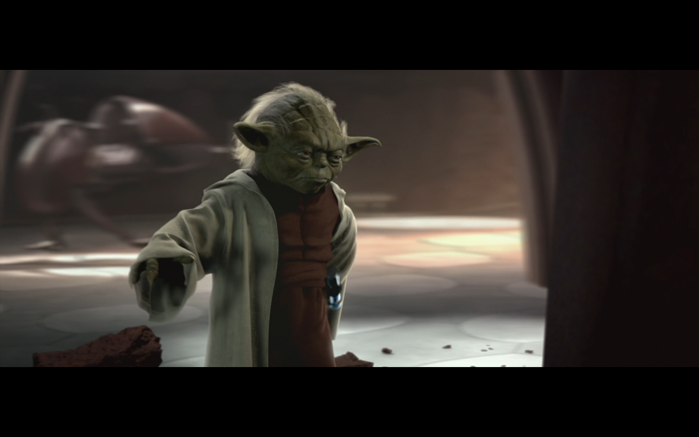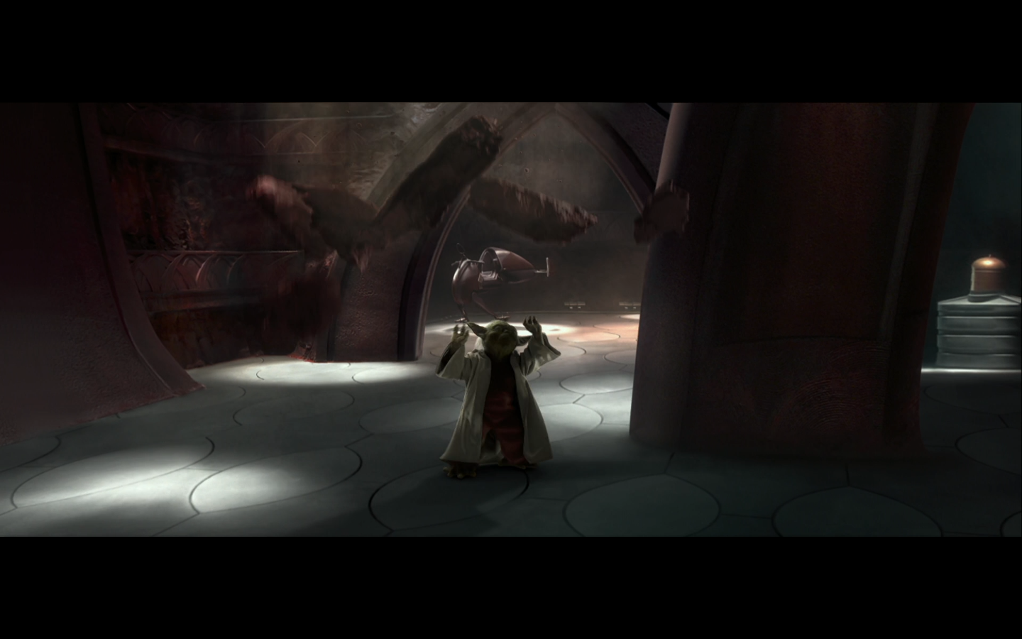 I’m fine with Dooku having to get away, and I’m cool with them using Anakin and Obi Wan as the excuse for Yoda to be distracted. But did you notice how Yoda was pushing with all his might, and Dooku just needed one hand to hold him off, using the other to drop the thing on them? This is nothing more than a physical contest. I’m sorry, but I hate it and I want something better. I want to stress this so it’s clear to anyone who may take issue with my complaints: when you have a weak story that doesn’t afford even the most important characters much personality or uniqueness, they should at least be differentiated by their mode of action. It’s one thing that in these prequels, characters like Yoda and Mace Windu have all the variety and excitement of an oatmeal cookbook, but you need to give them some external qualities or abilities that act as identifying features. At this point, the description, “Pretty boring and fights with a lightsaber” applies to about 5 different major characters.