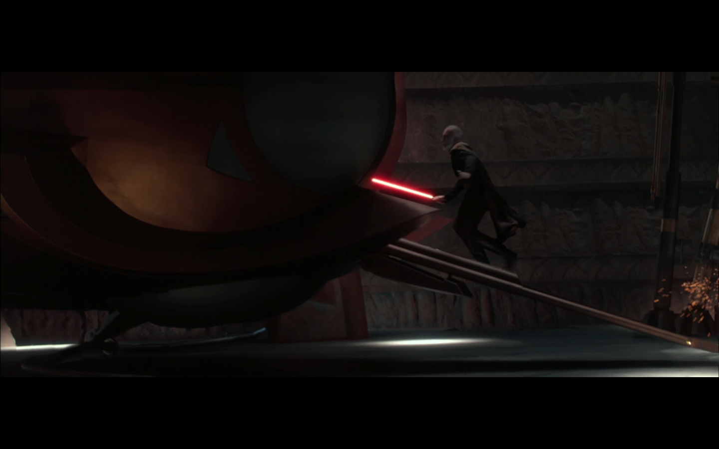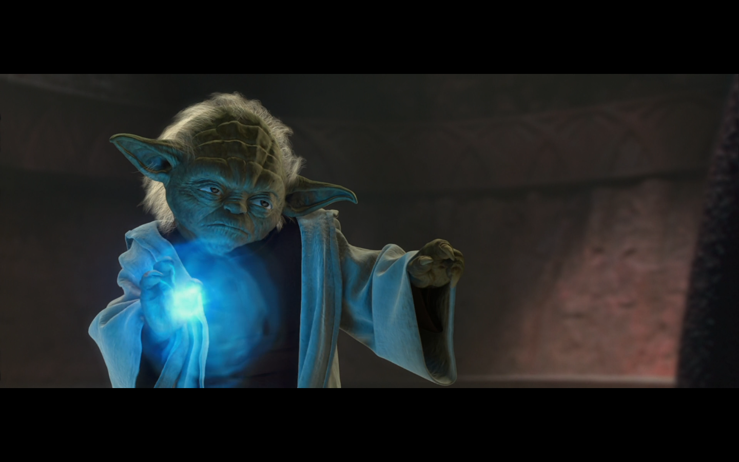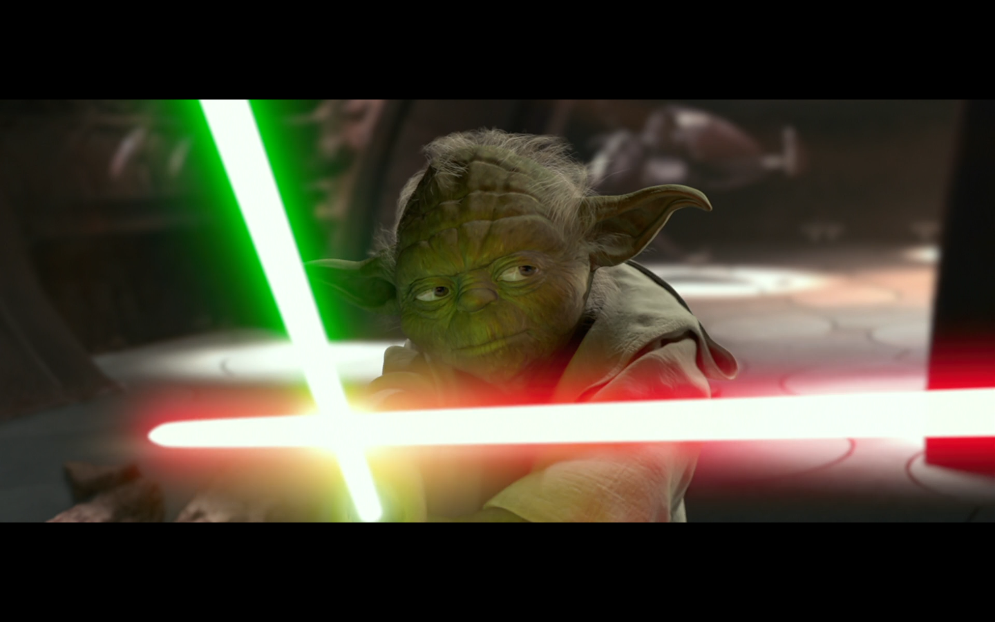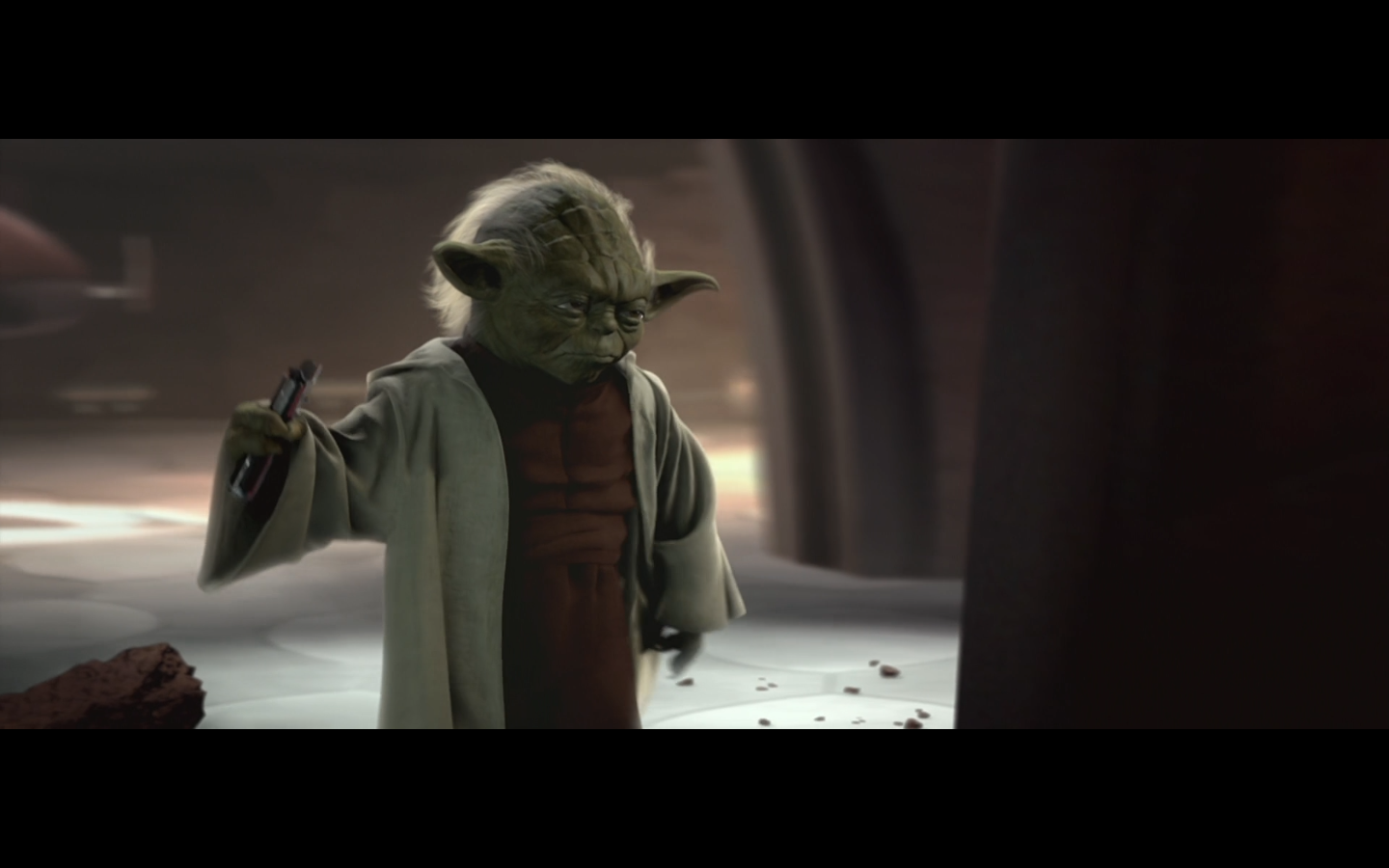 I’m fine with Dooku having to get away, and I’m cool with them using Anakin and Obi Wan as the excuse for Yoda to be distracted. But did you notice how Yoda was pushing with all his might, and Dooku just needed one hand to hold him off, using the other to drop the thing on them? This is nothing more than a physical contest. I’m sorry, but I hate it and I want something better. I want to stress this so it’s clear to anyone who may take issue with my complaints: when you have a weak story that doesn’t afford even the most important characters much personality or uniqueness, they should at least be differentiated by their mode of action. It’s one thing that in these prequels, characters like Yoda and Mace Windu have all the variety and excitement of an oatmeal cookbook, but you need to give them some external qualities or abilities that act as identifying features. At this point, the description, “Pretty boring and fights with a lightsaber” applies to about 5 different major characters.