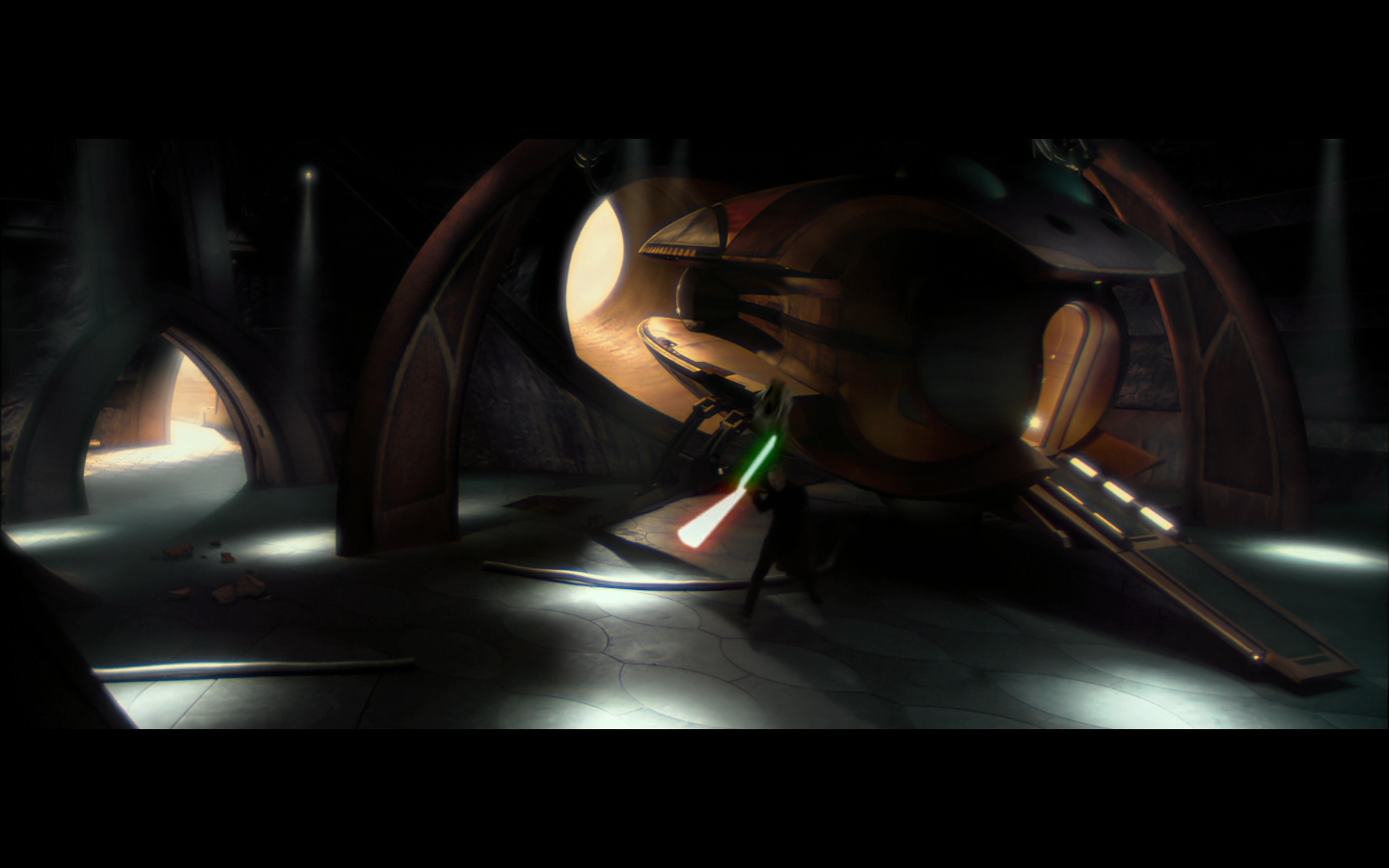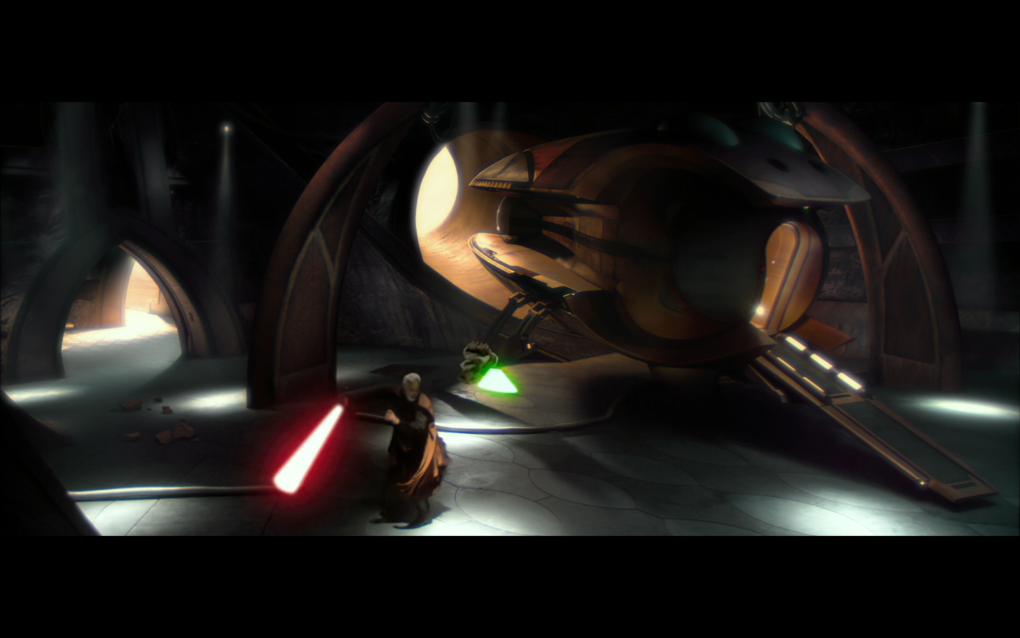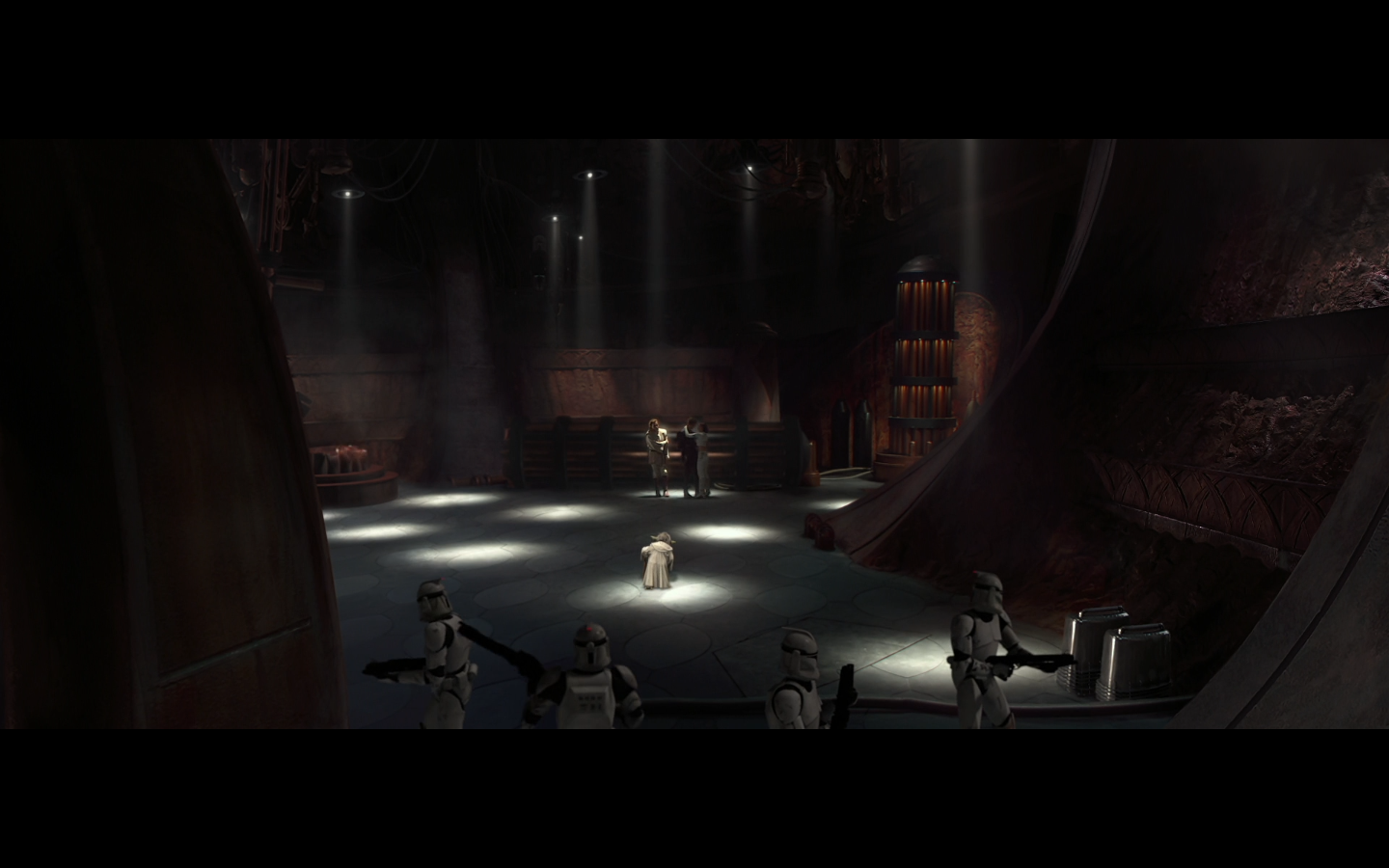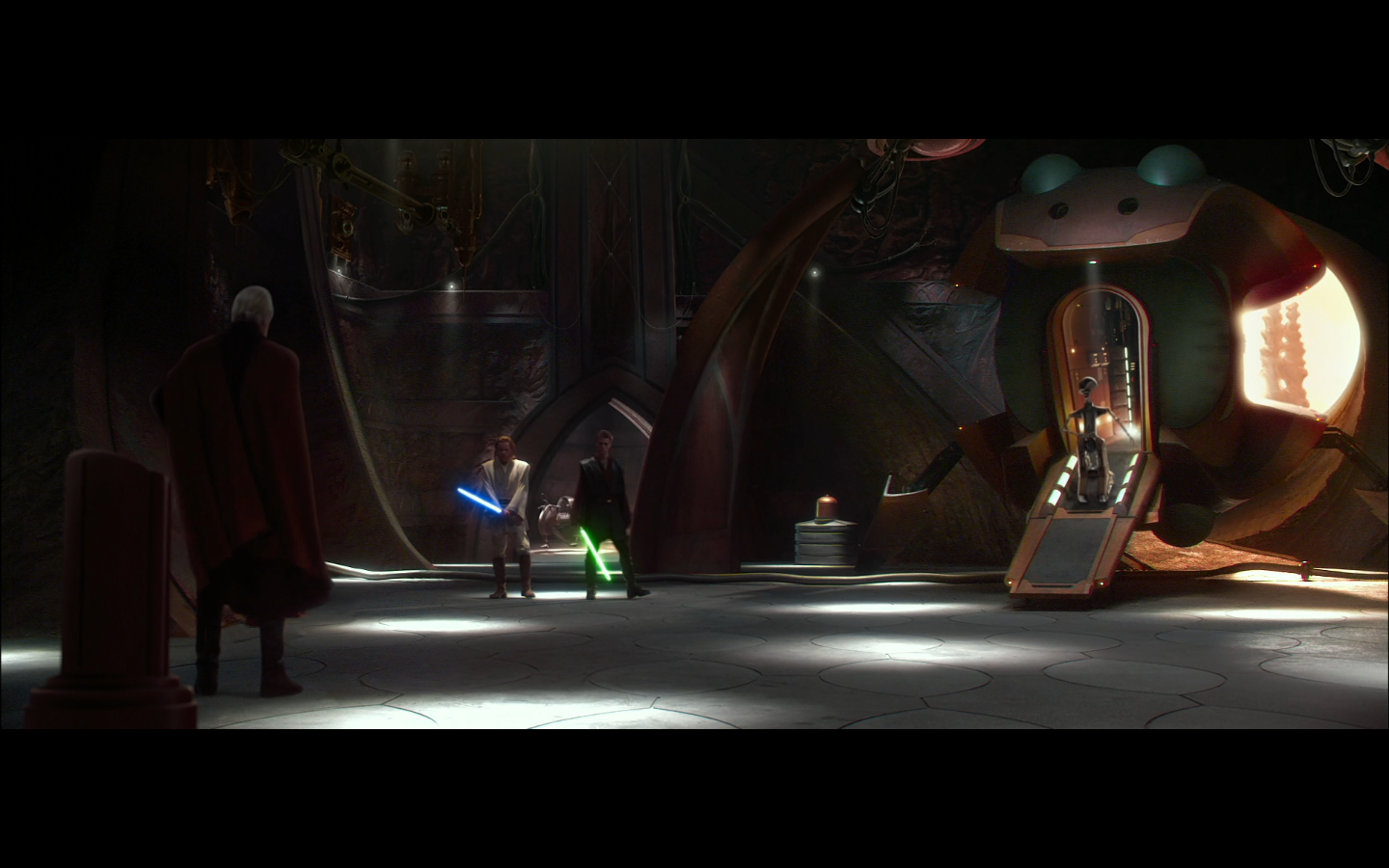 I’m fine with Dooku having to get away, and I’m cool with them using Anakin and Obi Wan as the excuse for Yoda to be distracted. But did you notice how Yoda was pushing with all his might, and Dooku just needed one hand to hold him off, using the other to drop the thing on them? This is nothing more than a physical contest. I’m sorry, but I hate it and I want something better. I want to stress this so it’s clear to anyone who may take issue with my complaints: when you have a weak story that doesn’t afford even the most important characters much personality or uniqueness, they should at least be differentiated by their mode of action. It’s one thing that in these prequels, characters like Yoda and Mace Windu have all the variety and excitement of an oatmeal cookbook, but you need to give them some external qualities or abilities that act as identifying features. At this point, the description, “Pretty boring and fights with a lightsaber” applies to about 5 different major characters.