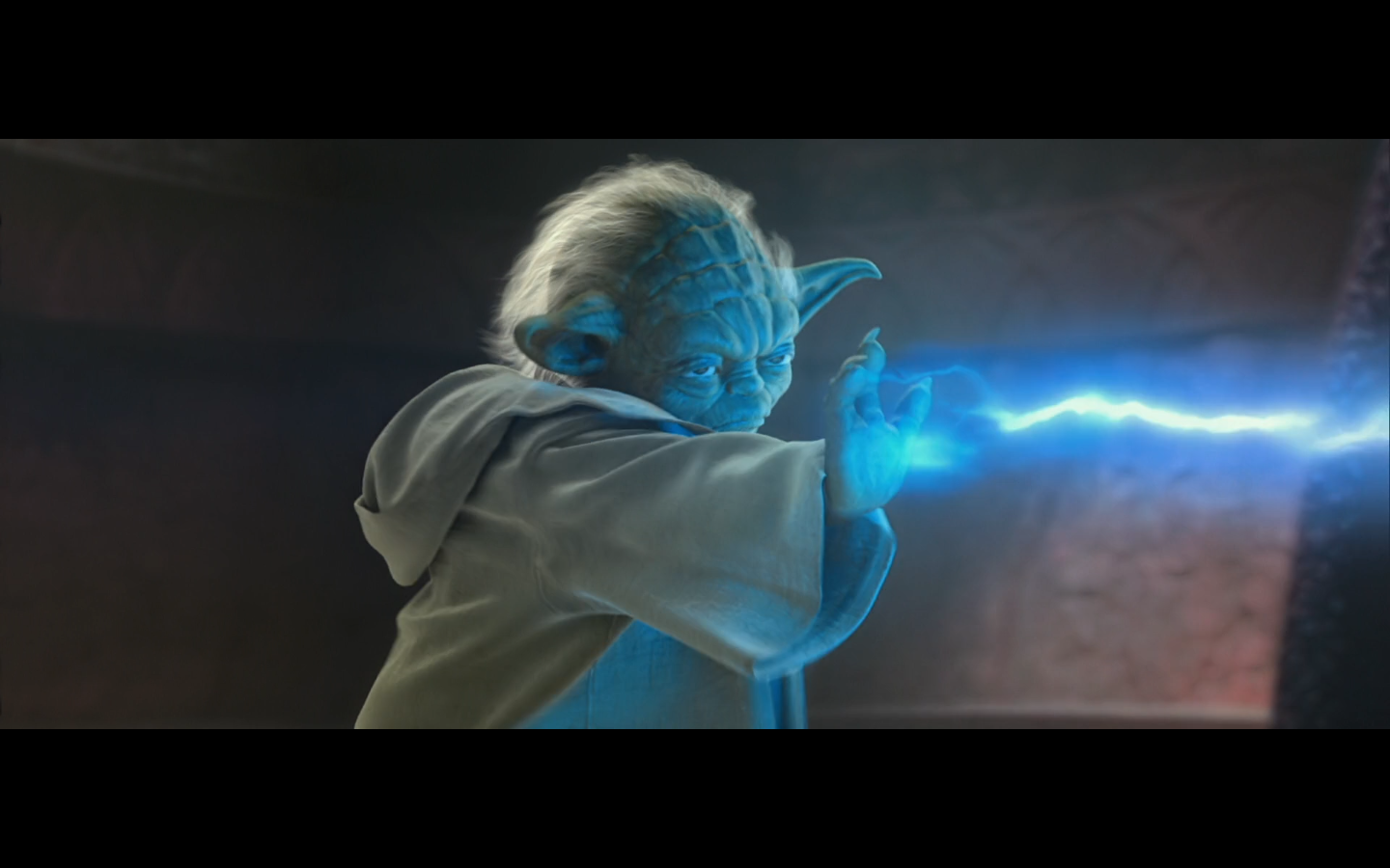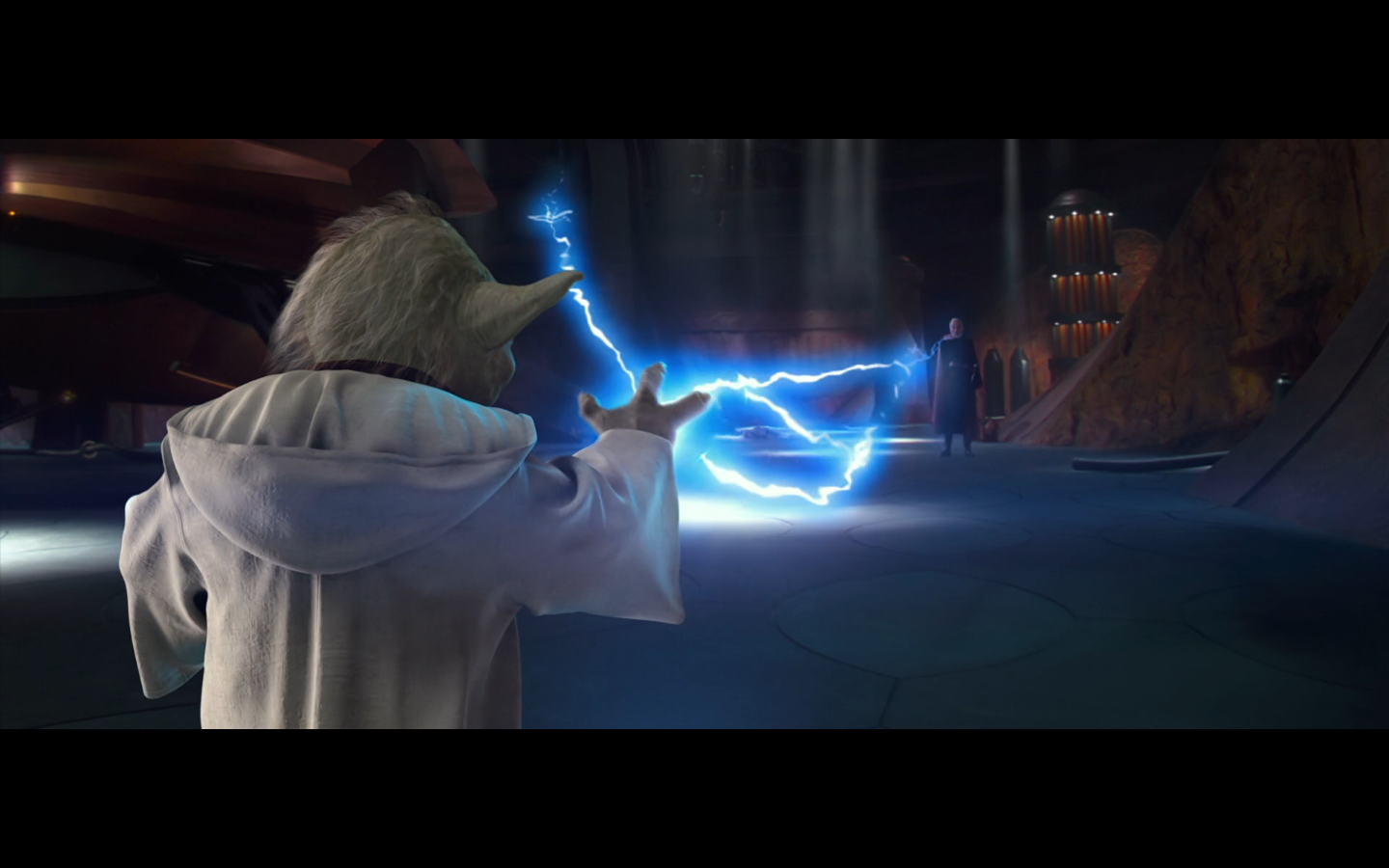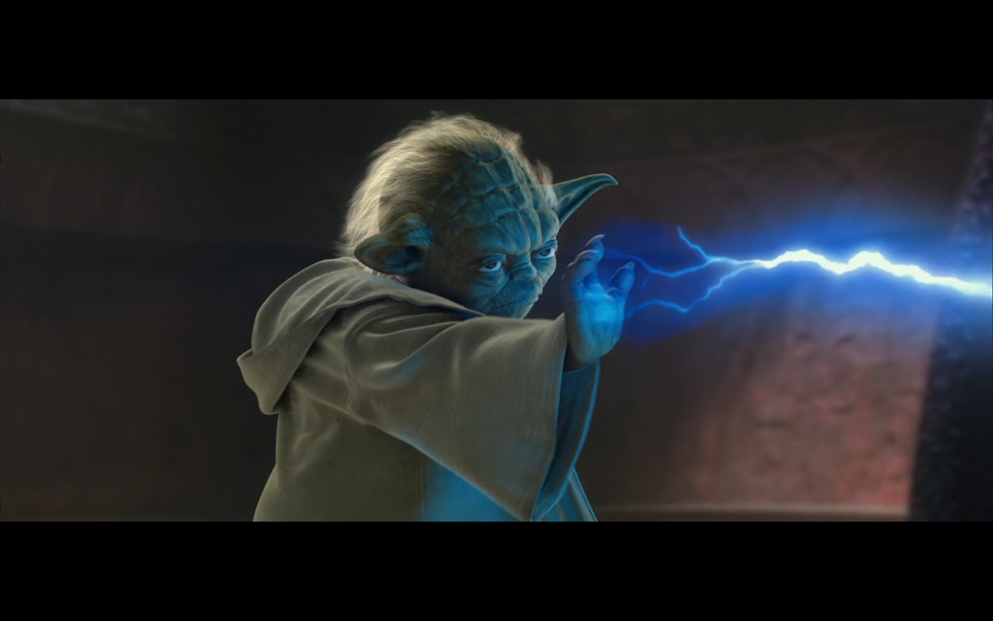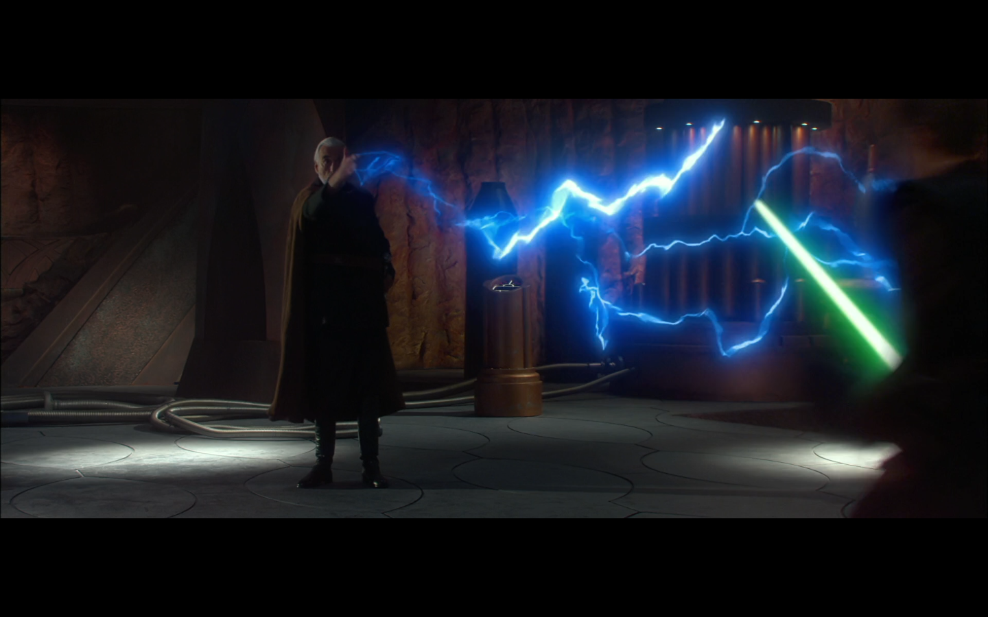 Actually, this is a technique called Tutaminis. It allows the user to take in energy or deflect it back. Yoda and Obi Wan, for instance, are good enough at this that they can take blaster shots into their hand without damage. Yoda does the same thing with the Force Lightning. Supposedly, this is what Vader does with Han Solo’s blaster shot on Cloud City, too. So it was a Force thing. But I think that’s awesome. Only badasses can begin to use this really well, but when you do, you just handle everything they got and say, “Oh, is that all?”