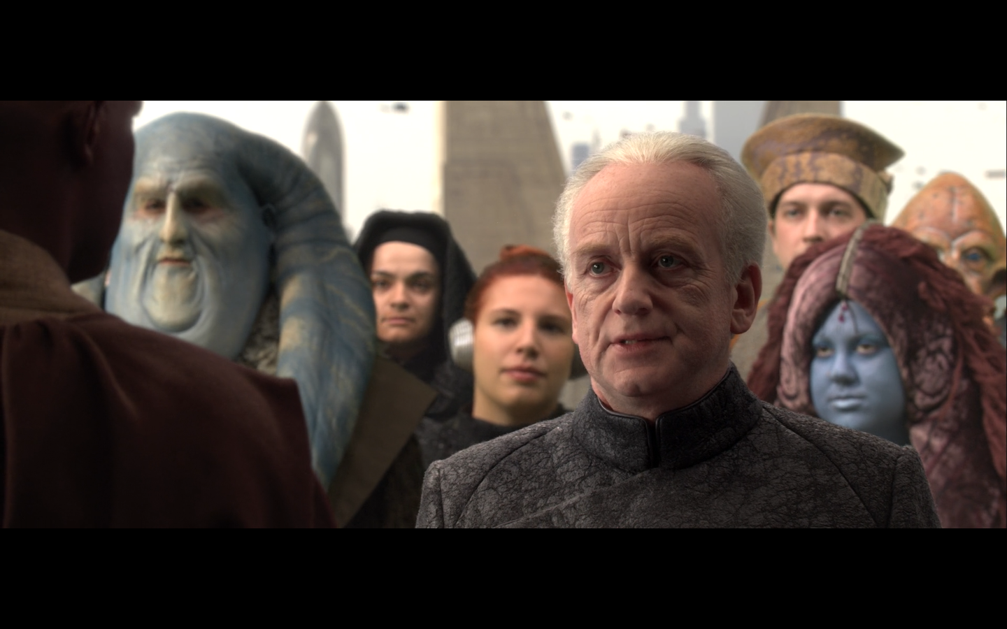 Look at this purple-haired, blue frat mattress over Palpatine’s left shoulder! Hah!