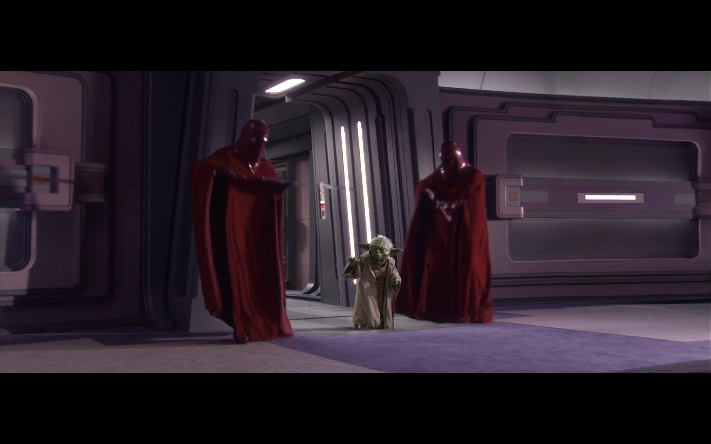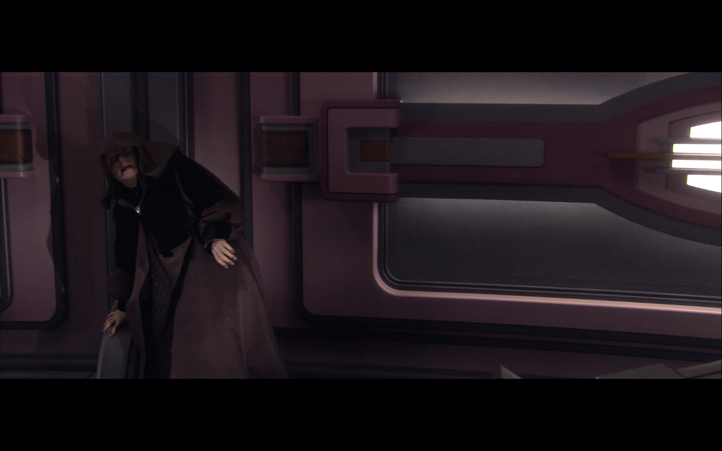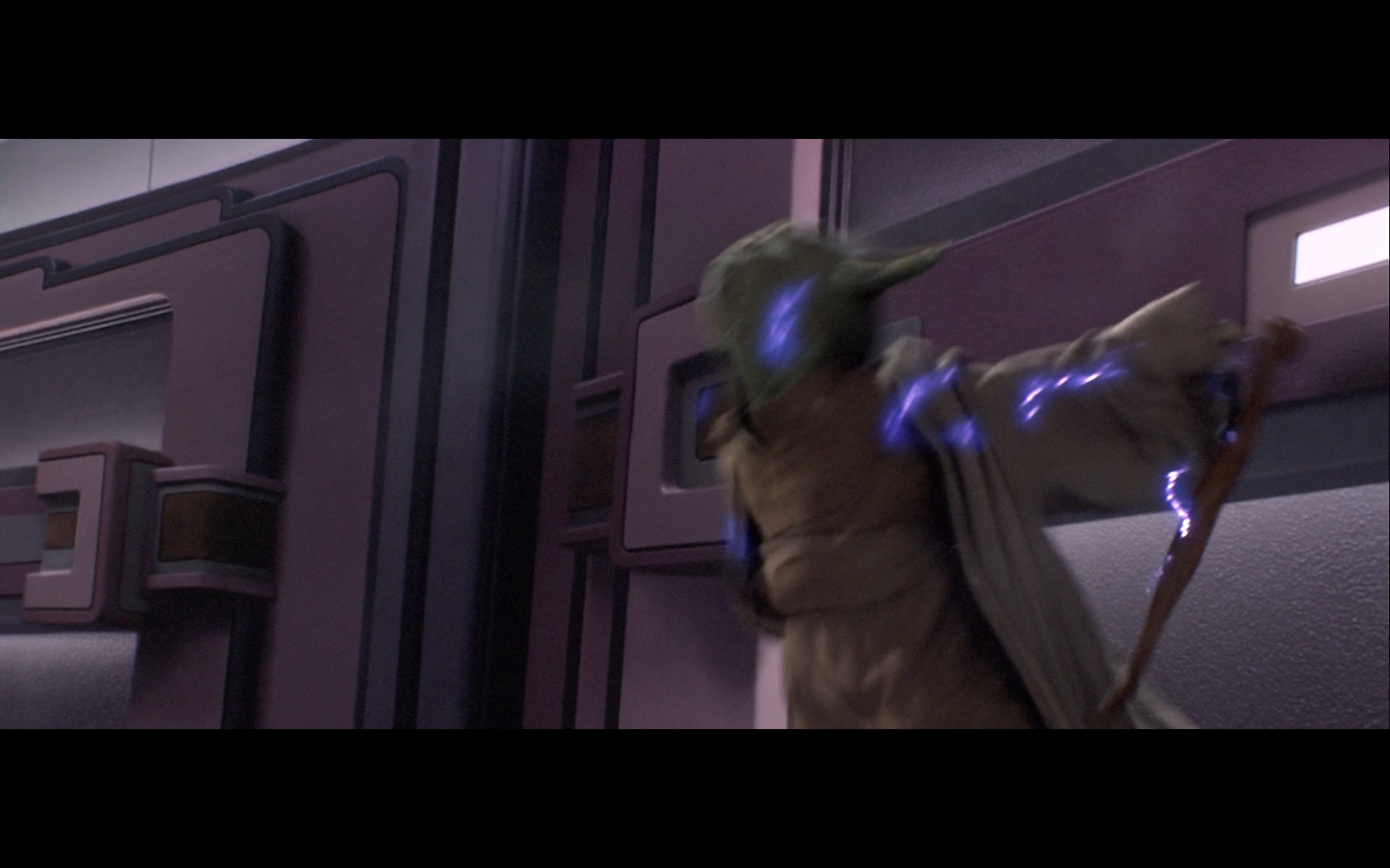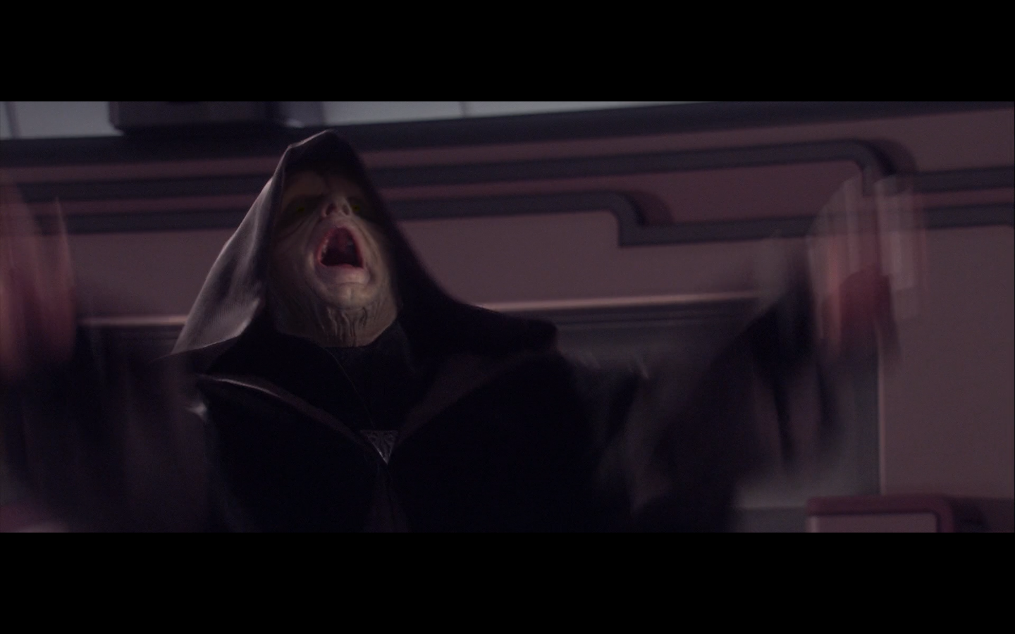 Aw, you had to cut back to Anakin in the room killing people. You just HAD to. You couldn’t leave it with the doors being closed, could you? Goddamn it, Lucas. Showing restraint and then doing something is just as bad as just doing it.