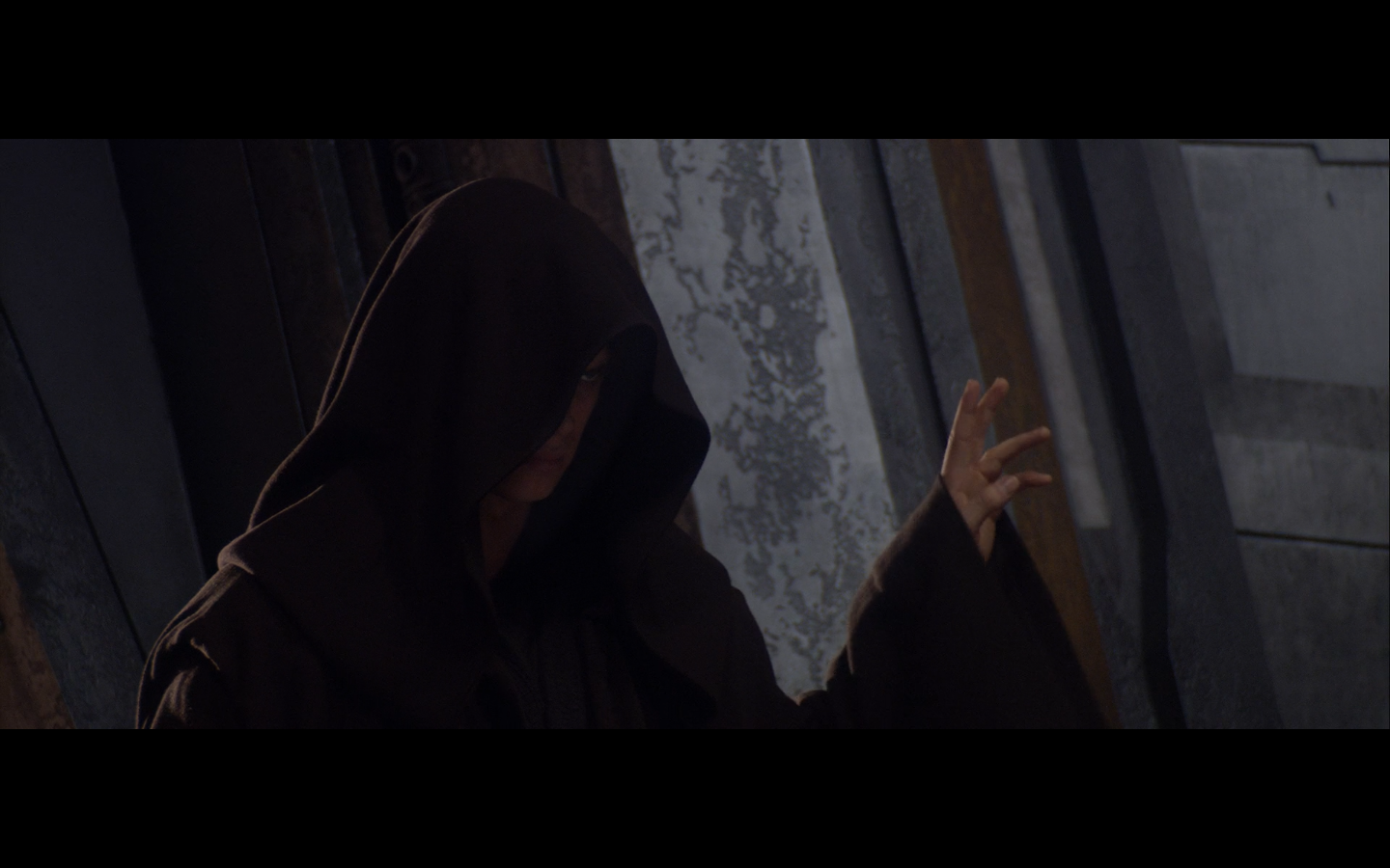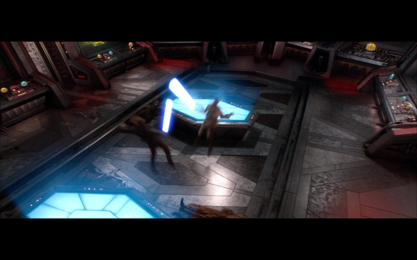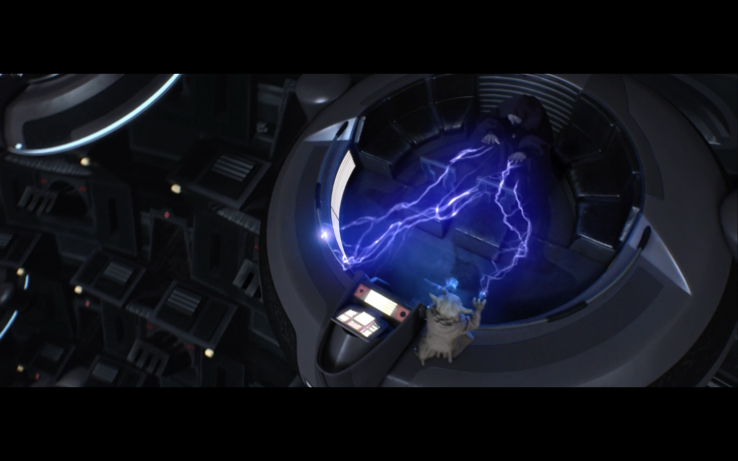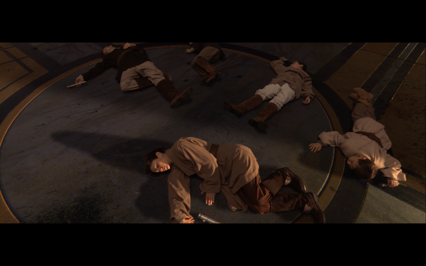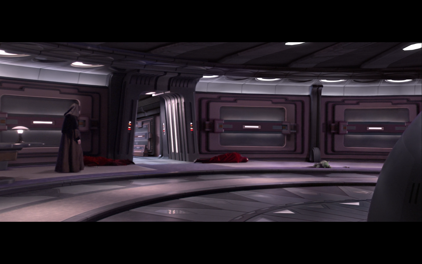 Aw, you had to cut back to Anakin in the room killing people. You just HAD to. You couldn’t leave it with the doors being closed, could you? Goddamn it, Lucas. Showing restraint and then doing something is just as bad as just doing it.