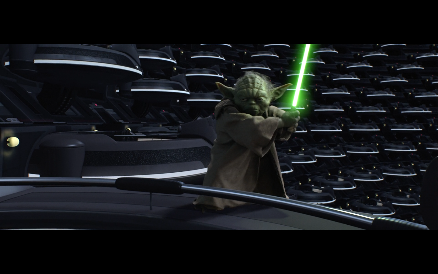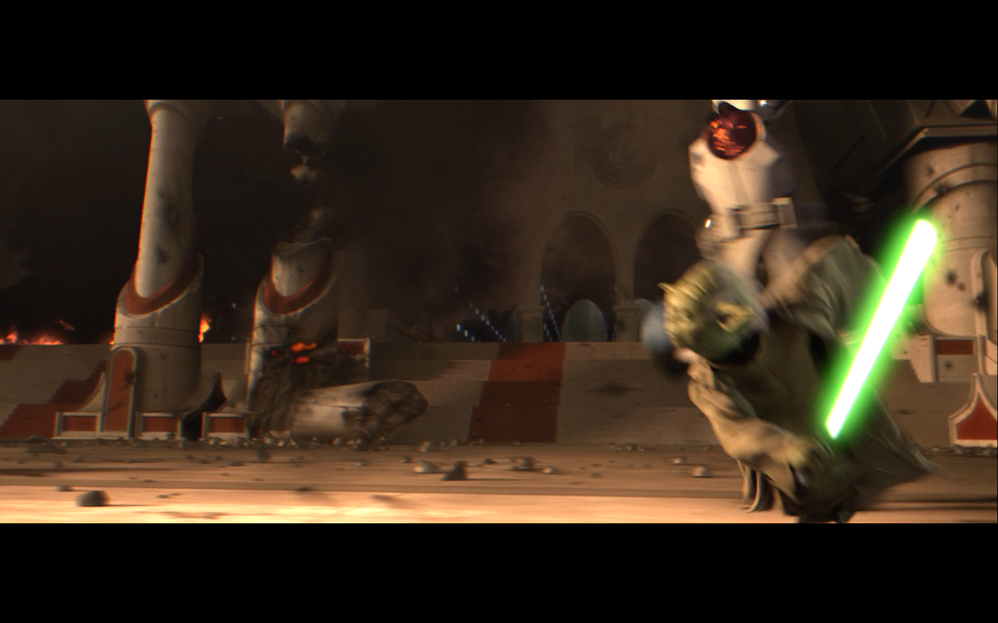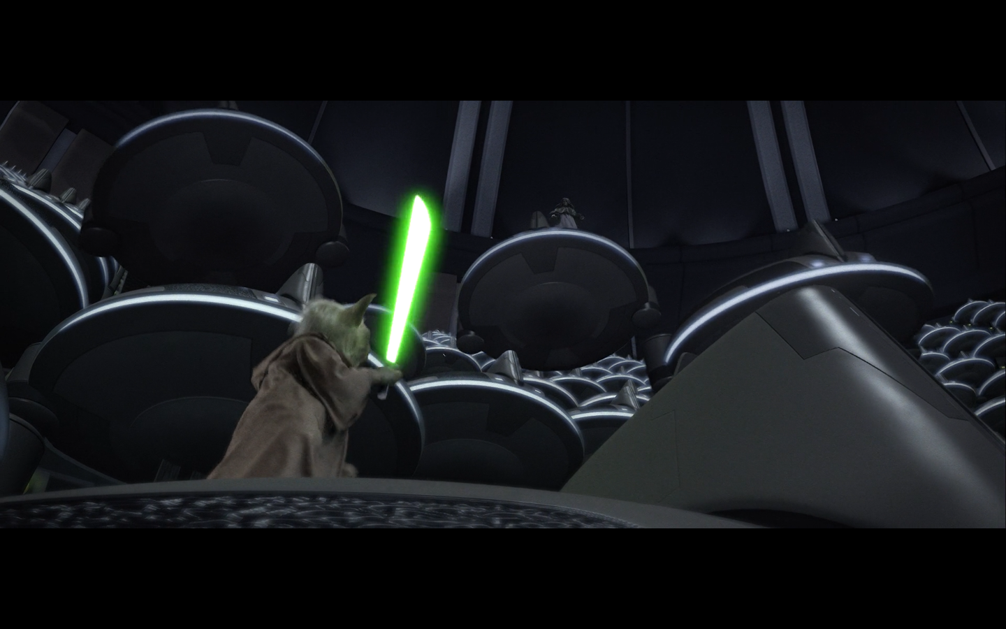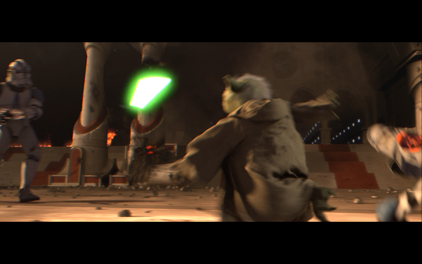 Okay, I know I complained about a lot of the theatrical lightsaber shit and then only liked the Palpatine spin jump because it was Palpatine, but I genuinely dig the throwing of the lightsaber. It’s something pretty new, and it works for Yoda. The only way to make this cooler is to have him pull it out of the clone trooper with the Force as he keeps moving.
