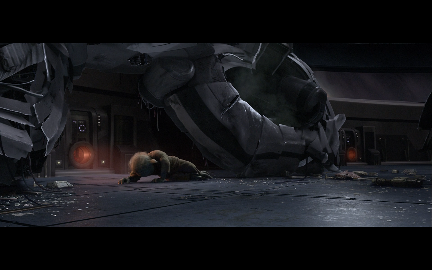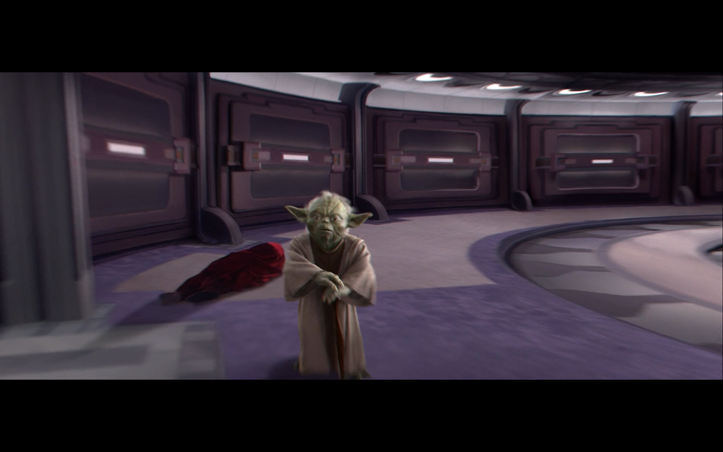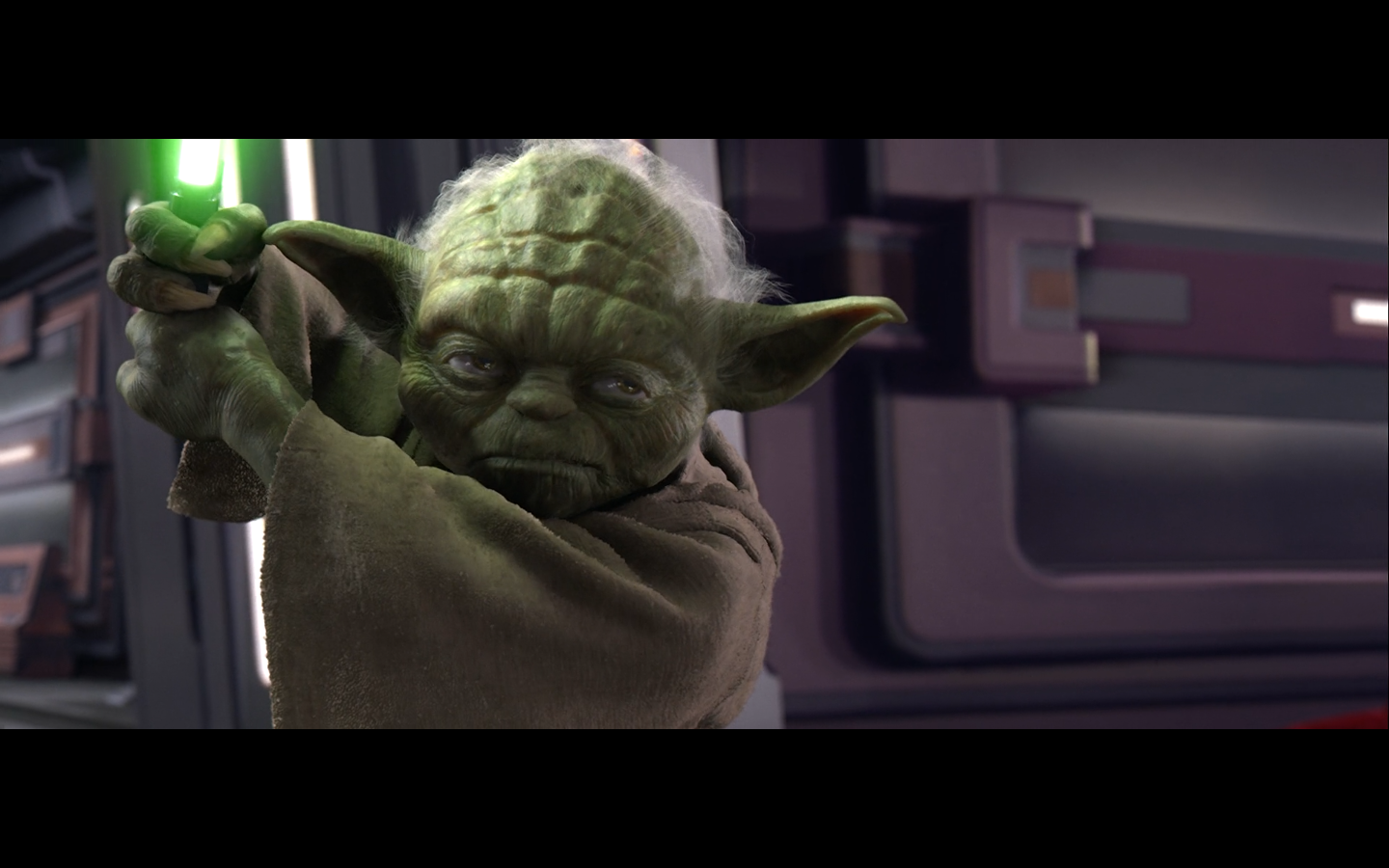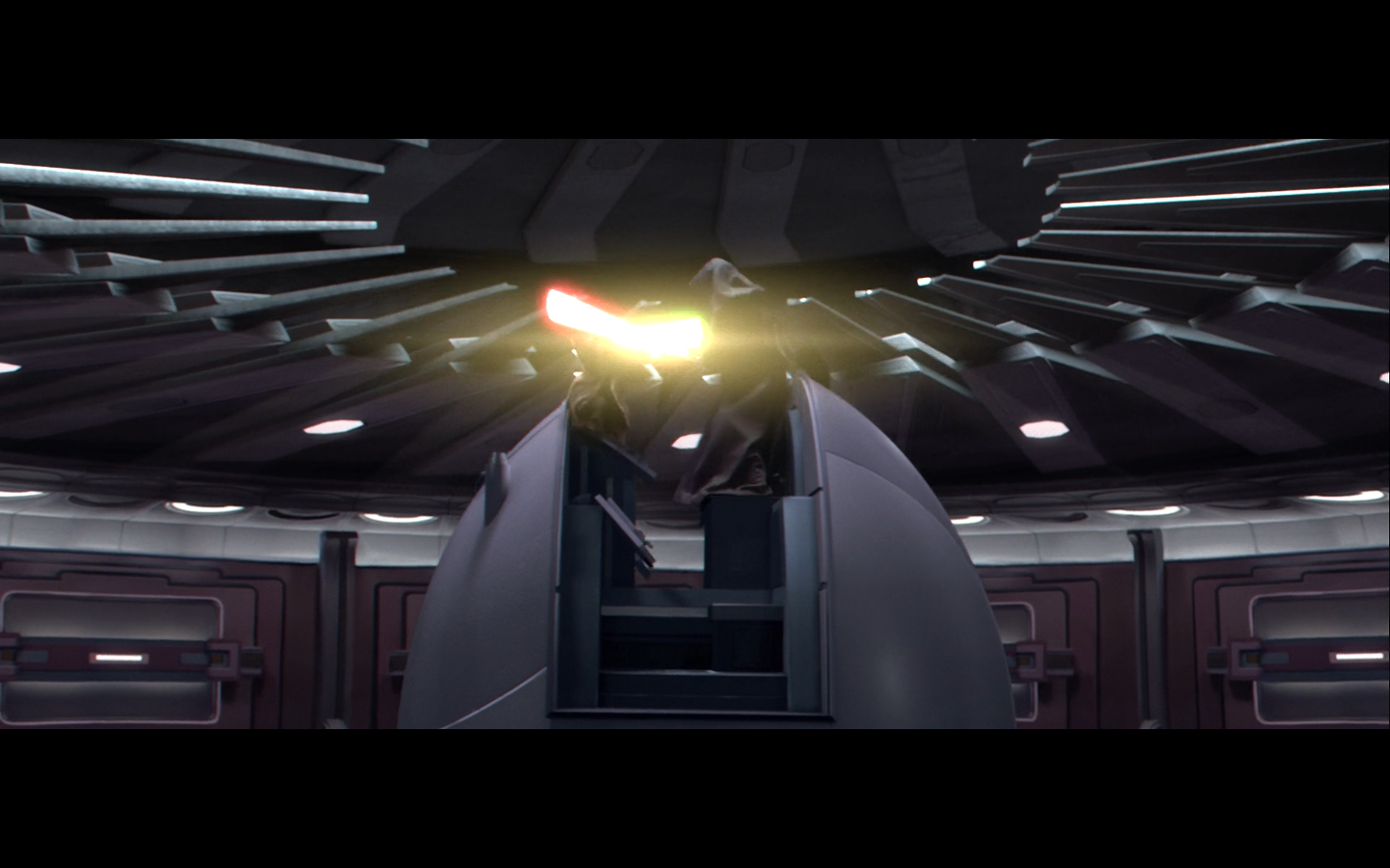 Okay, I know I complained about a lot of the theatrical lightsaber shit and then only liked the Palpatine spin jump because it was Palpatine, but I genuinely dig the throwing of the lightsaber. It’s something pretty new, and it works for Yoda. The only way to make this cooler is to have him pull it out of the clone trooper with the Force as he keeps moving.