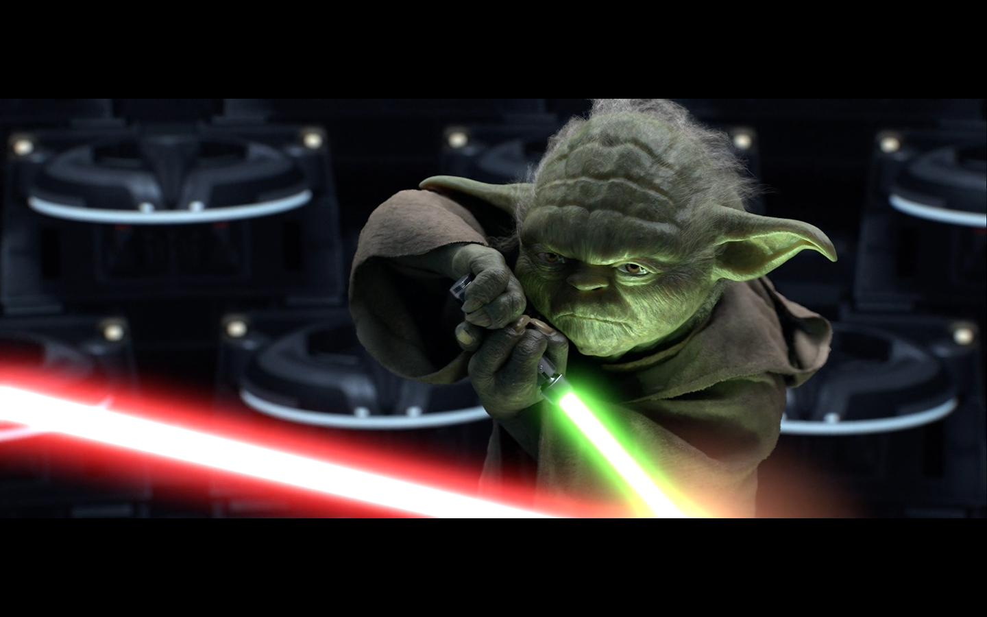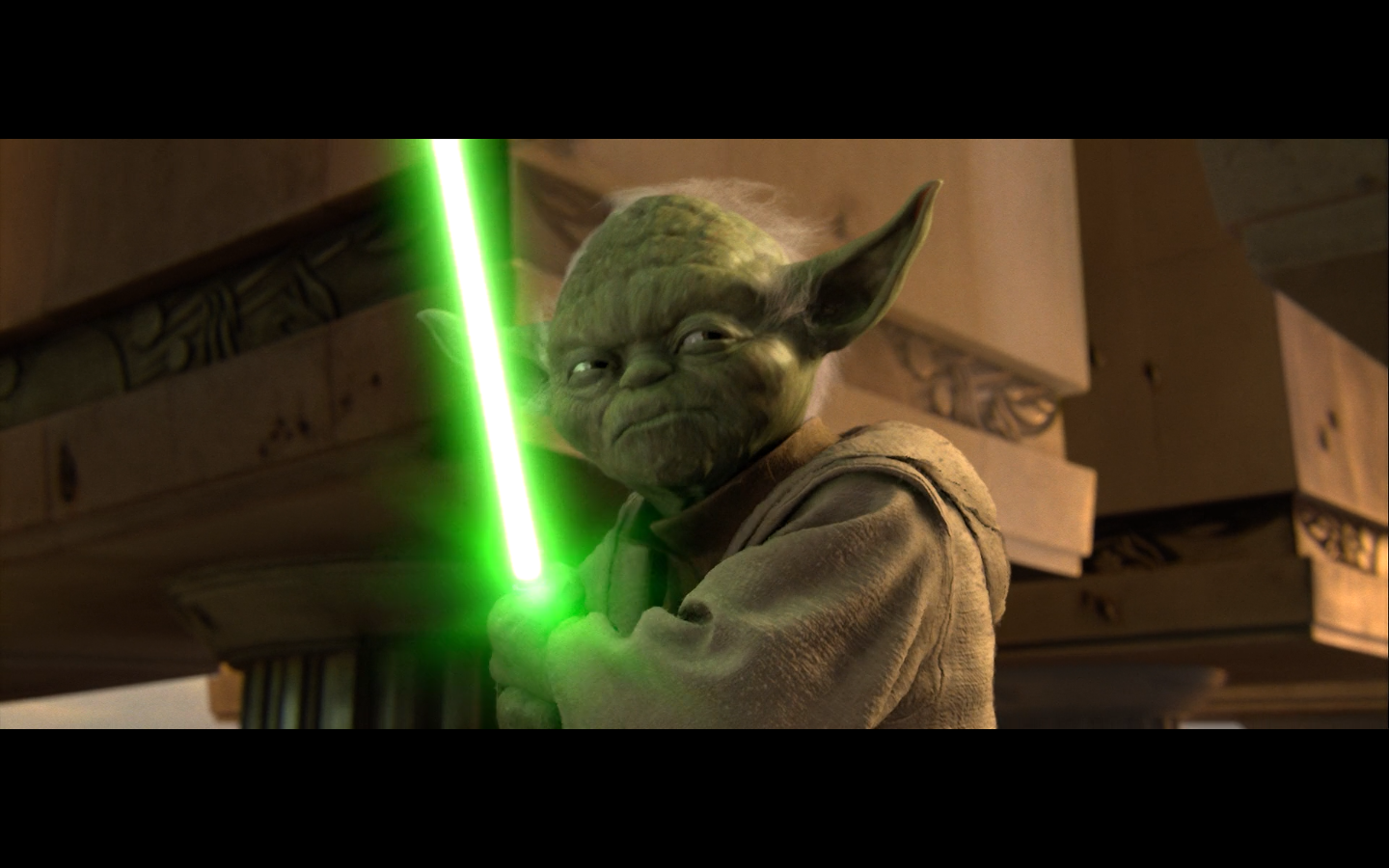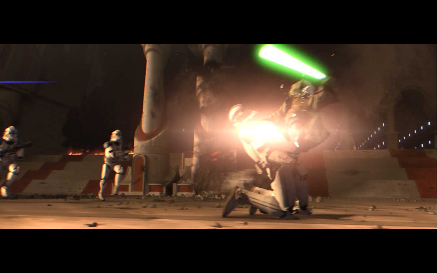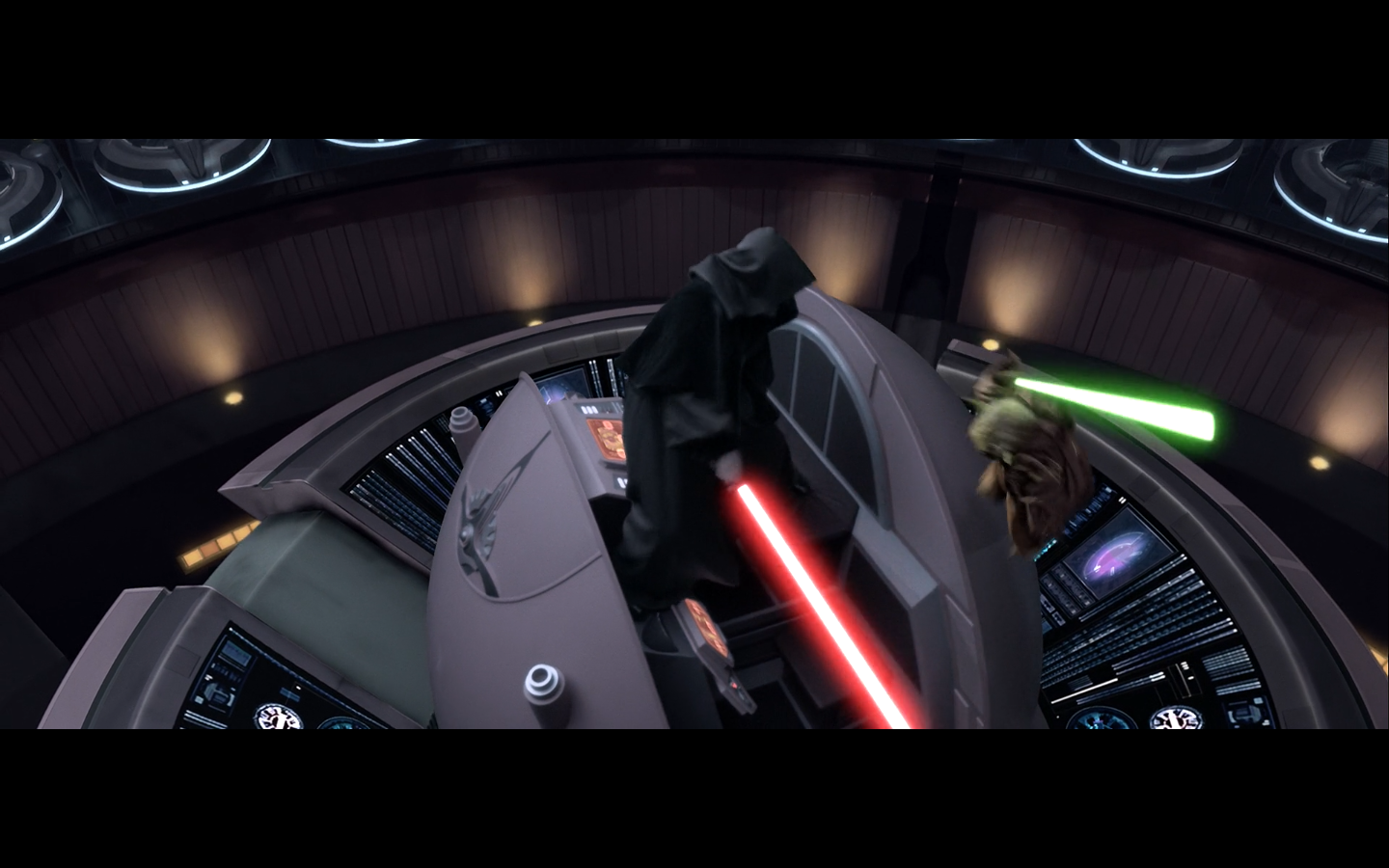 Okay, I know I complained about a lot of the theatrical lightsaber shit and then only liked the Palpatine spin jump because it was Palpatine, but I genuinely dig the throwing of the lightsaber. It’s something pretty new, and it works for Yoda. The only way to make this cooler is to have him pull it out of the clone trooper with the Force as he keeps moving.
