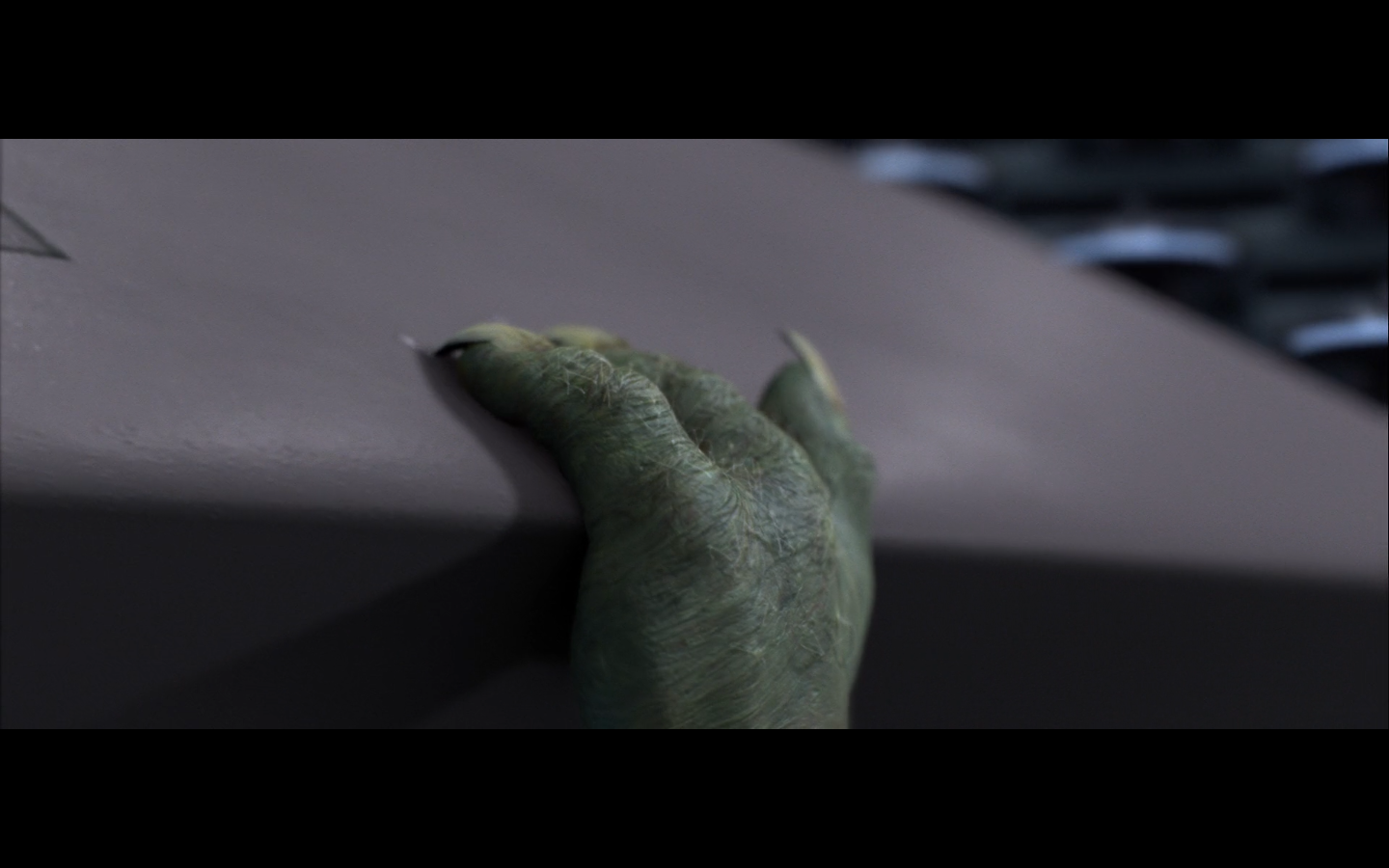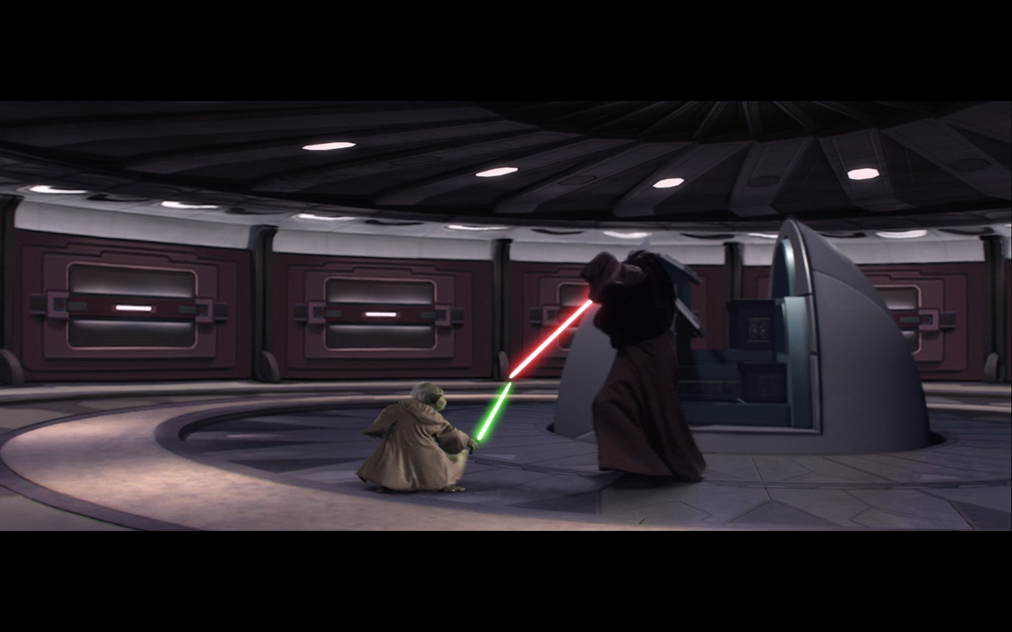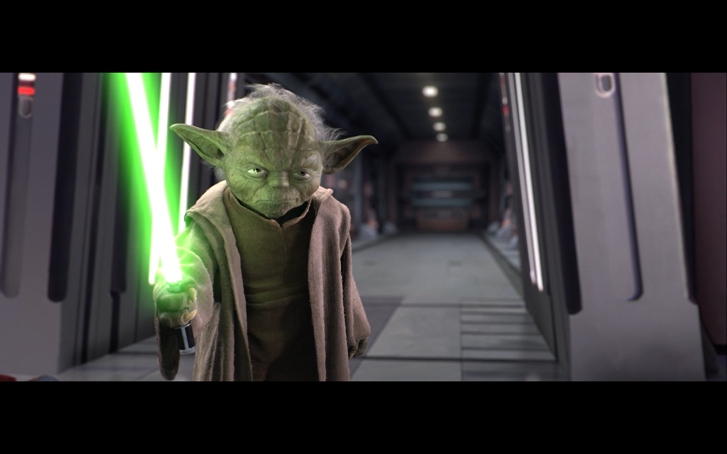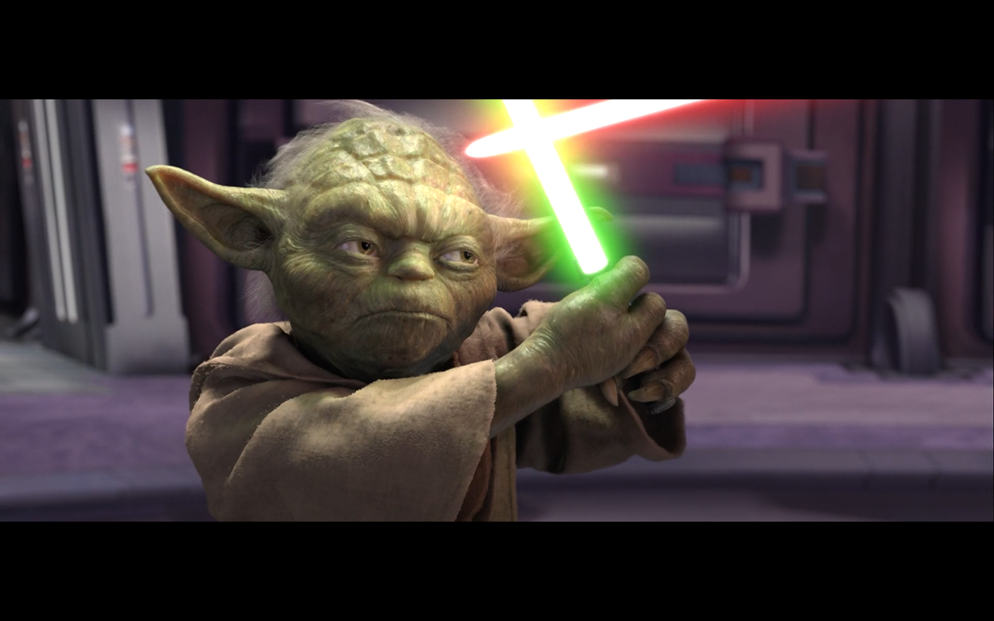 Okay, I know I complained about a lot of the theatrical lightsaber shit and then only liked the Palpatine spin jump because it was Palpatine, but I genuinely dig the throwing of the lightsaber. It’s something pretty new, and it works for Yoda. The only way to make this cooler is to have him pull it out of the clone trooper with the Force as he keeps moving.