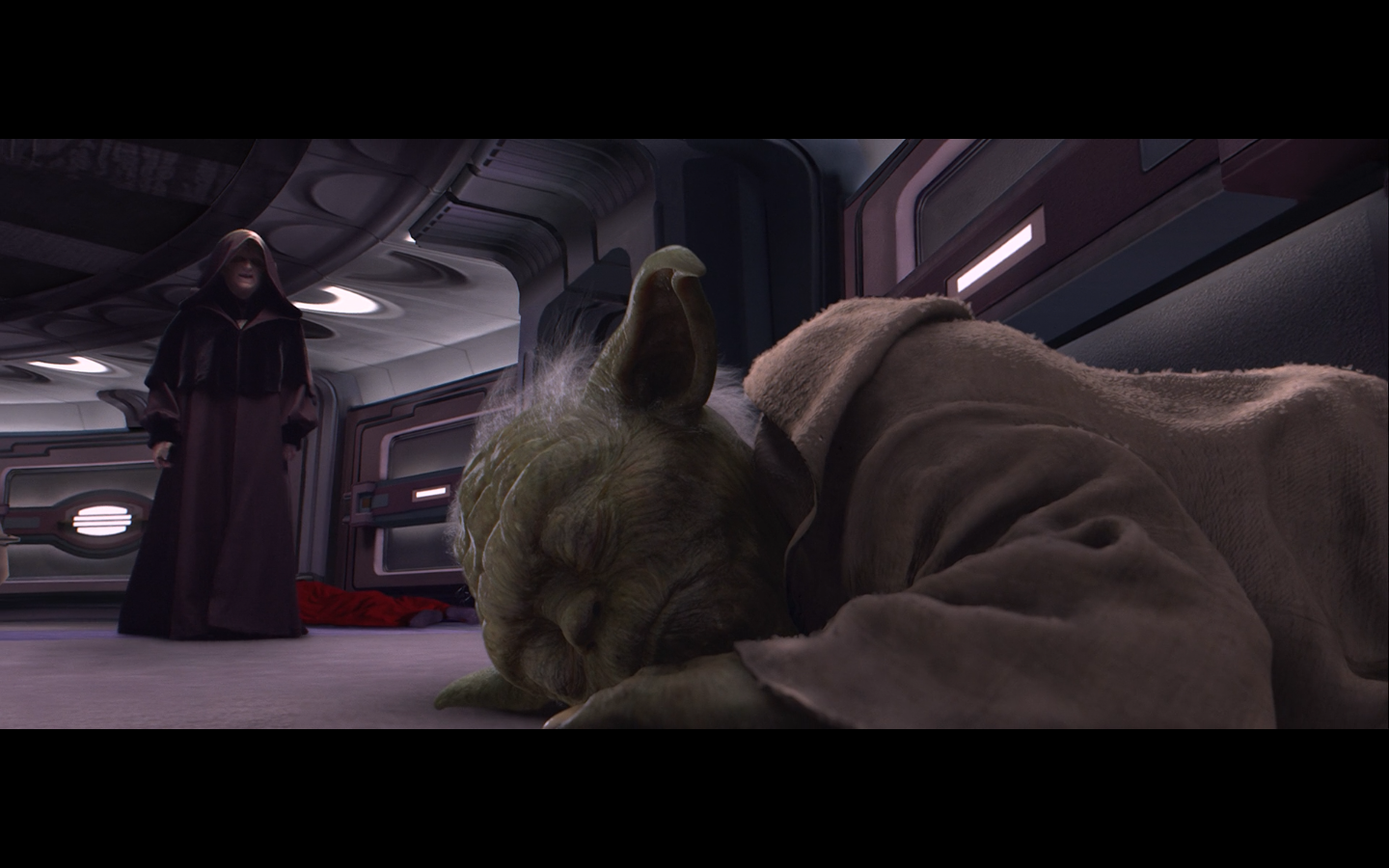 Why…does she still look pregnant? Oh, turns out Yoda had them make her look pregnant again (Bonasera did some good work) so that nobody would ask what happened to the kids.