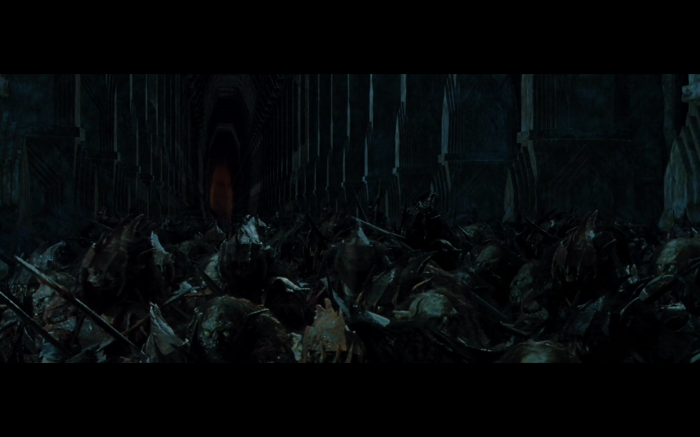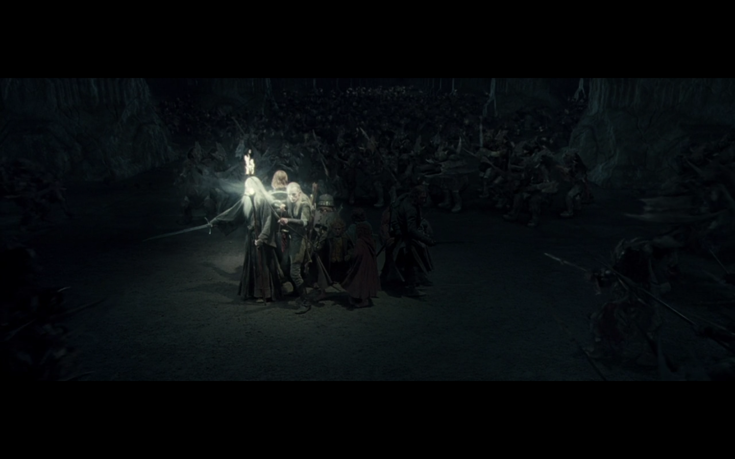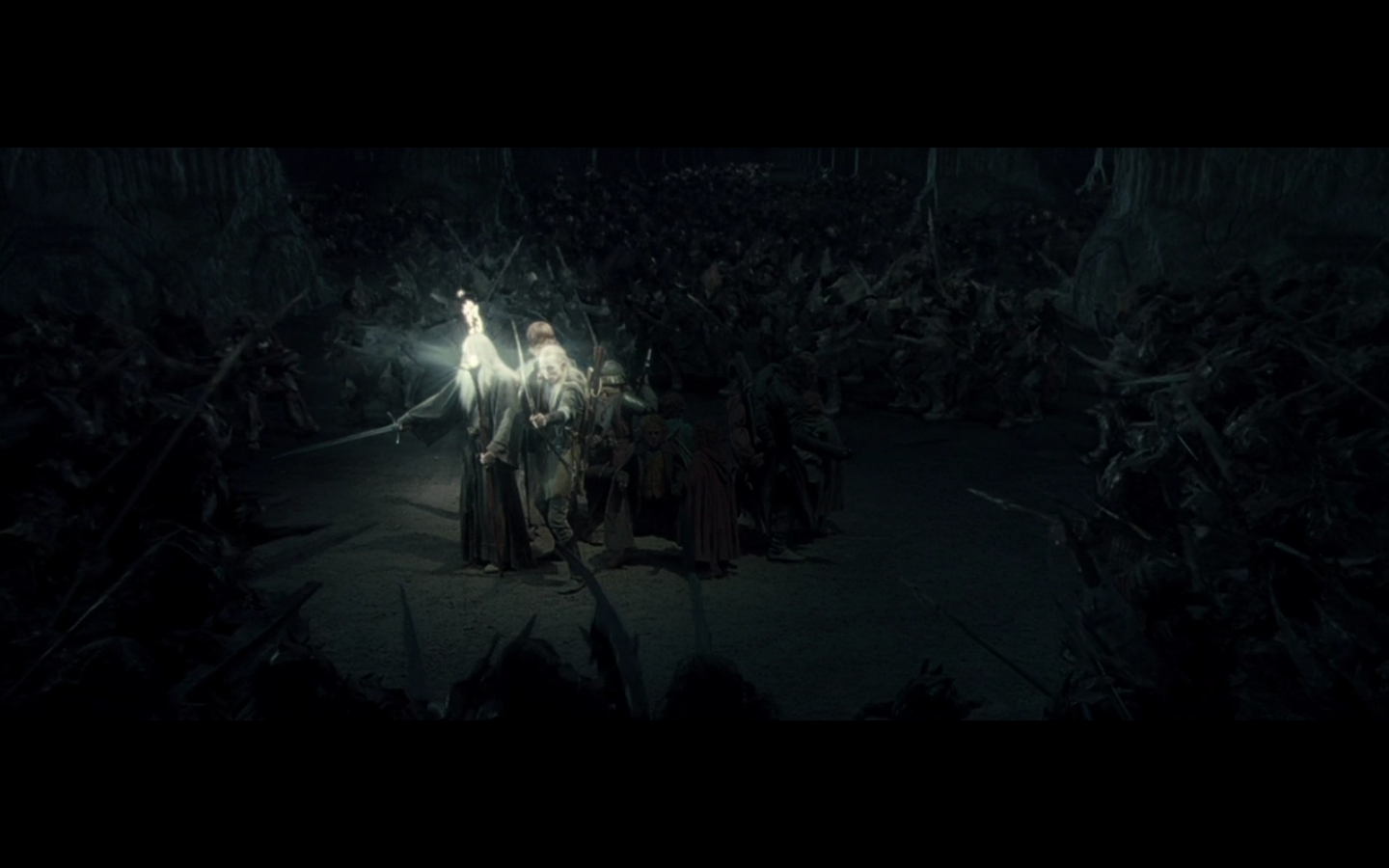 This is some creepy shit. They’re really good at making you feel nervous about shit. They are coming. This scene has always stuck with me – and I don’t mean the battle that’s about to happen, I mean the scene of Gandalf reading the account. It’s just so fucked up to me that they’re standing there in the middle of all these corpses, reading the last words that one of them ever wrote. And you have to imagine him writing that shit as goblins are banging on the door and they know they’re about to bite it.