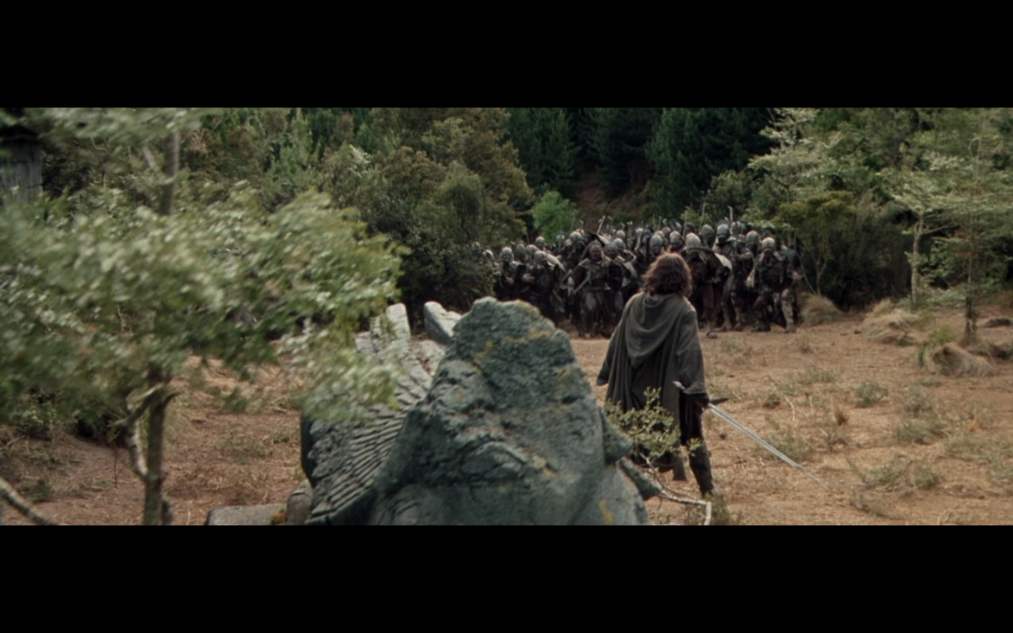 I love this shot of the wraiths closing in on Weathertop. It’s like black rain descending upon white people. I didn’t put it on the list because the trees are laughably fake. But the concept of the shot is pretty great. I love an overhead where people are coming in from below to surround you. Y’all are (about to be) surrounded.