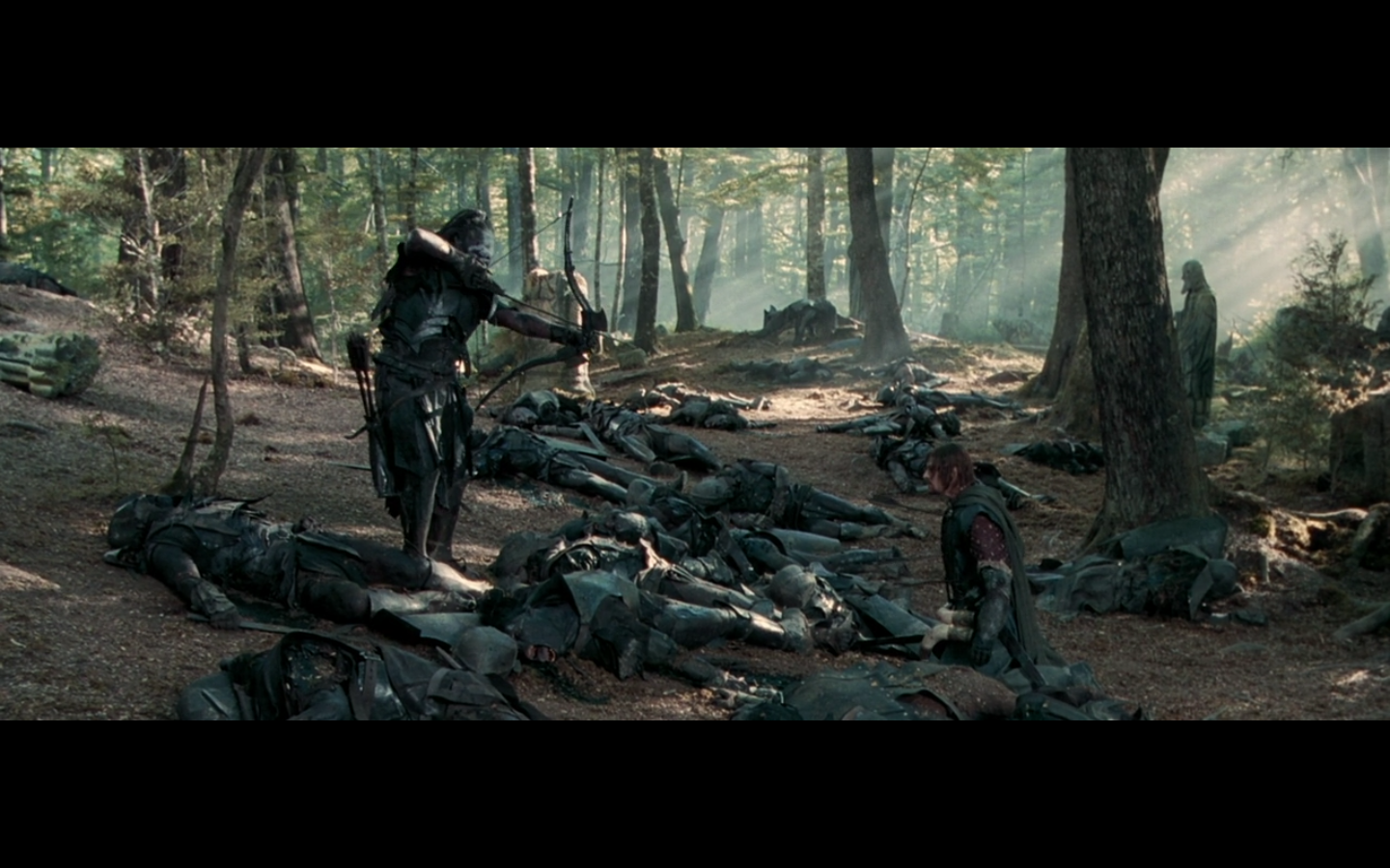 And then Jackson drops all the sound out, so all you hear is him pulling back the bow, and the creaking of the string and wood, and you’re just waiting to hear the thud of the arrow as it launches into Boromir’s chest. And the shot lingers for a good ten seconds or something, which makes the whole thing even better, because you’re just waiting, and waiting for it to happen.