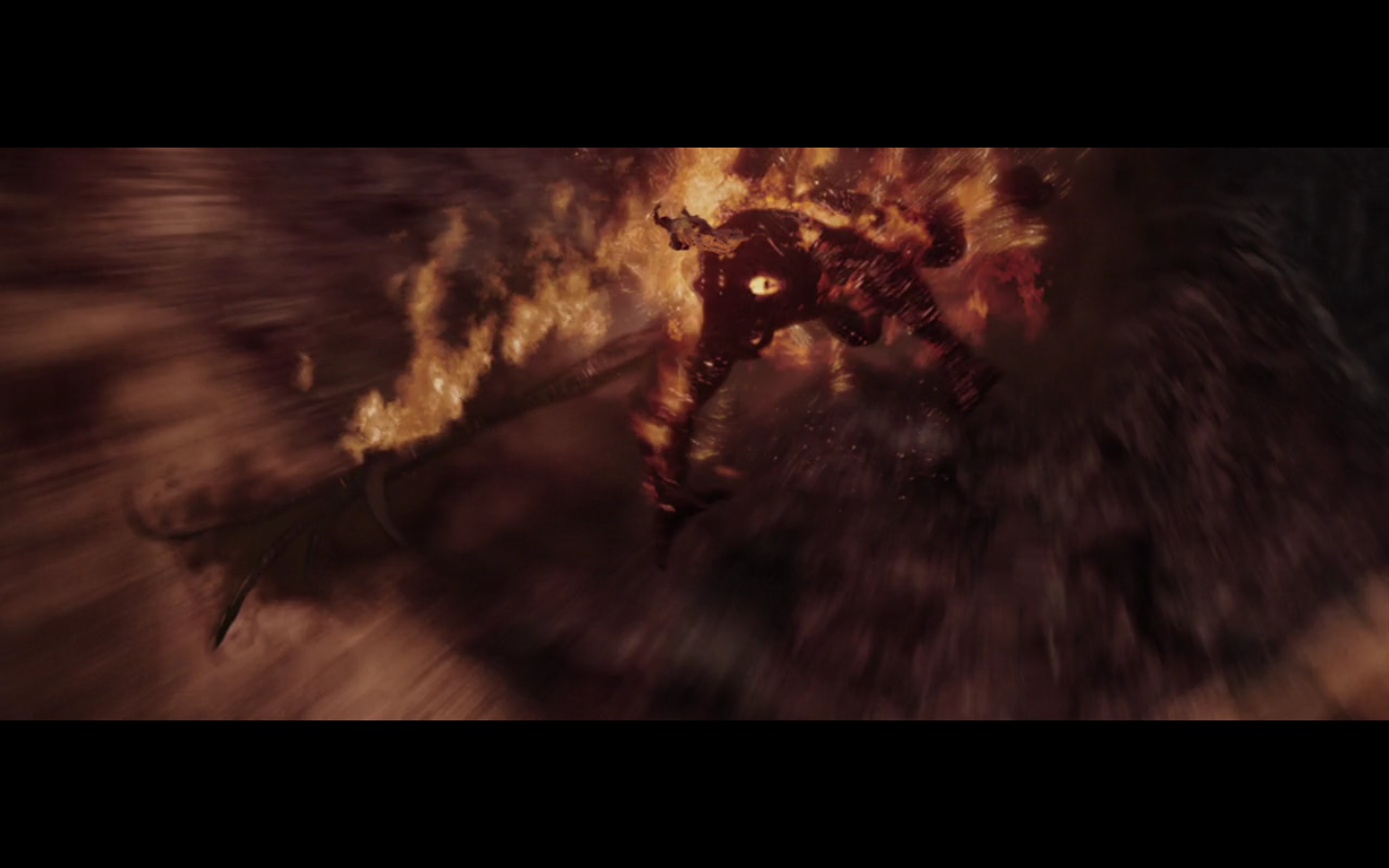 That is a huge cavern, there. Especially when you consider how fast they must be moving and how big that balrog is. Of course, then it falls in the water, which I thought would be an instant kill. Like, how does a Magmar wash itself? You can’t give it a shower, cause that hurts it. I thought fully submerging a balrog would be a pretty serious thing.
