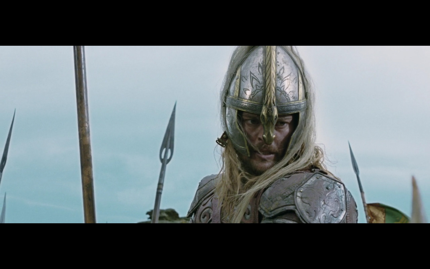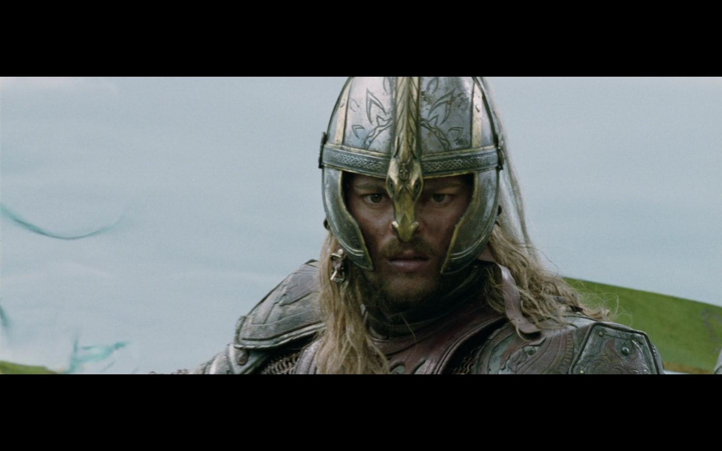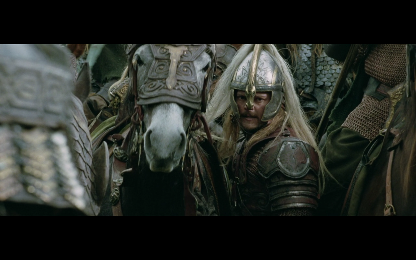 I’m just laughing cause his nose guard is a horse’s head, so it’s like his nose has a nose. I bet Theoden’s wife found him in a basket in the water. “I shall call him…’Noses.'” “That’s a bullshit name. We’re calling him Eomer.”