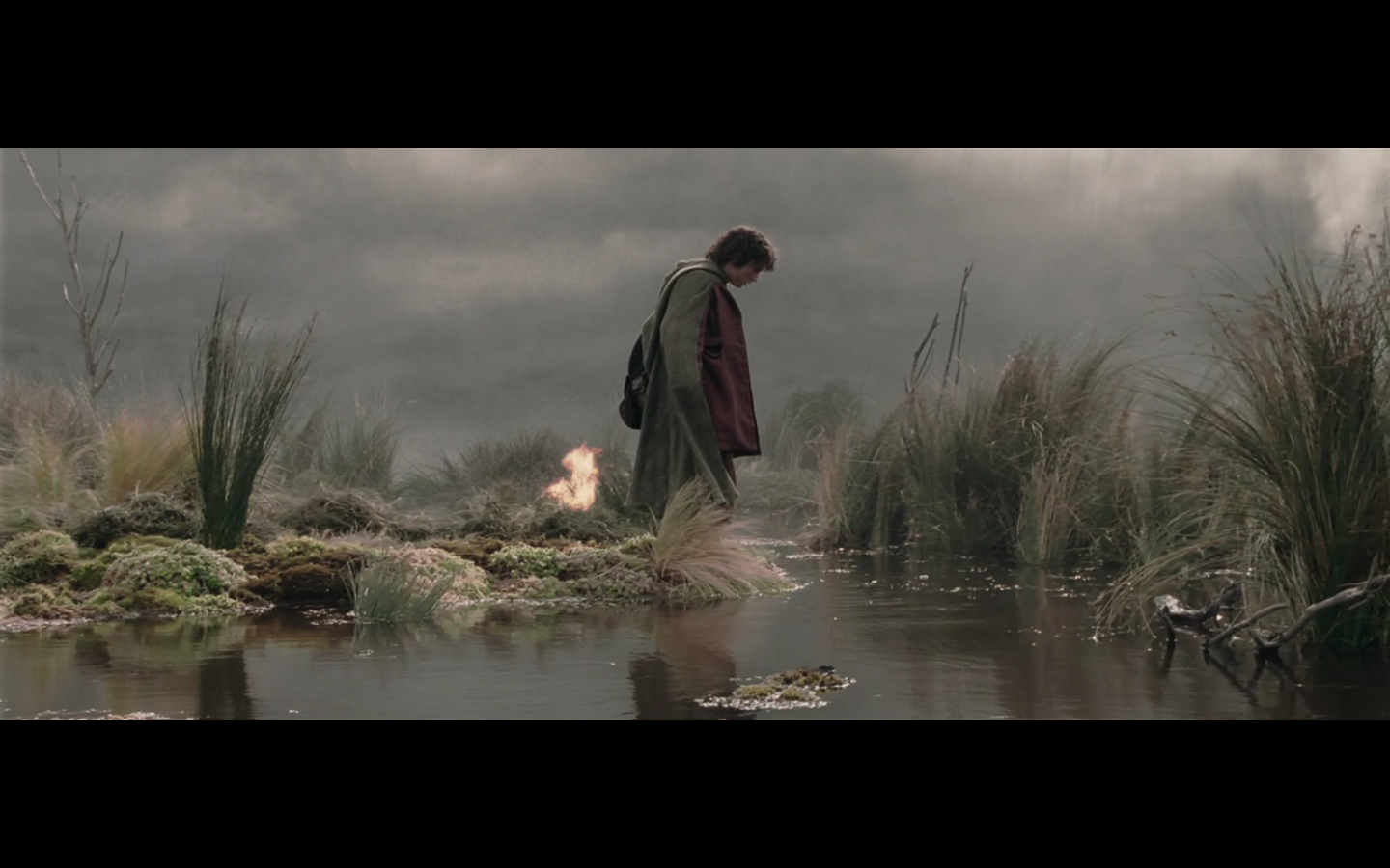 Look in front of you, idiot. It’s obviously a bog for as far as the eye can see. You had to step in it before you noticed? In fact, once they cut to a wide shot, you can see that they’re already sort of IN the swamp by the time Sam notices.