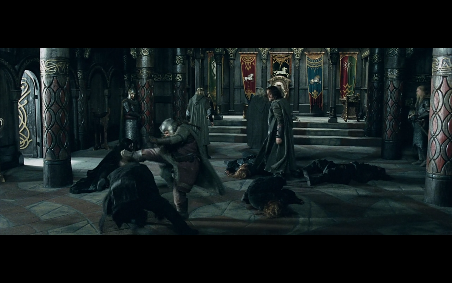 Why? Why are you stopping him, Aragorn? Gandalf gives the whole pity speech about Gollum cause Gollum might be useful in the future. Wormtongue does nothing in the future except terrorize the Shire with a demoted Saruman, so you may as well end him here. “Enough blood has been spilled on his account?” The body count this franchise racks up, and you’re telling me you’re sparing a dangerous SPY because you don’t like blood?