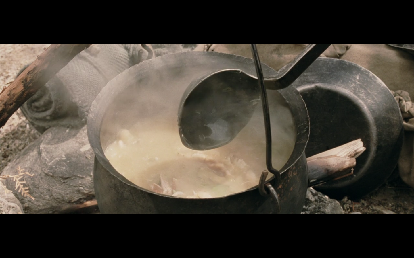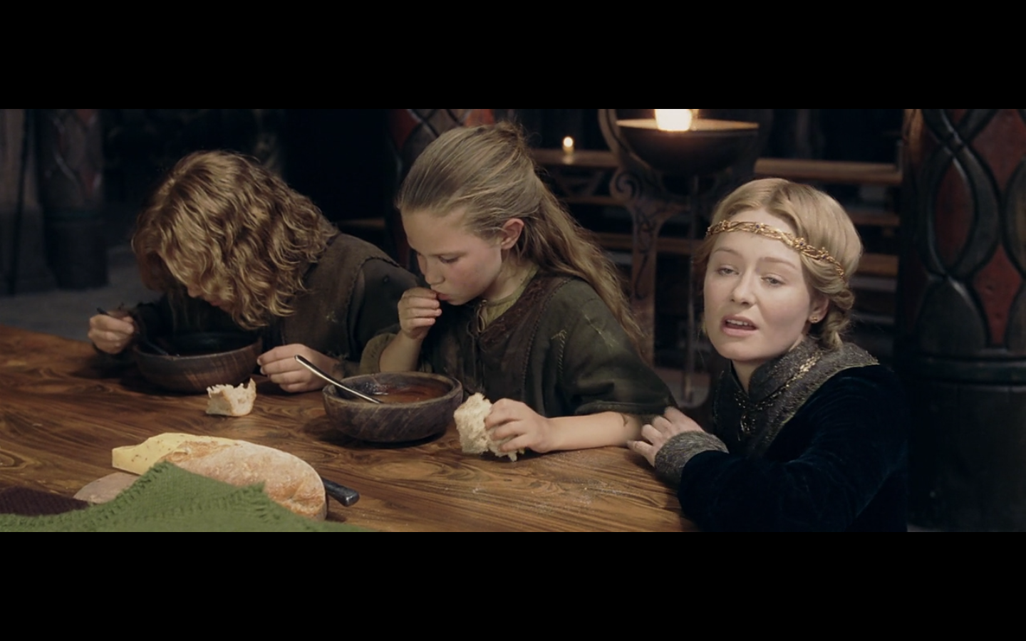 Gimli picks at bread with a knife before putting it in his mouth. As you do.