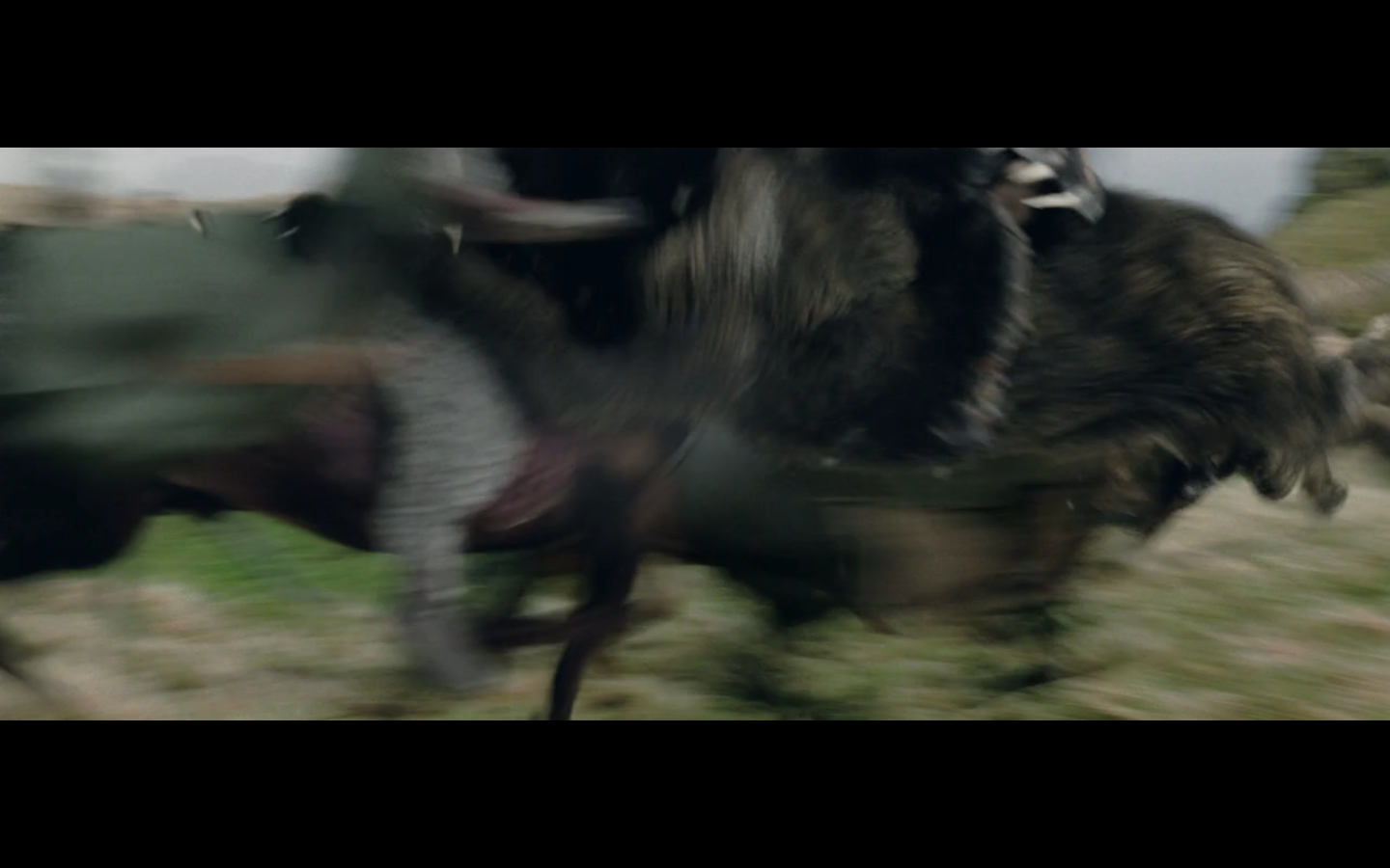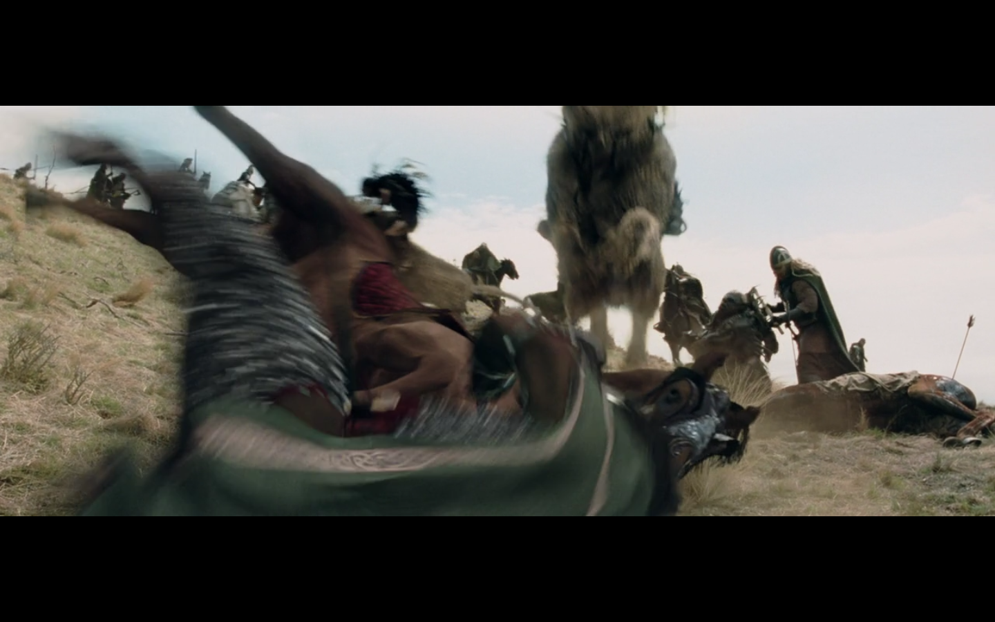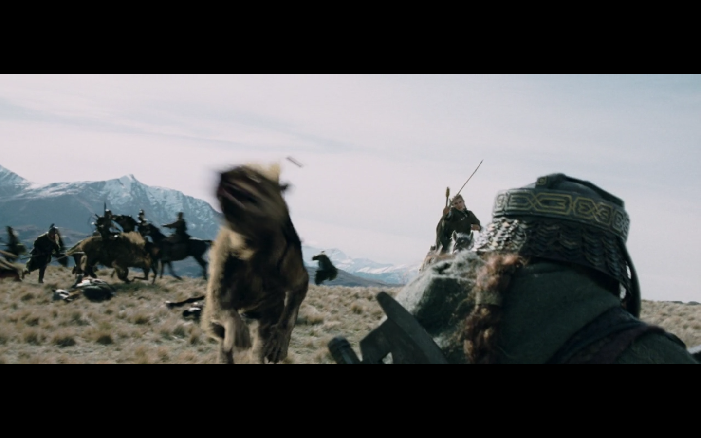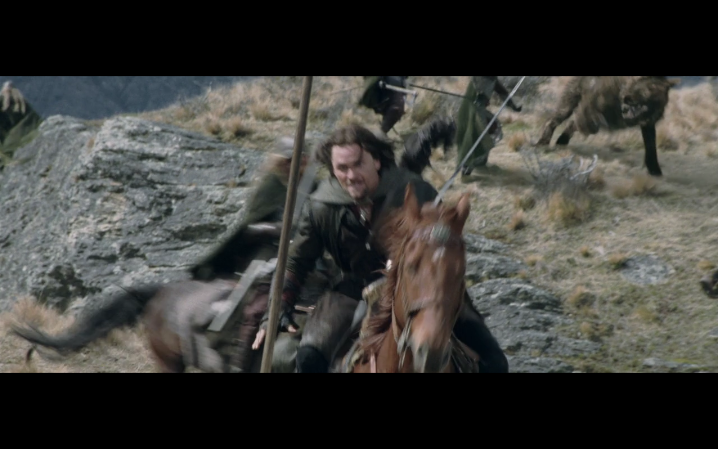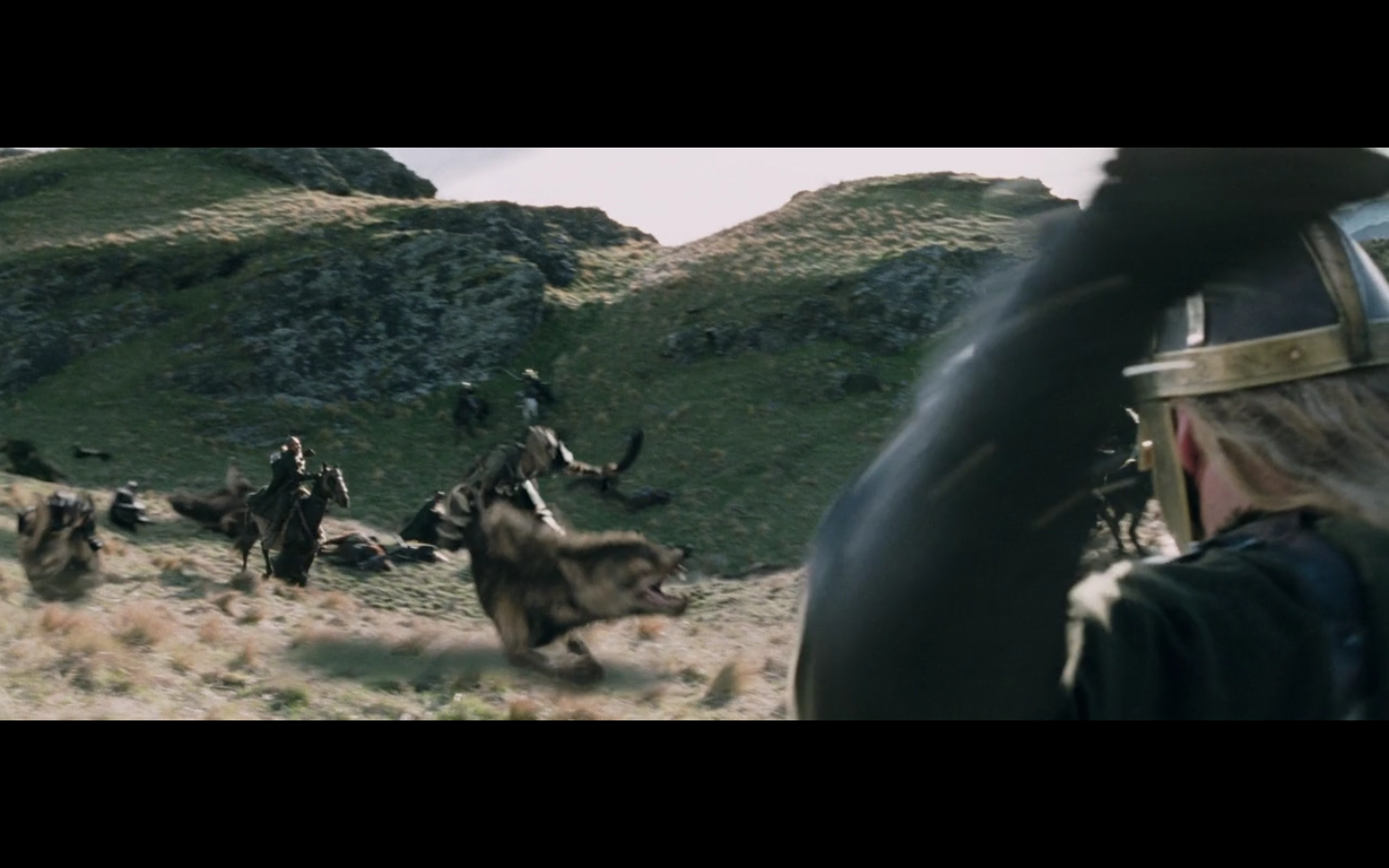 I think part of my dislike of this scene has to do with how obviously CG the wargs look. Pretty much all the other CG in this movie I can buy (for the most part. I’m not gonna sit there and make a list, but… not too much seems overly obvious. Like the trolls. Or the olliphants. You know they’re CG, but for the most part, it’s not that offensive. This felt pretty offensive and gratuitous.)