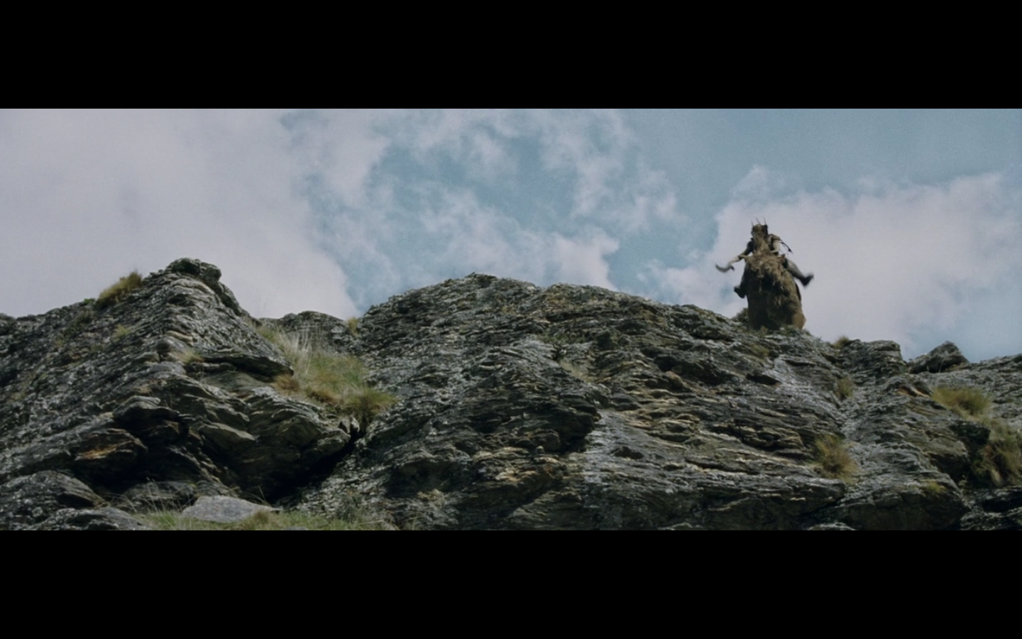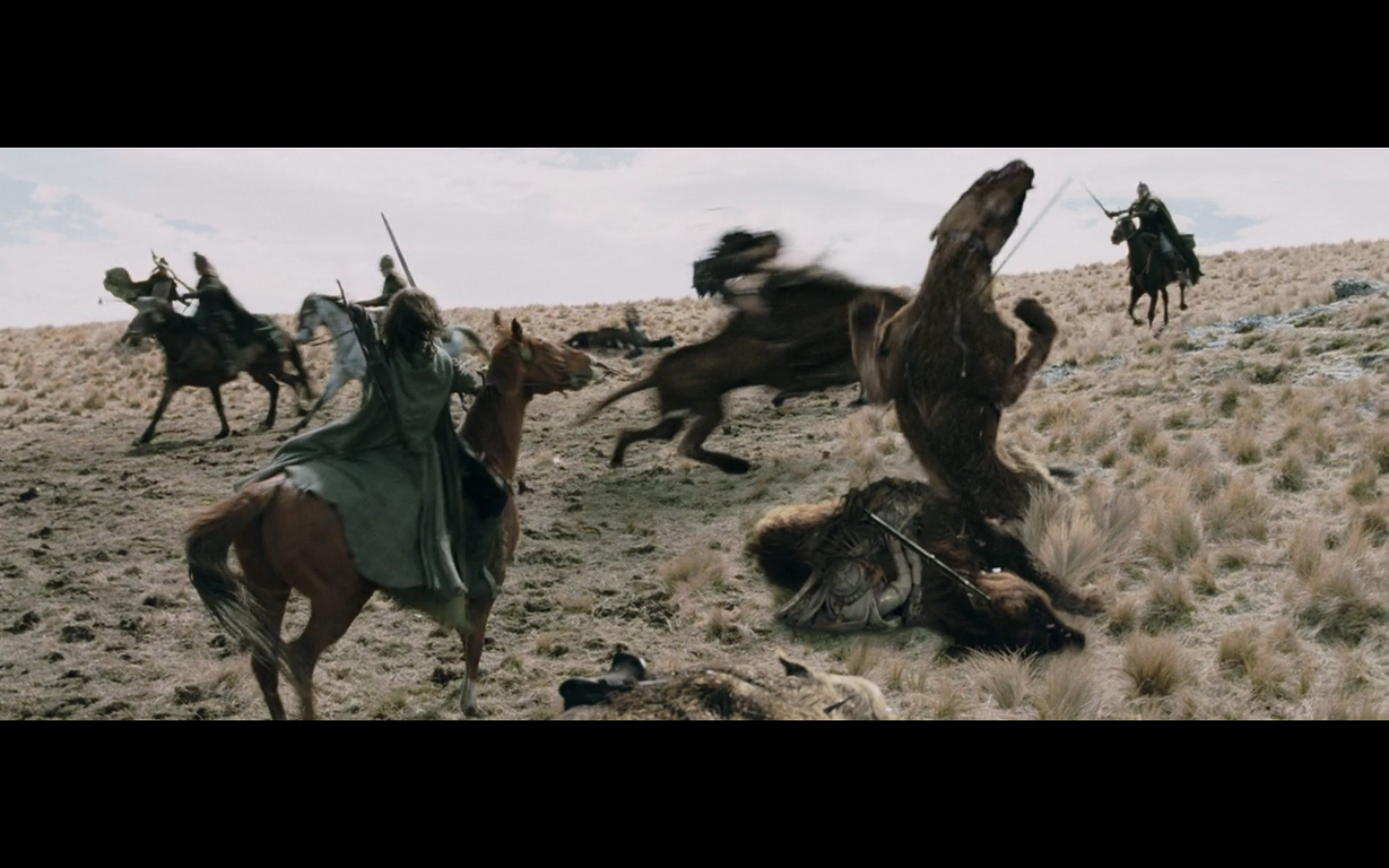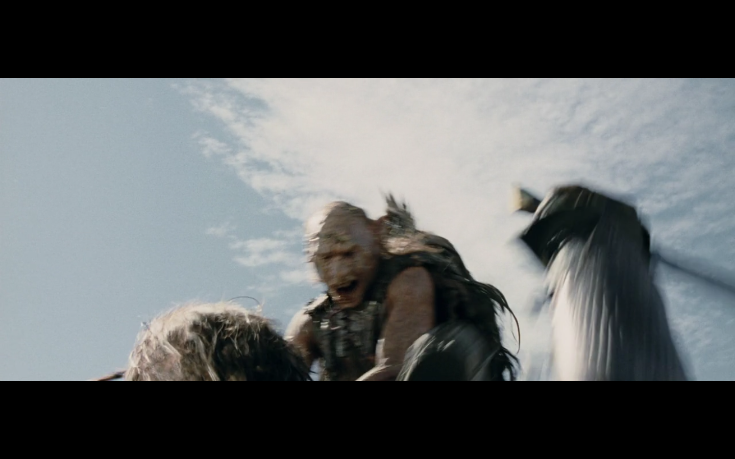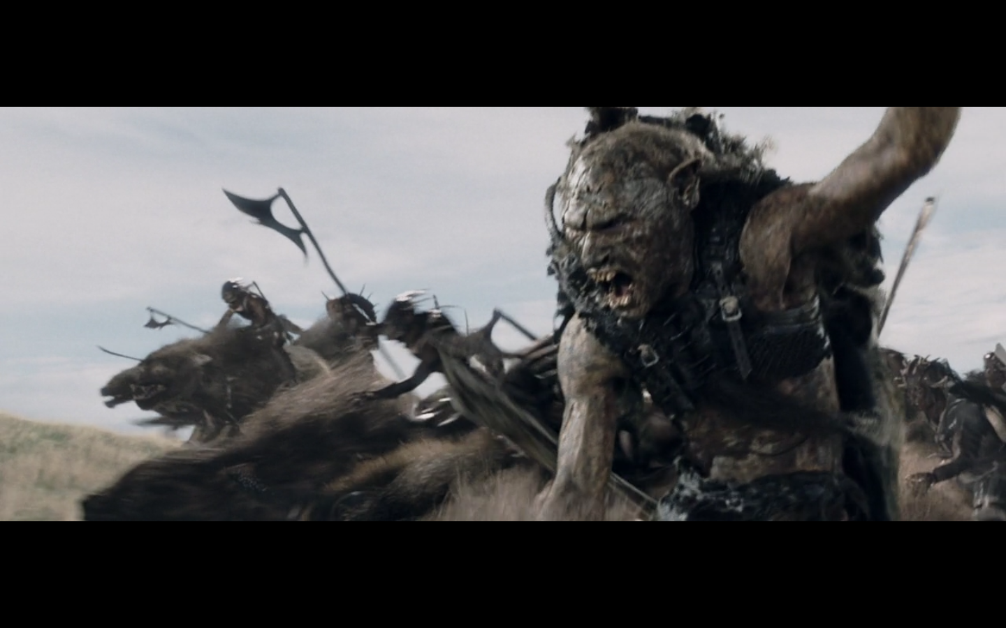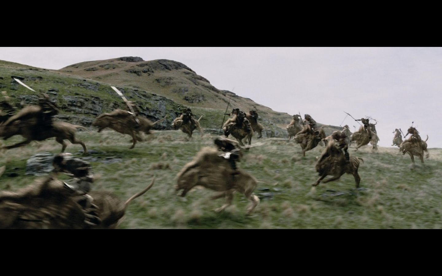 I think part of my dislike of this scene has to do with how obviously CG the wargs look. Pretty much all the other CG in this movie I can buy (for the most part. I’m not gonna sit there and make a list, but… not too much seems overly obvious. Like the trolls. Or the olliphants. You know they’re CG, but for the most part, it’s not that offensive. This felt pretty offensive and gratuitous.)