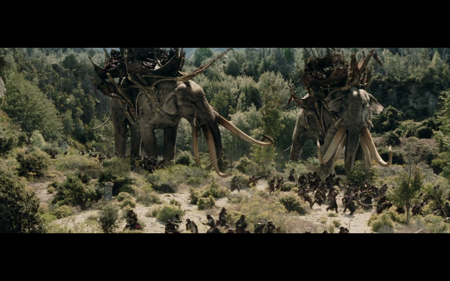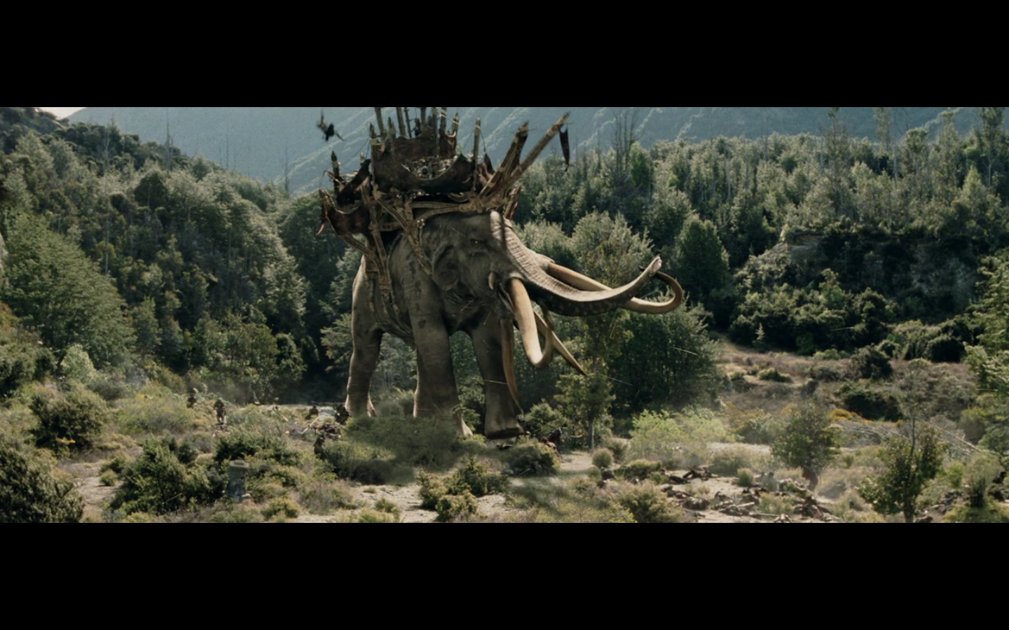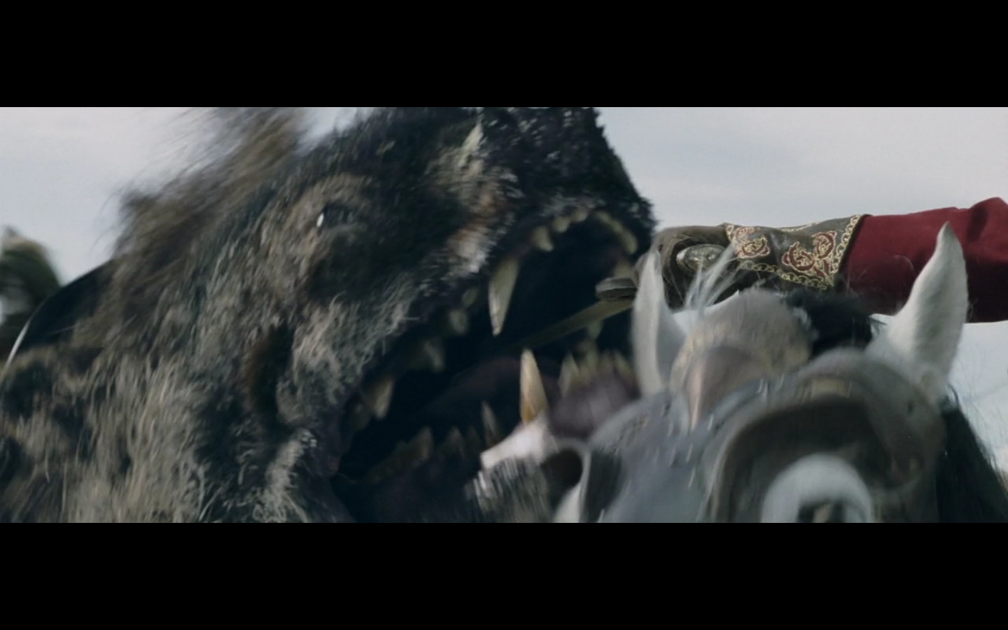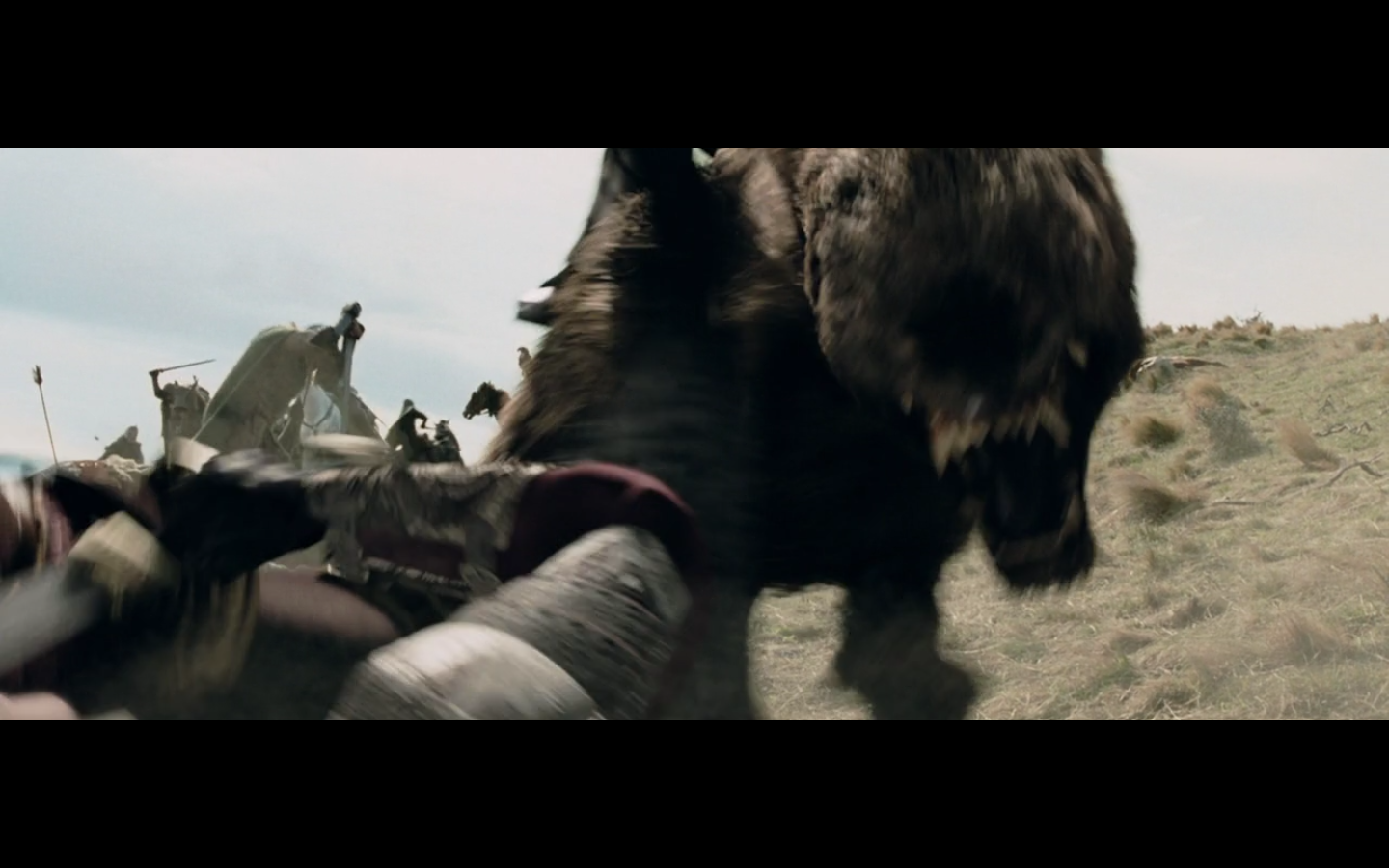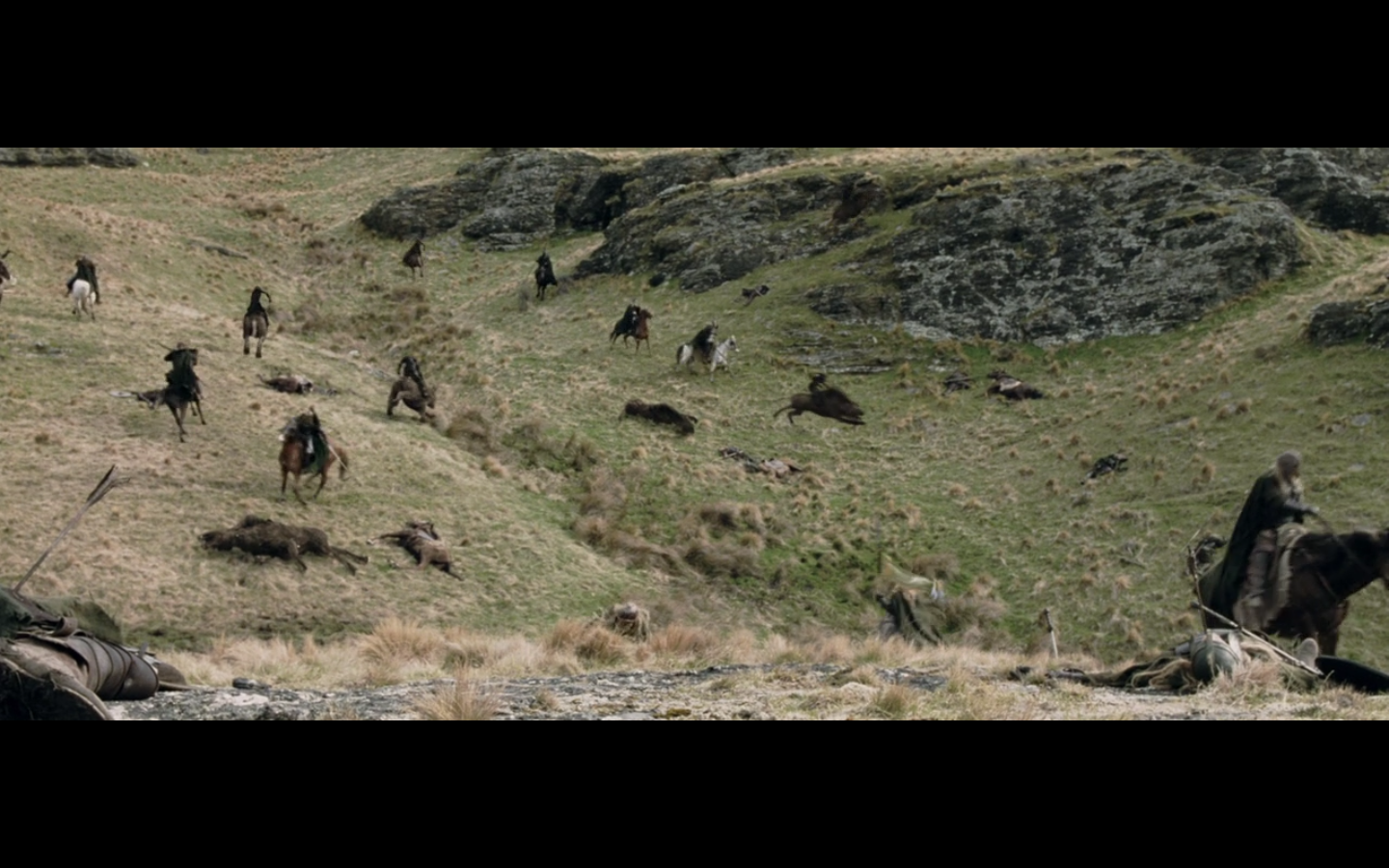 I think part of my dislike of this scene has to do with how obviously CG the wargs look. Pretty much all the other CG in this movie I can buy (for the most part. I’m not gonna sit there and make a list, but… not too much seems overly obvious. Like the trolls. Or the olliphants. You know they’re CG, but for the most part, it’s not that offensive. This felt pretty offensive and gratuitous.)