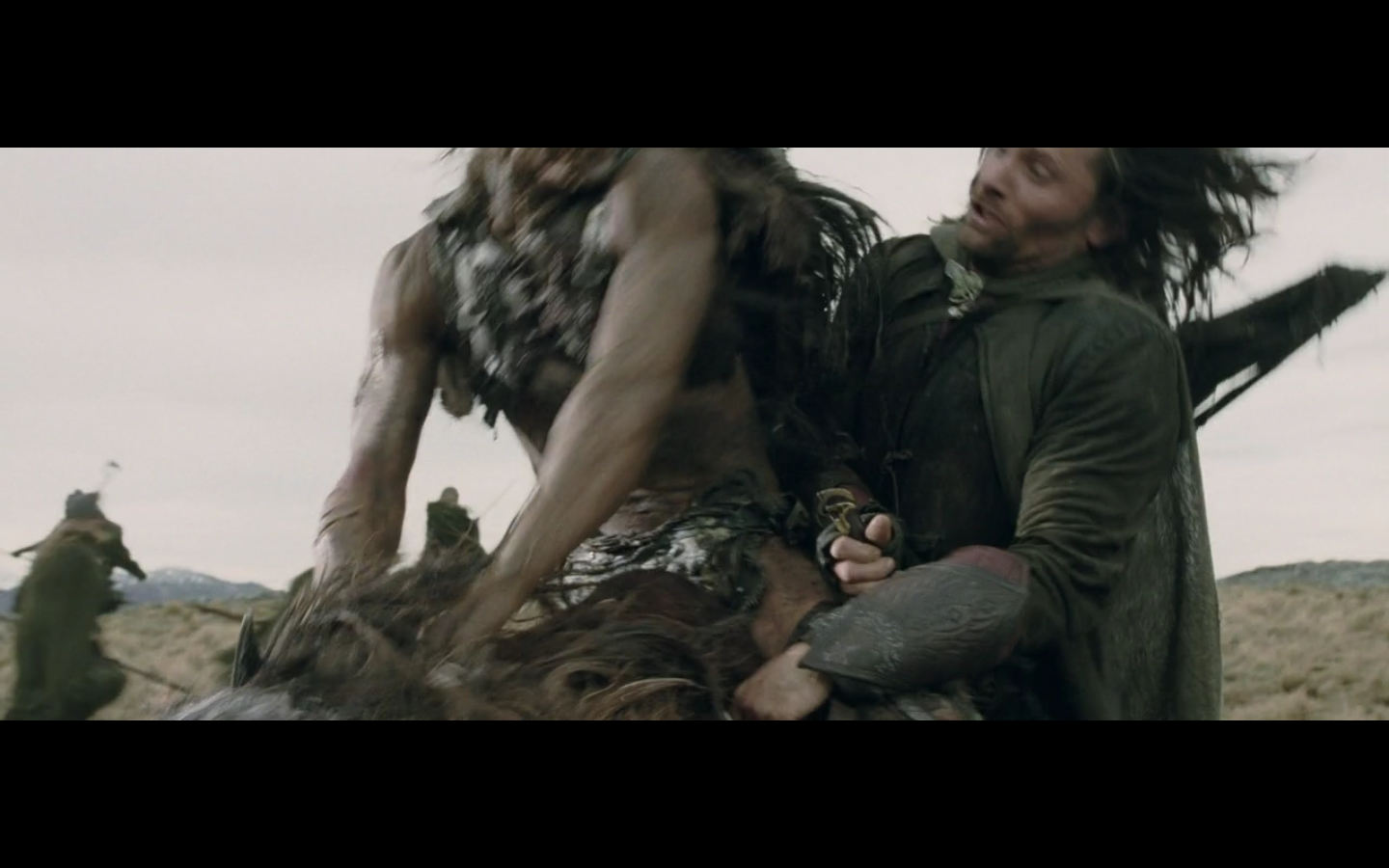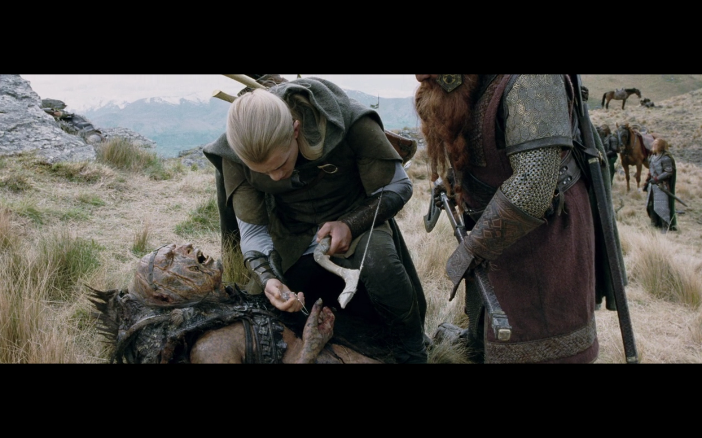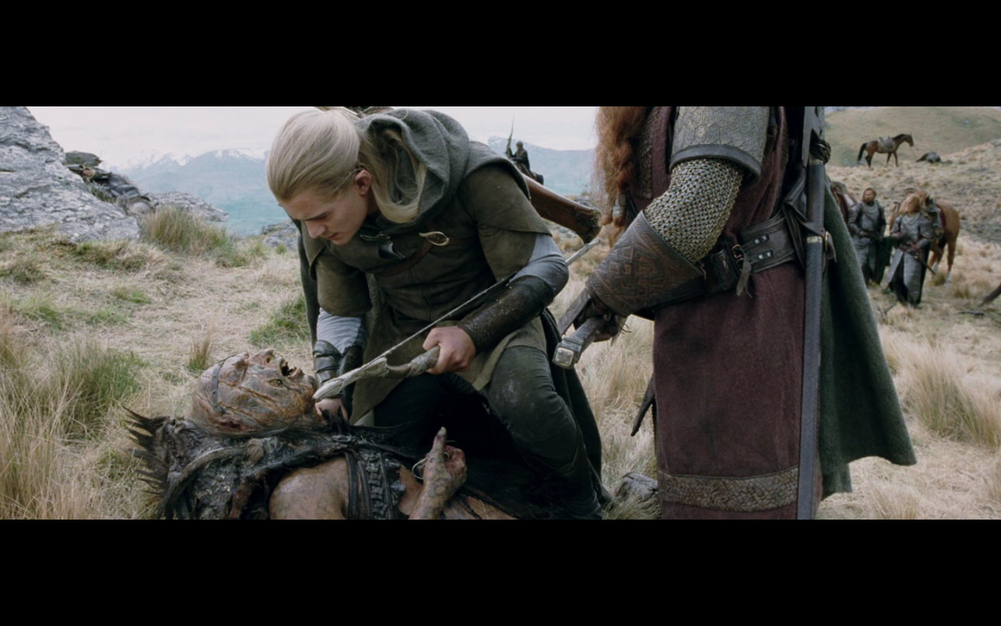 I was talking about the Rohan guys before, but Legolas just slit this orc’s throat and yelled, “A scout!” If you’re made a scout, you’ll be killed. If you’re named Scout, you’ll only be attacked by Bob Ewell.
