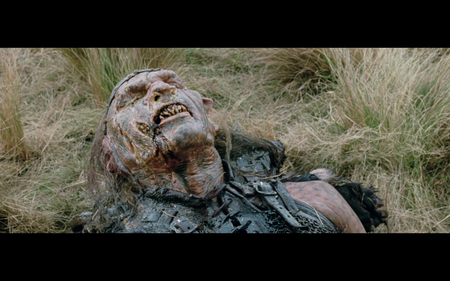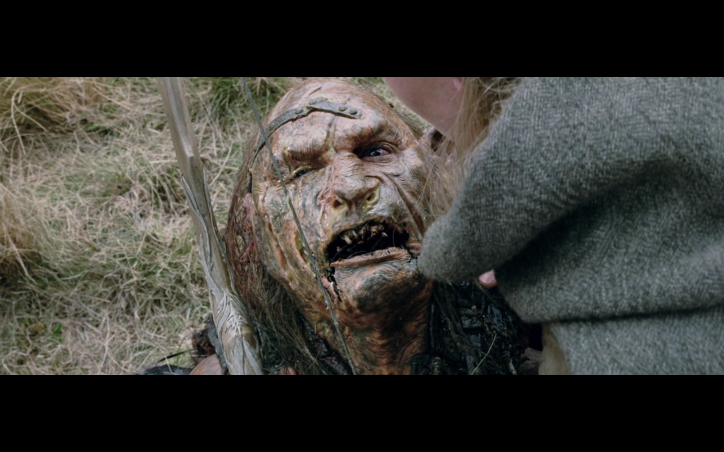 How does this dying orc know that they’re looking for the guy he got mixed up with? And why does he have metal pieces grafted to his forehead? Has he had brain surgery? Are we to believe that orcs would go to such trouble to fix each other up when they could just jizz in the mud and make more of themselves?