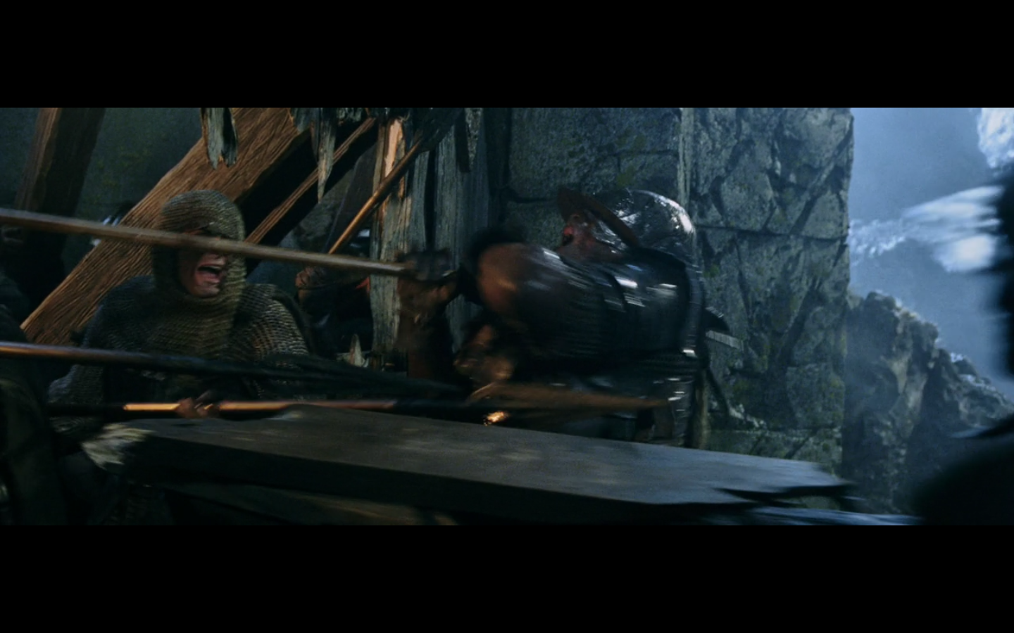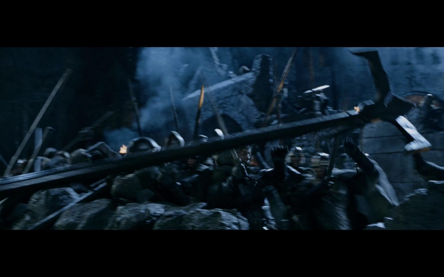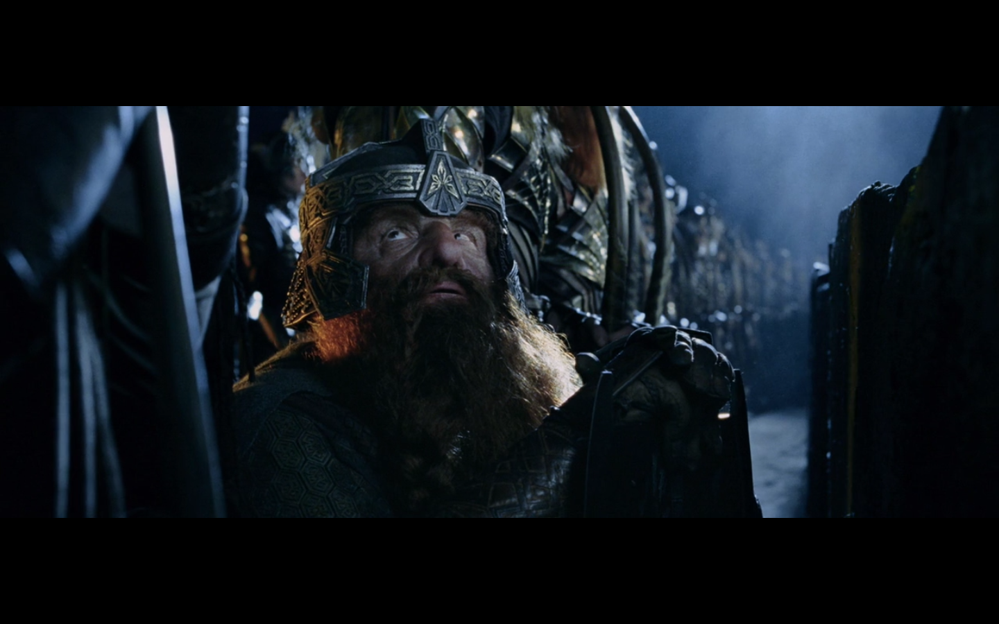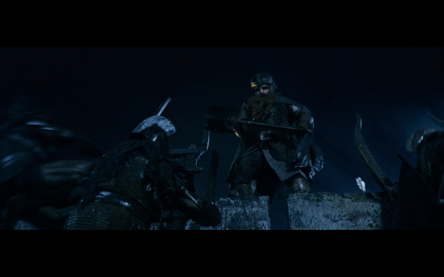 I like this shot. We just cut back as Gimli counts from 17-21 in kills. That’s great. That instantly makes a scene better, when a dude is just counting his kills as he goes along.