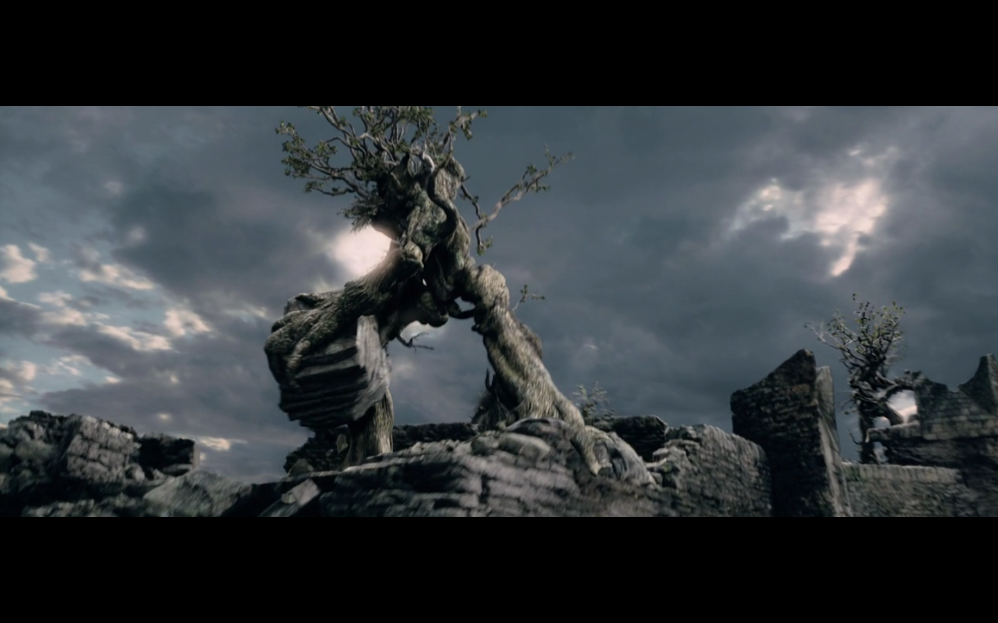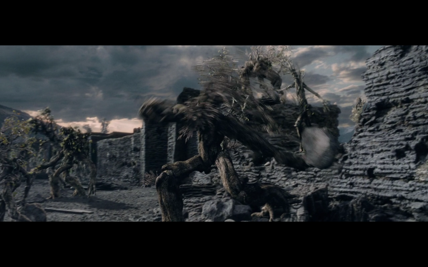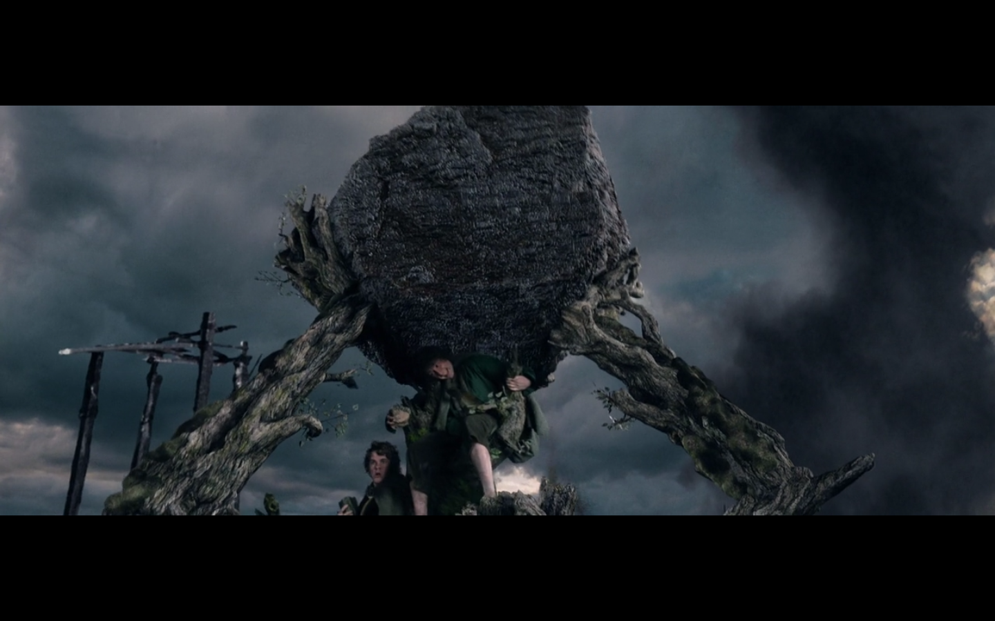 Treebeard gets off a little bit with the hobbits throwing rocks at the orcs.