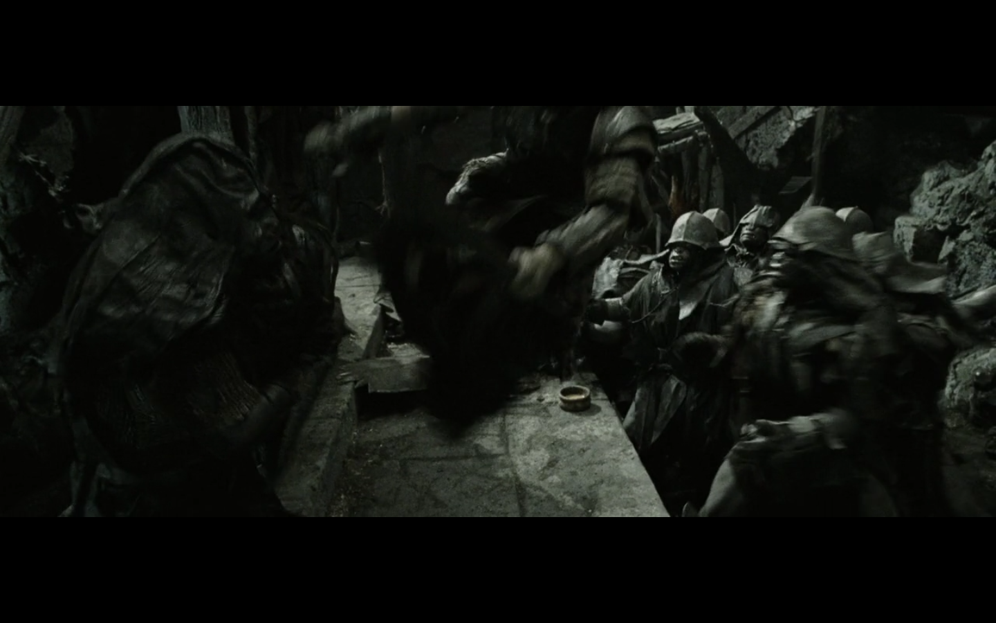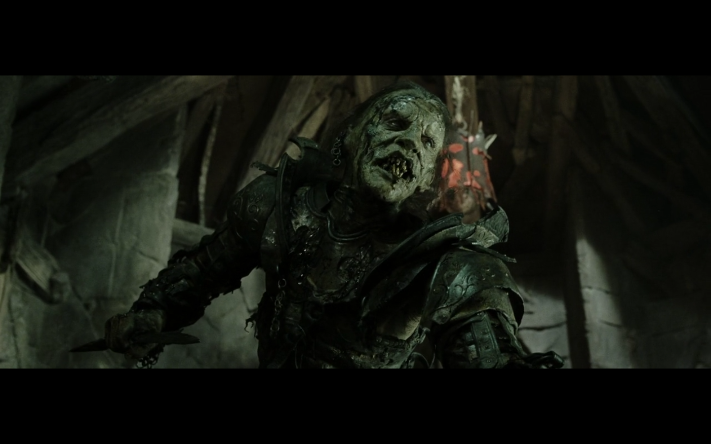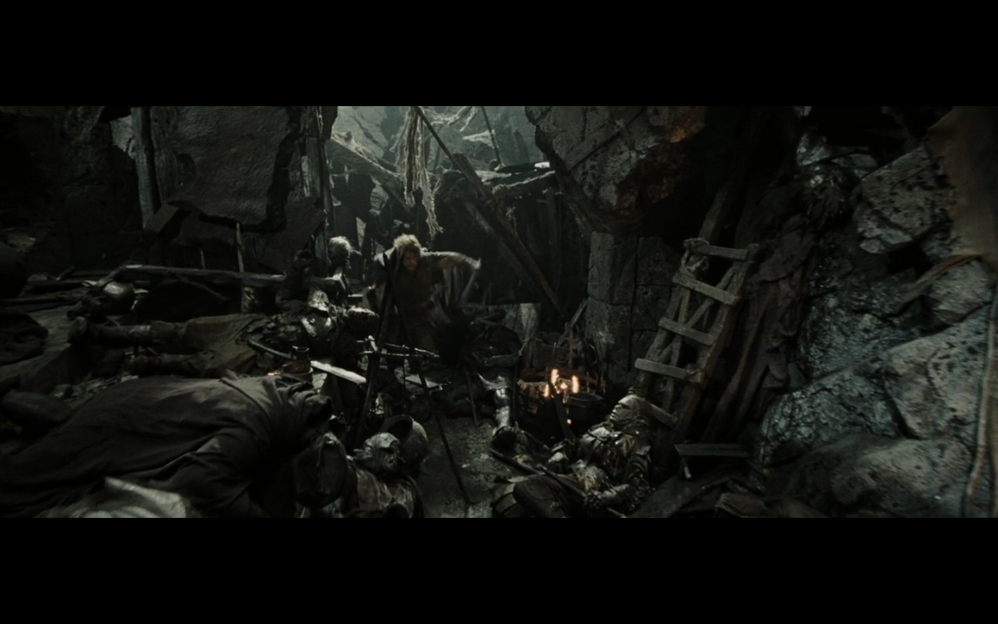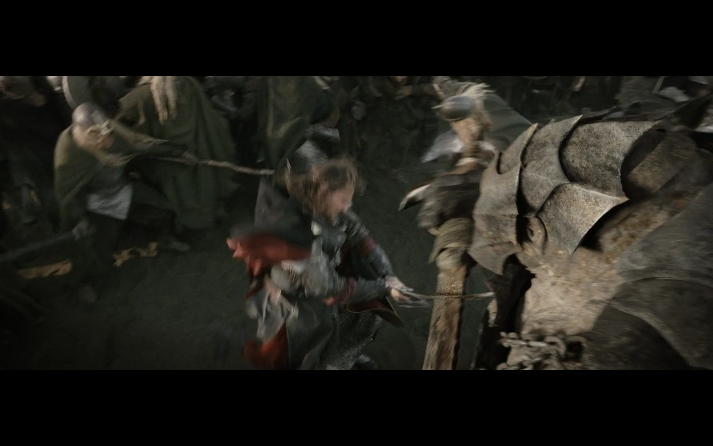 That’s the problem with orcs, though, isn’t it? They have no discipline and fight amongst themselves too much. And this little squabble is actually sort of a racial thing — the little one is a Morgul orc, coming from the Morgul Vale where the Witch King lives. The bigger one is an uruk-hai and doesn’t report to the same people. He’s a stronger sort of orc and seems to resent the Morgul orcs. The good guys don’t even really have this problem, but the orcs are prone to infighting, as we’re about to see.