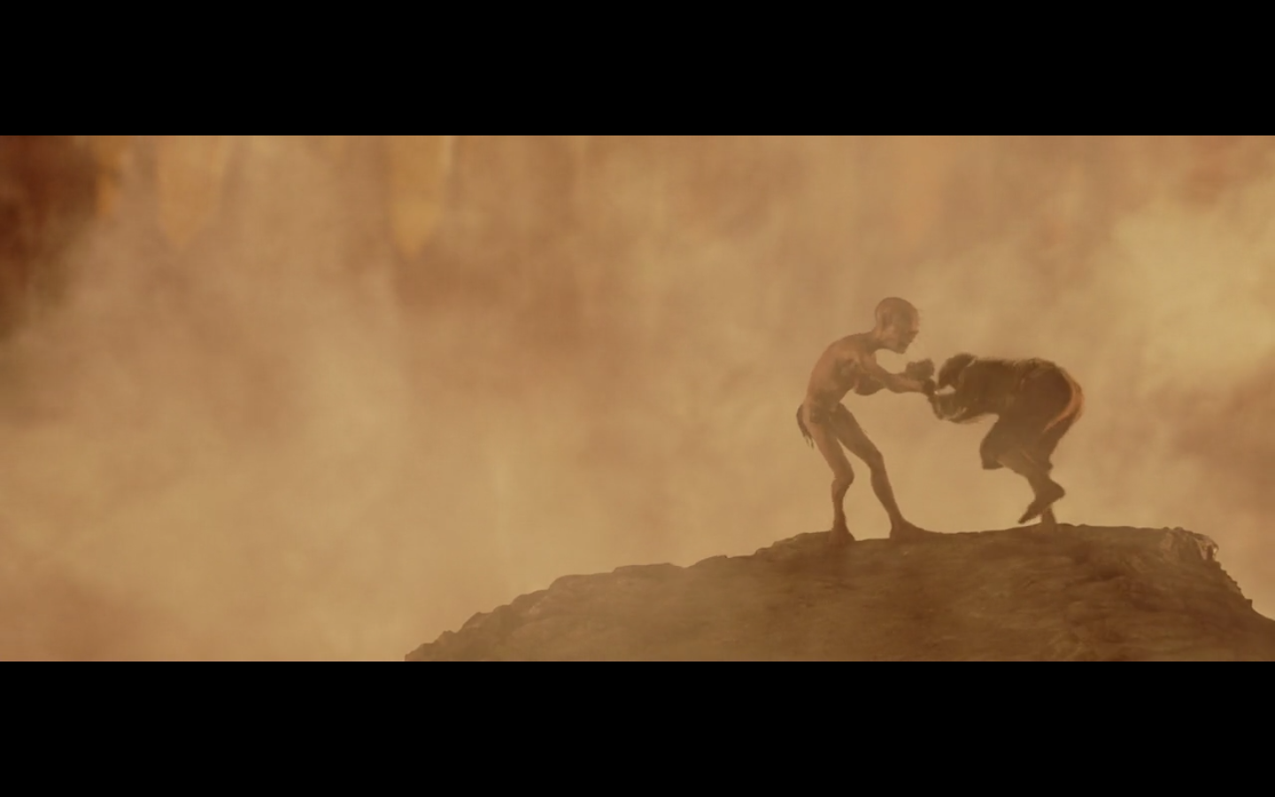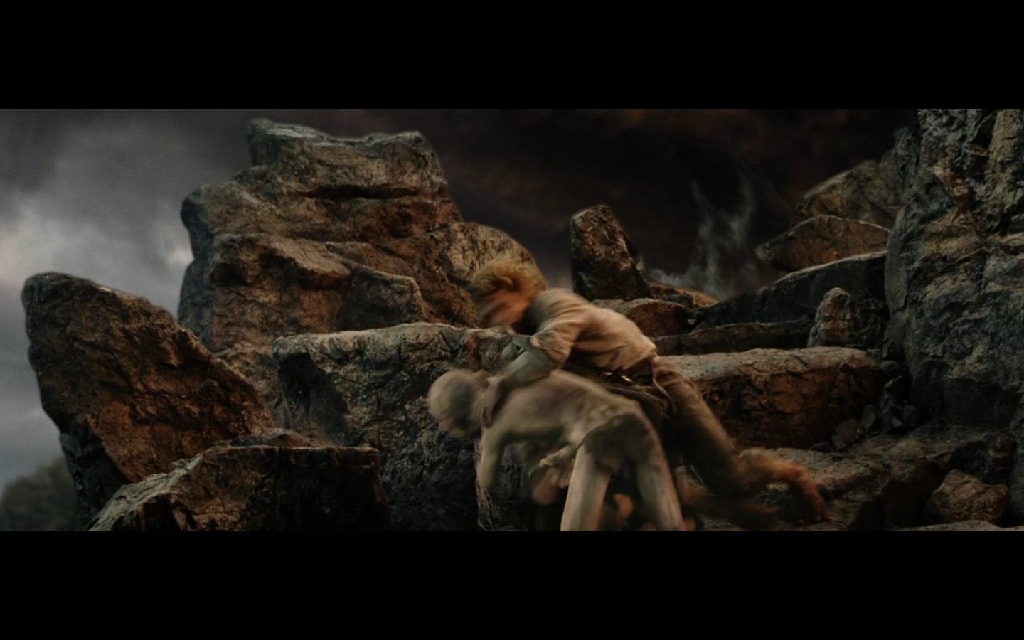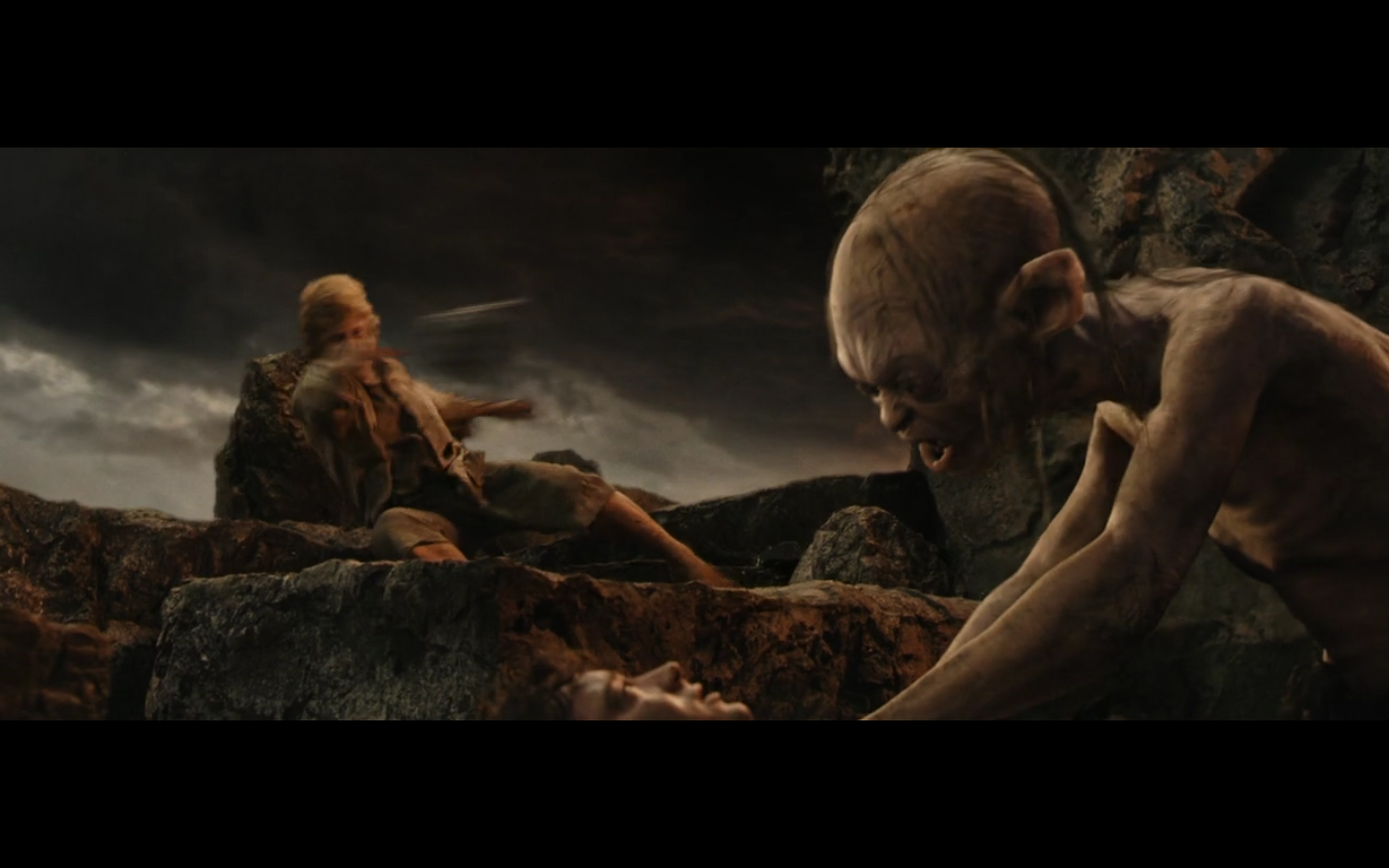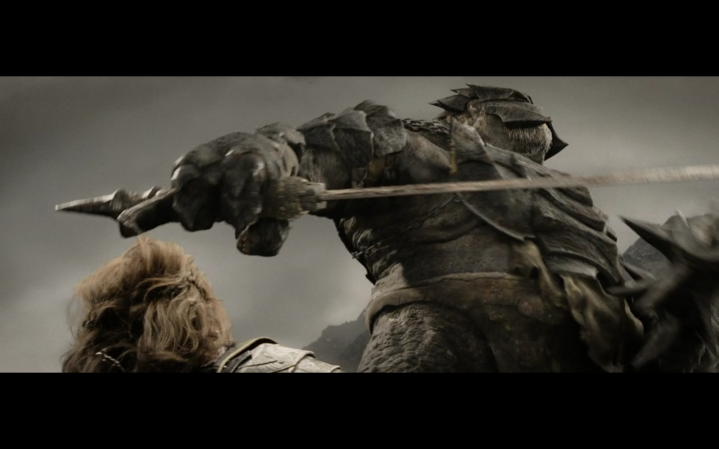 That’s the problem with orcs, though, isn’t it? They have no discipline and fight amongst themselves too much. And this little squabble is actually sort of a racial thing — the little one is a Morgul orc, coming from the Morgul Vale where the Witch King lives. The bigger one is an uruk-hai and doesn’t report to the same people. He’s a stronger sort of orc and seems to resent the Morgul orcs. The good guys don’t even really have this problem, but the orcs are prone to infighting, as we’re about to see.