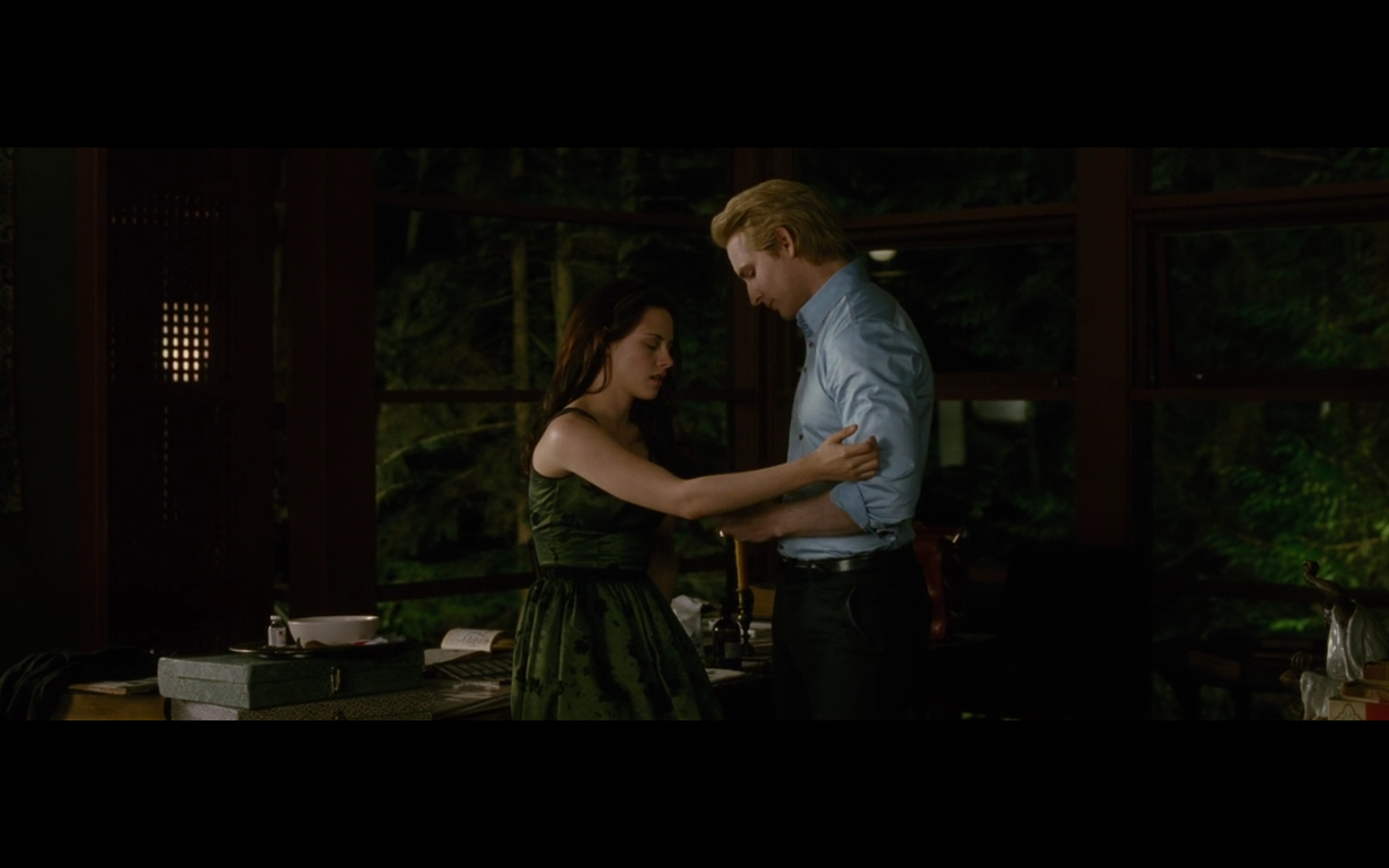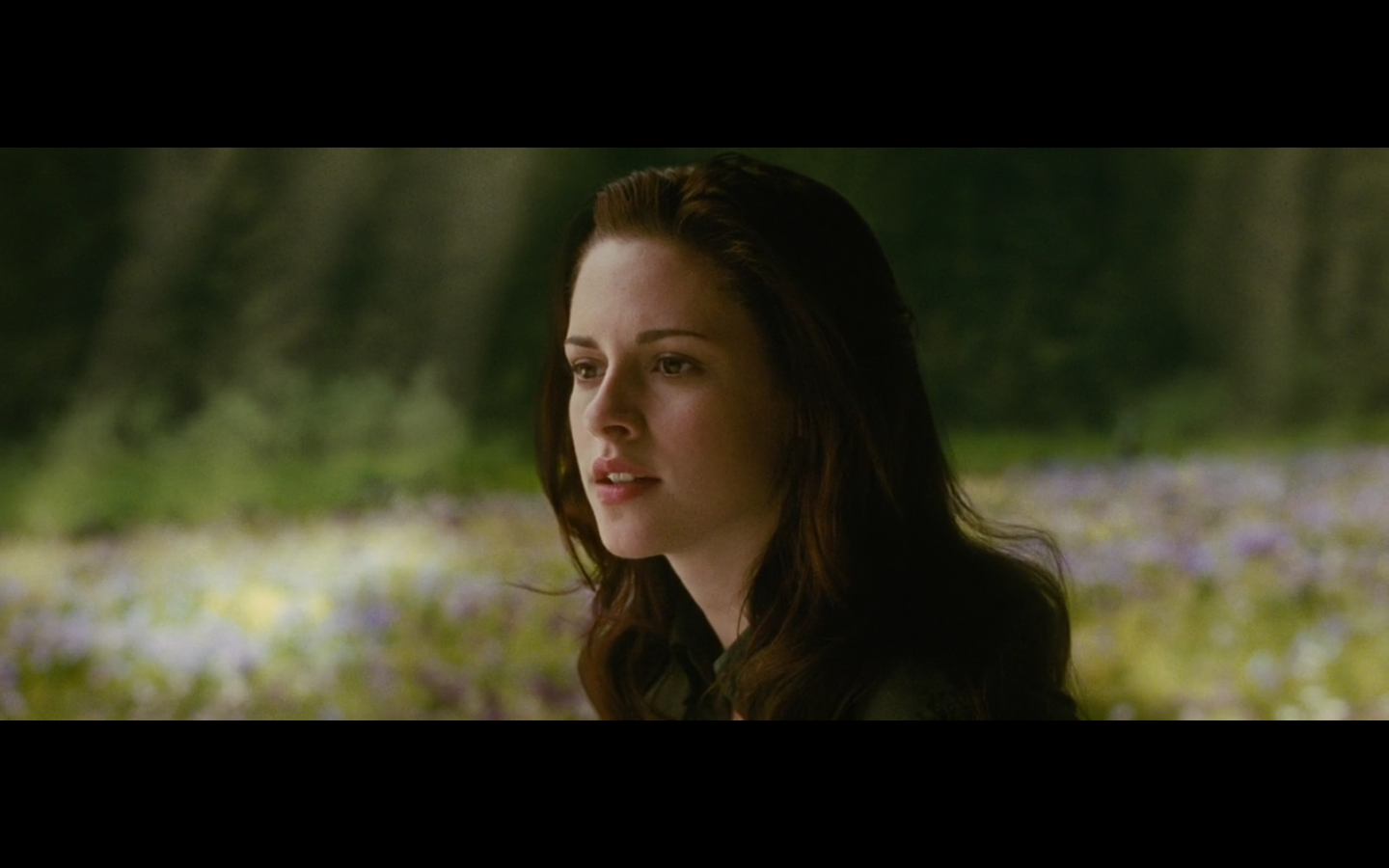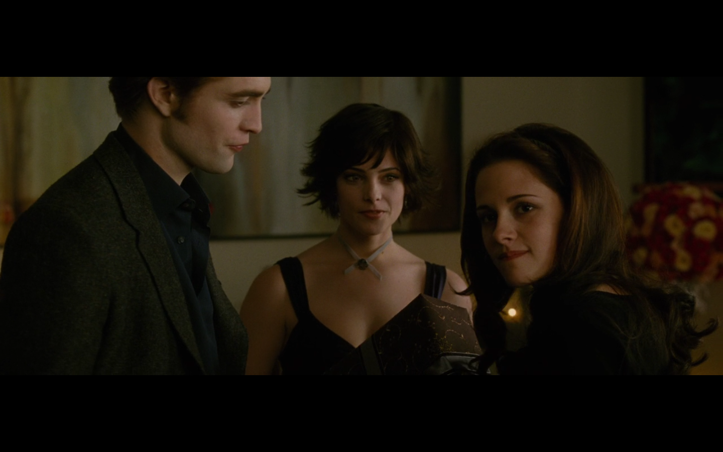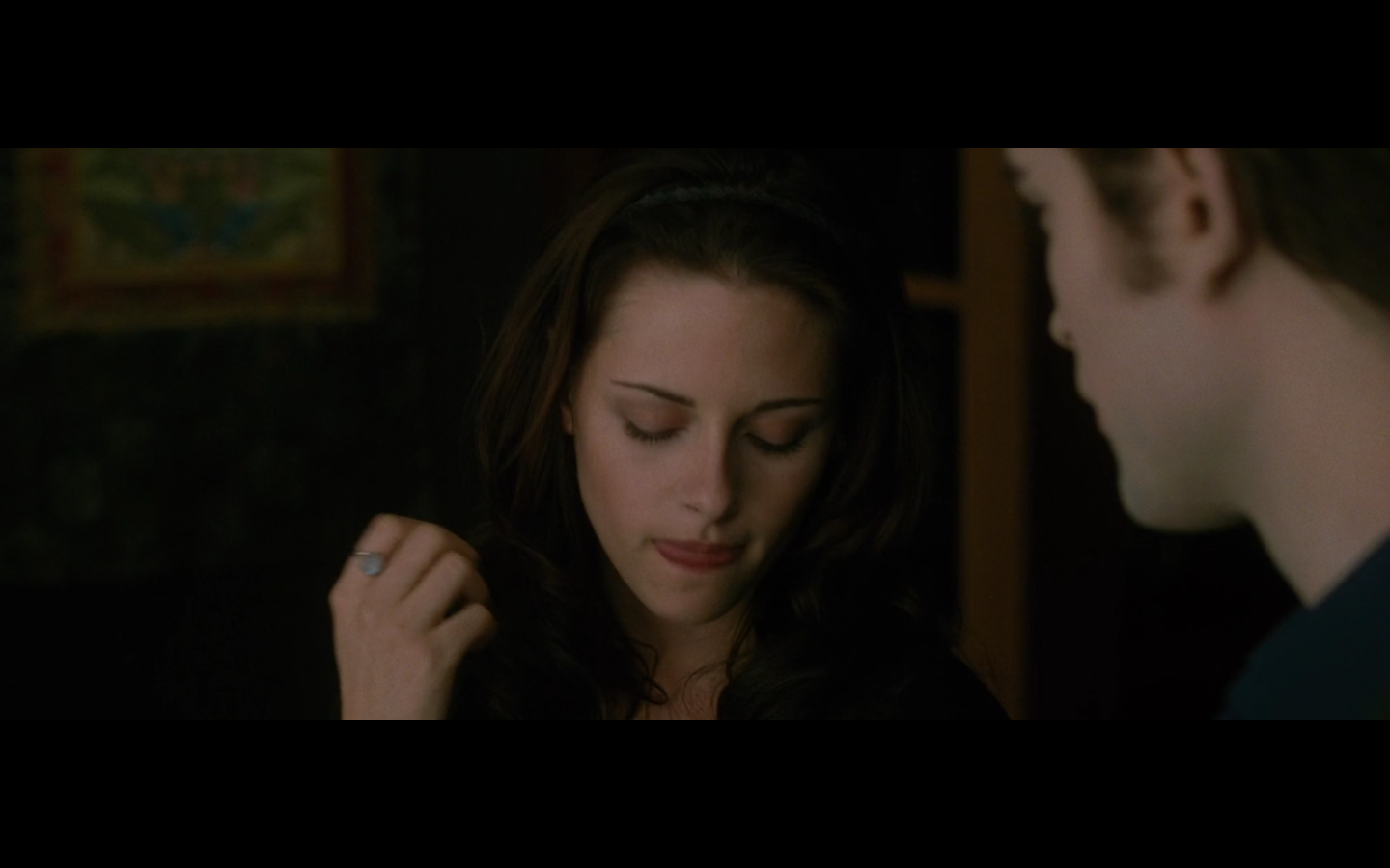 There’s a nice moment here where she gets a present from Carlisle and Esme and Esme says it’s “to brighten her day,” because she’s “been looking kind of pale lately.” And she reacts like this.