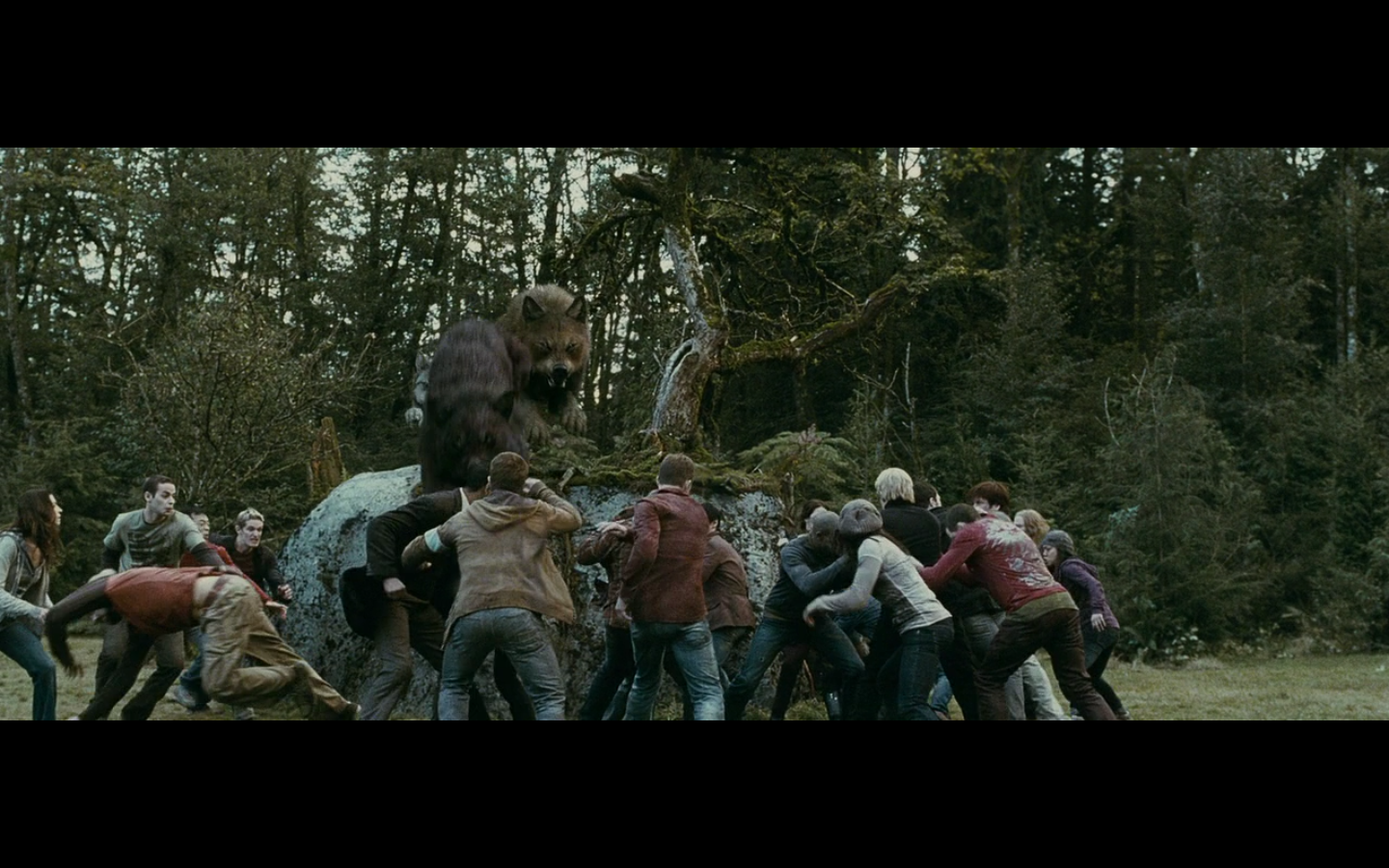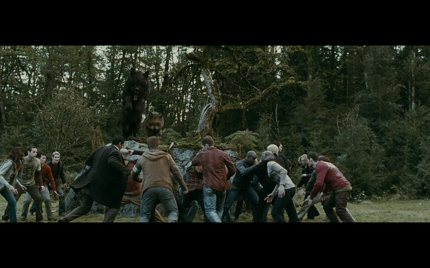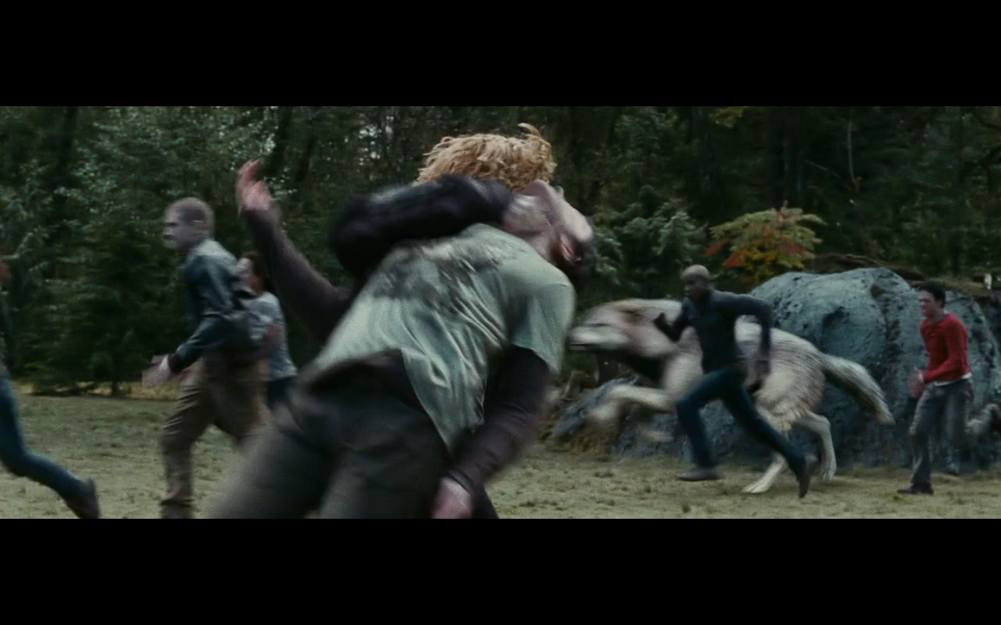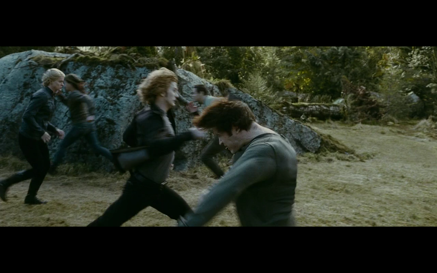 My favorite is that during all this, they cut back to Jacob and Bella, and Jacob is doing color commentary like — “Jacob just got there. He fights pretty well.”