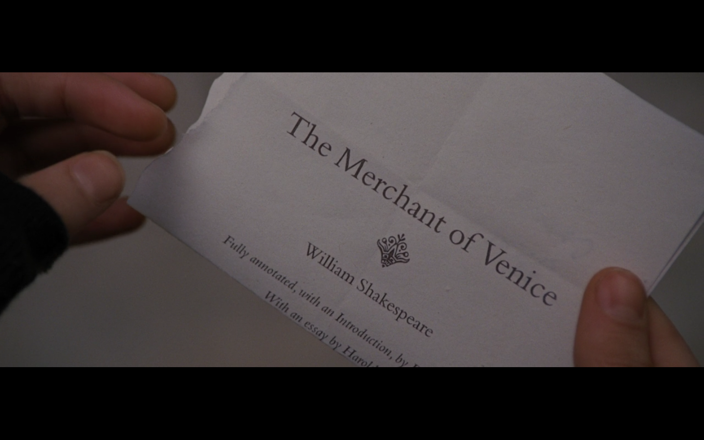 Why is the note on a page torn from The Merchant of Venice? This is some Da Vinci Code shit, you know it is. Did they leave for Venice? Go find the book she tore it out of. Please let this be a Da Vinci Code clue about an eyeless Jew.