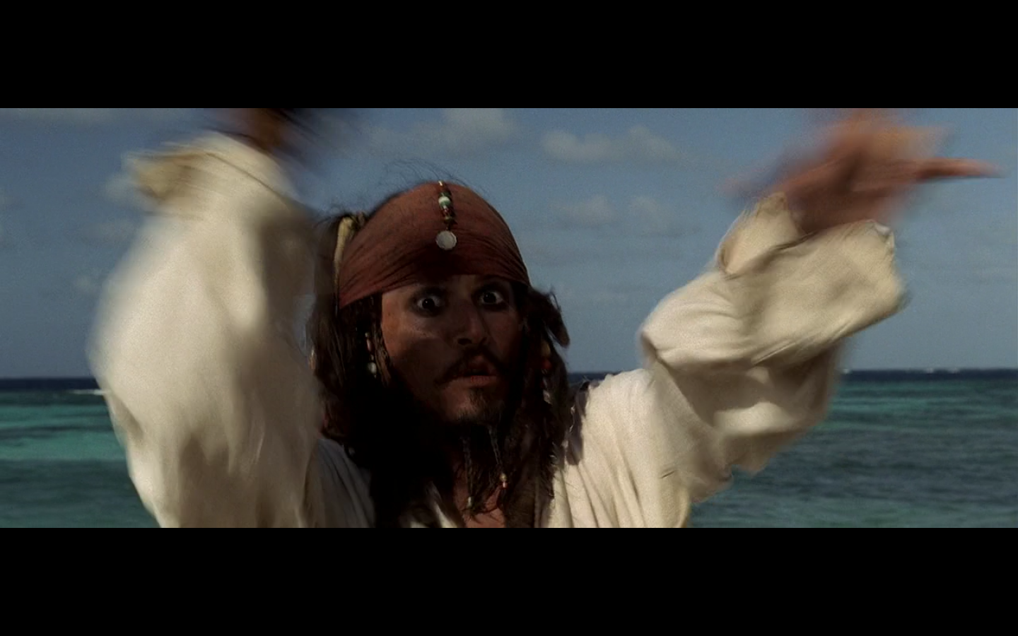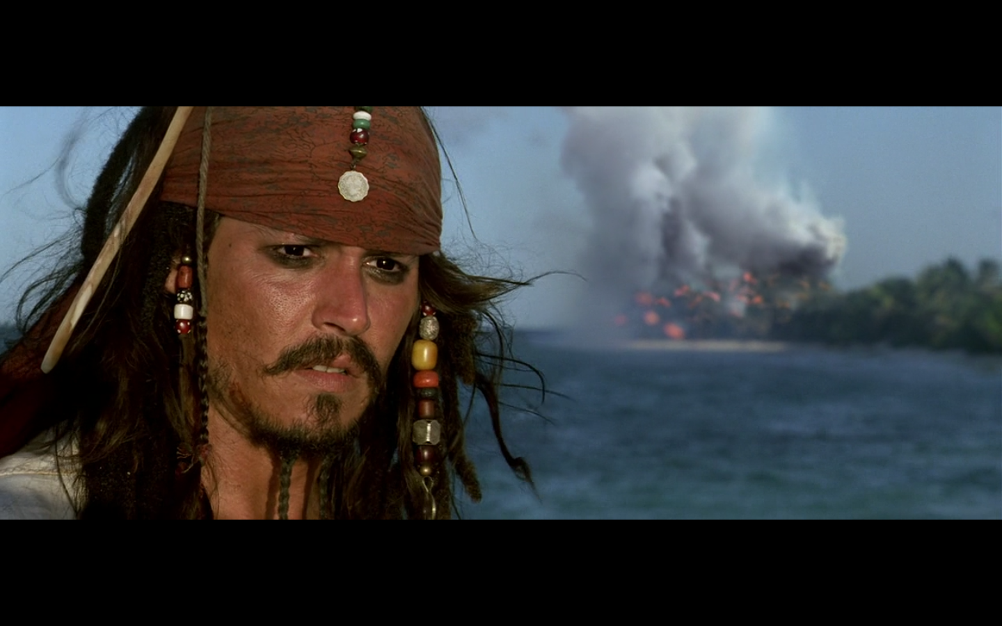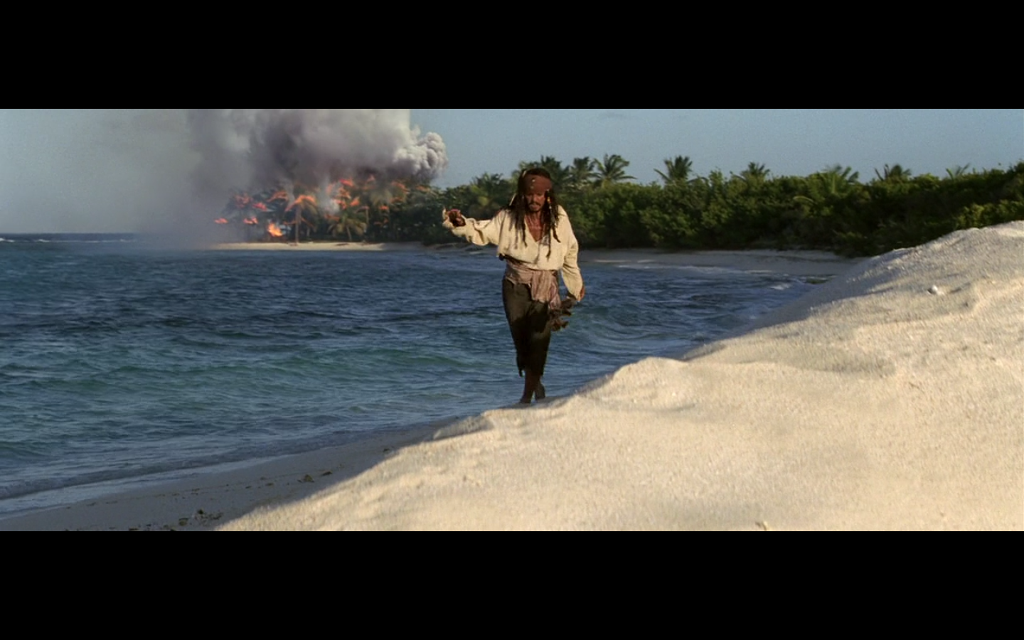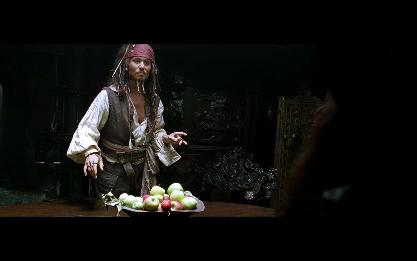 That’s a pretty intense moment from Barbossa. He’s just staring at this apple for a few seconds. “I wanna eat you, but I can’t. You think you’re better than me? Fuck you, apple, I still have power over you. How you like salt water? There you go.”