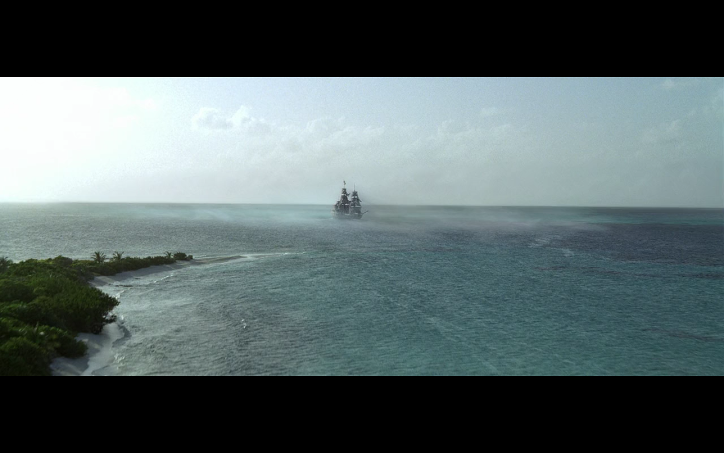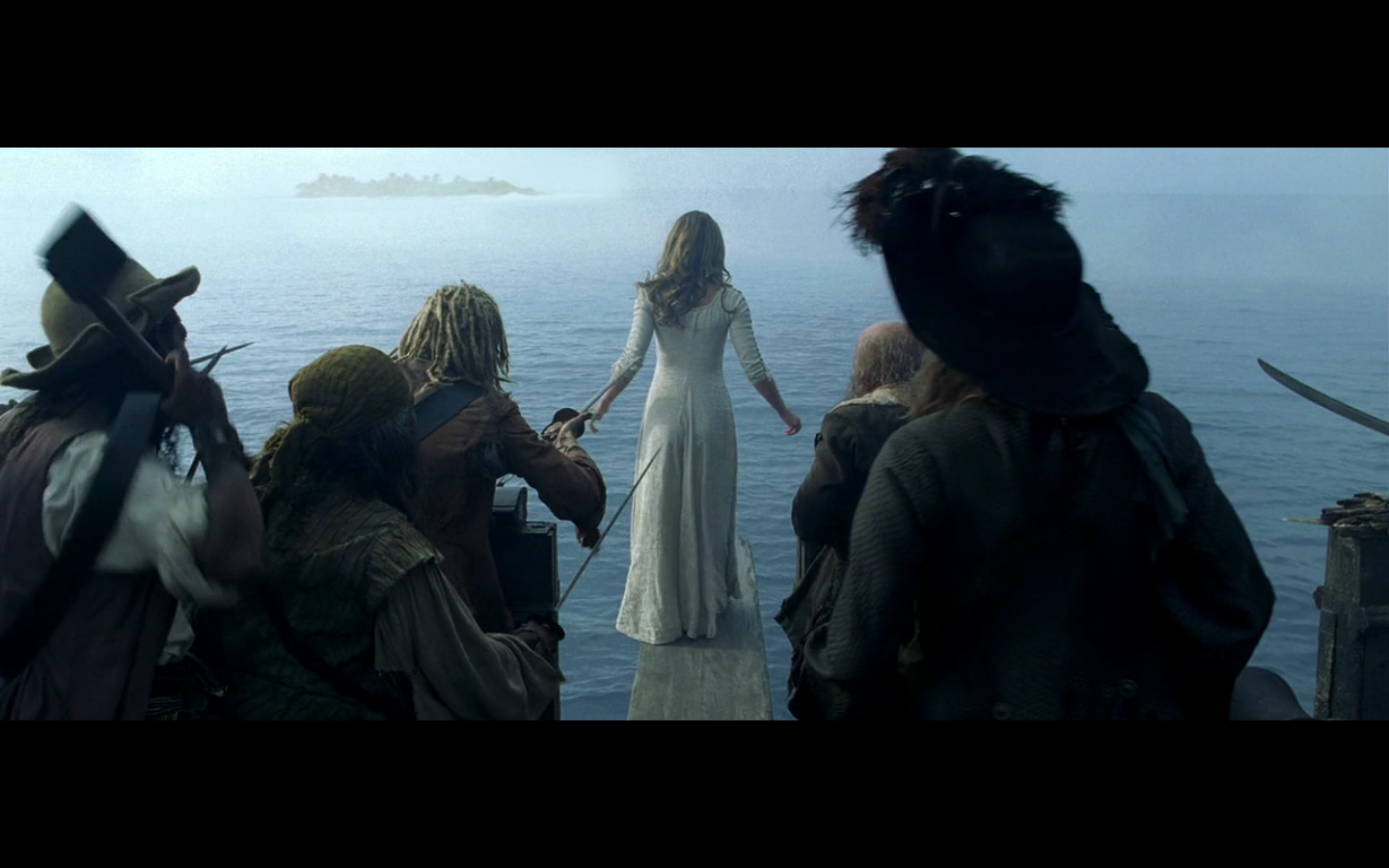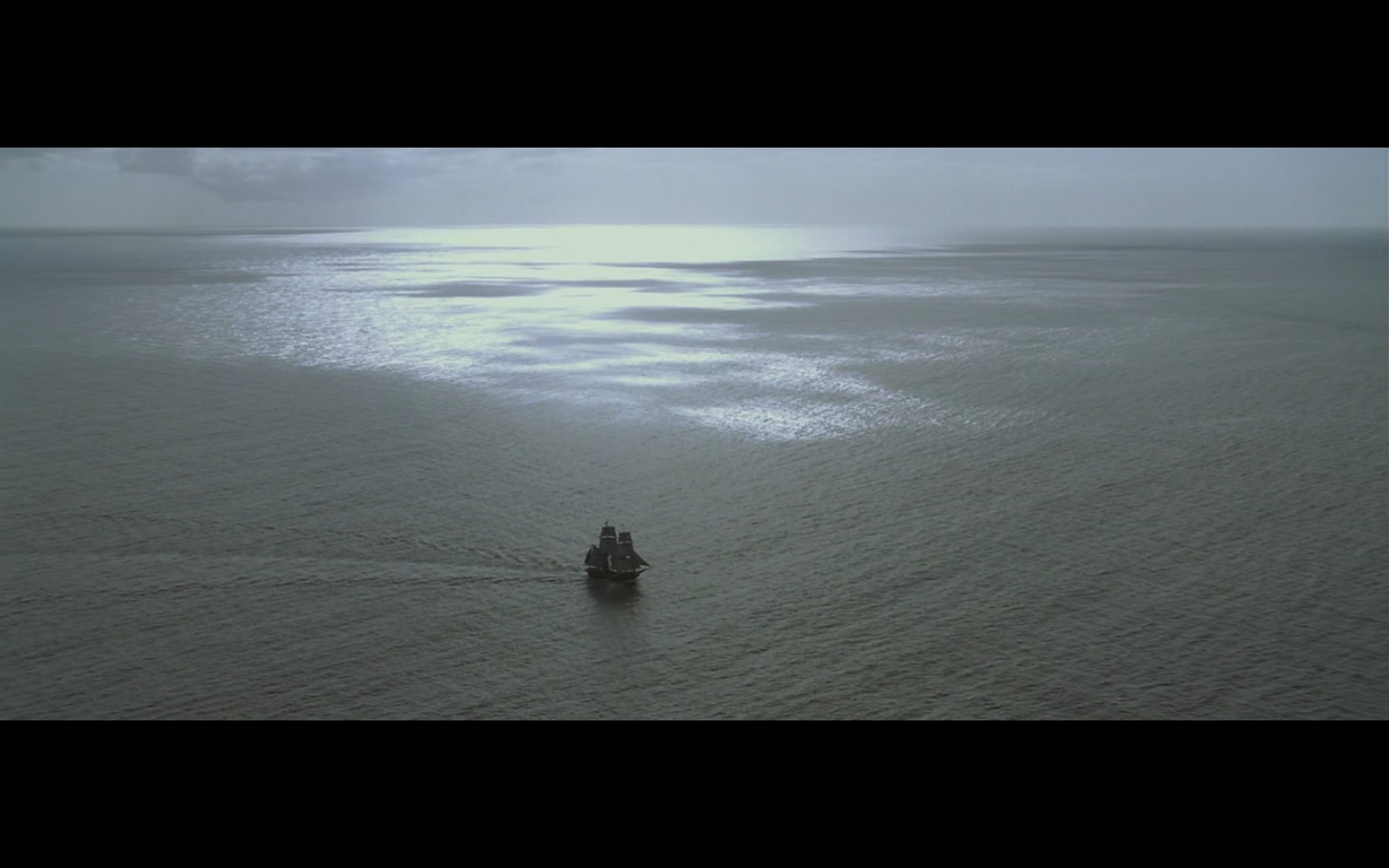 I love all of these. There’s no way these weren’t making it on. The first one is hands-down one of my favorite shots in the film. For a different, [not so much] lesser film, this could be a suitable poster image. You get the dreads, the beard, the skin, the eyeliner…it’s all there. And it’s on a blank blue background (try saying those three words five times fast). I think that last point is why all of these work. The second image is him looking satisfied as hell, probably with himself. And the background is this velvety, black mist. And then there’s Elizabeth up close, with only sky and ocean taking up the other half of the frame. Any other time of day or night, and this doesn’t work — but at JUST this time, the sun hanging low in the sky refracts a huge amount of light off the water, which gives the sea and the sky a similar color. The sky is whiter and darker than usual, and the water is whiter and brighter than usual. I love how that worked out to give the background a washed-out sort of feel, as opposed to the robin’s egg blue – navy blue horizontal split you’d get anytime from like 6am til like 8pm.