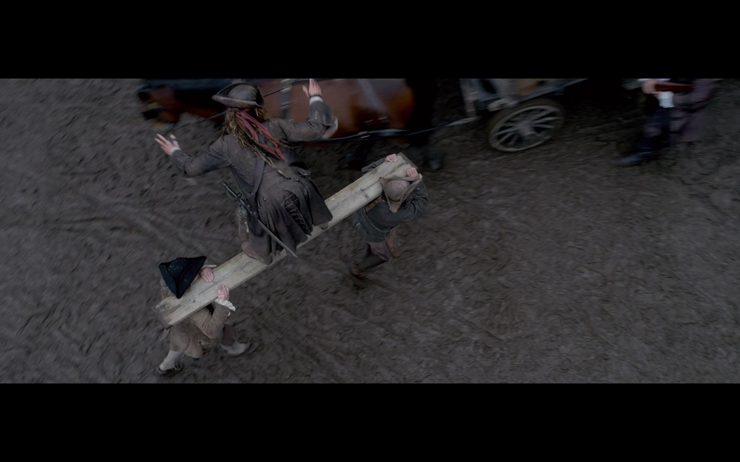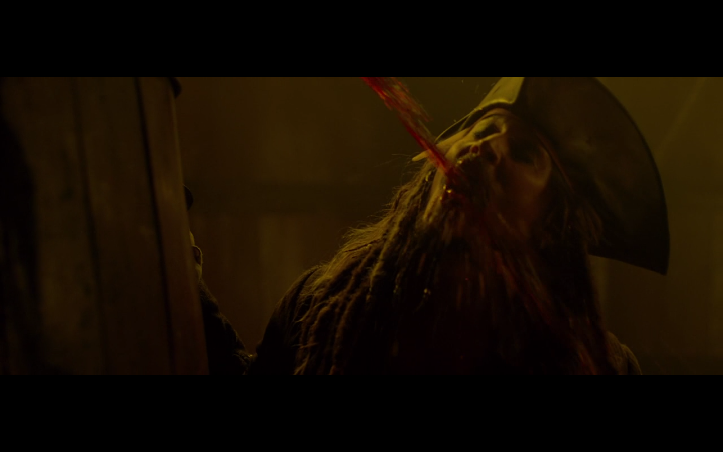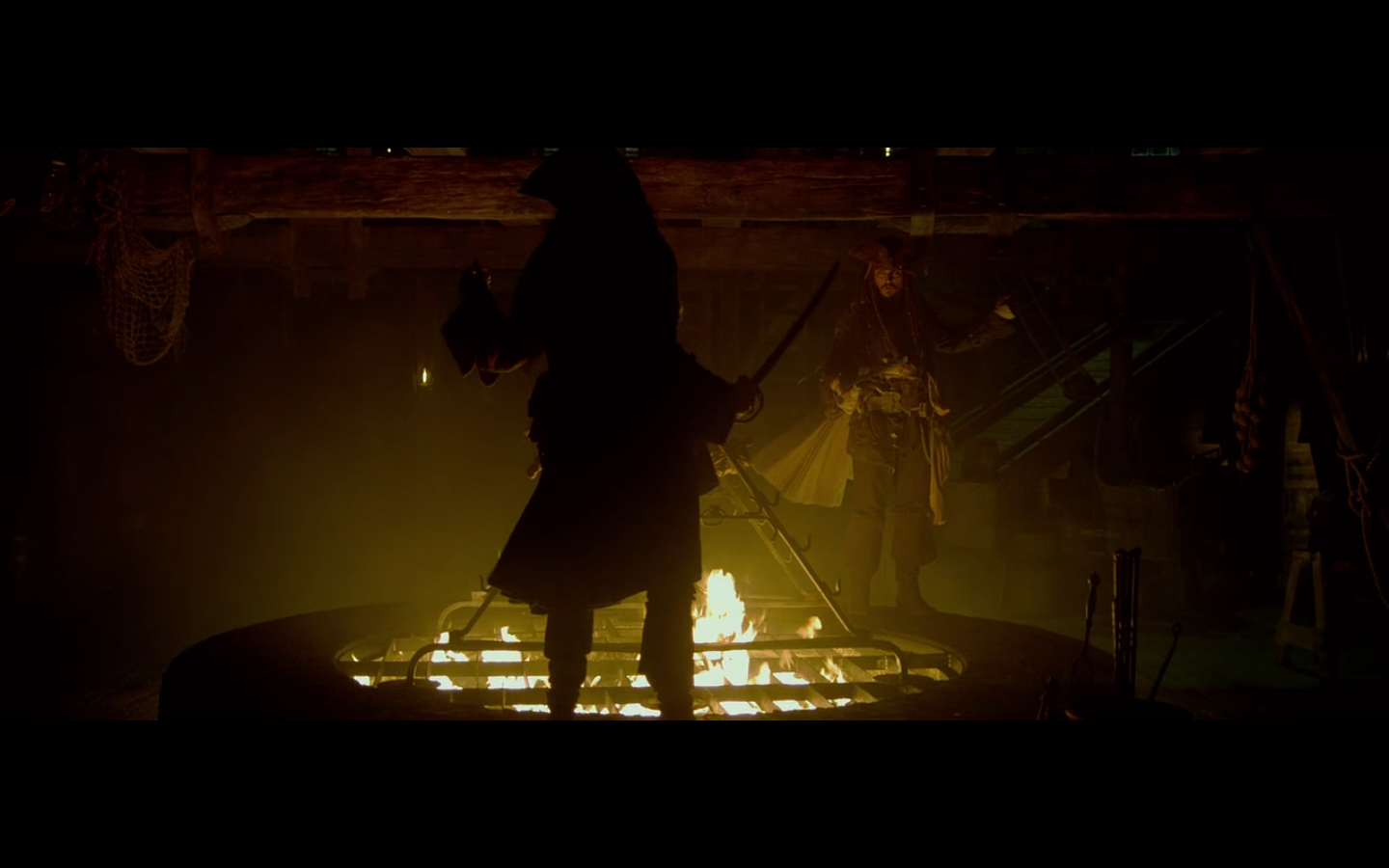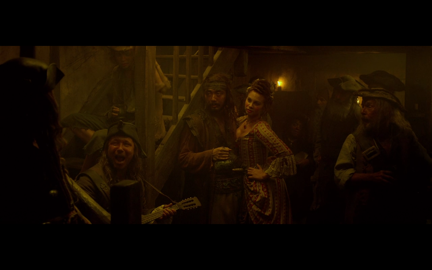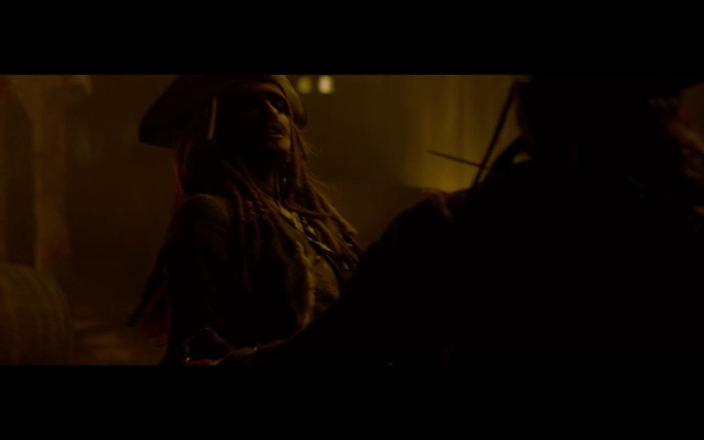 Remember how the other two pre-title sequences went? We met Elizabeth, Norrington, Gibbs and Will. We got characterization on all of them, and set up what was to essentially be the major story arc and conflict in the film. The other one — they hung like a hundred pirates until they sang, and Beckett said something that was cold-blooded as shit.