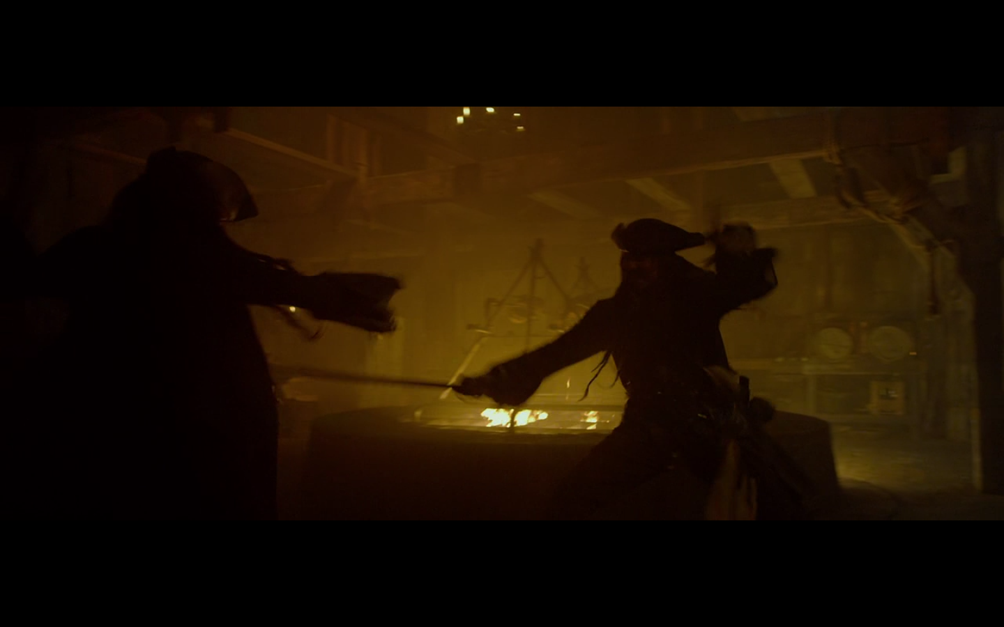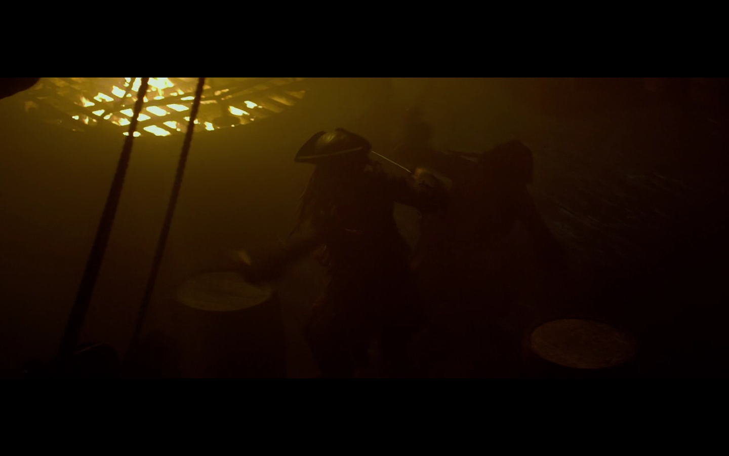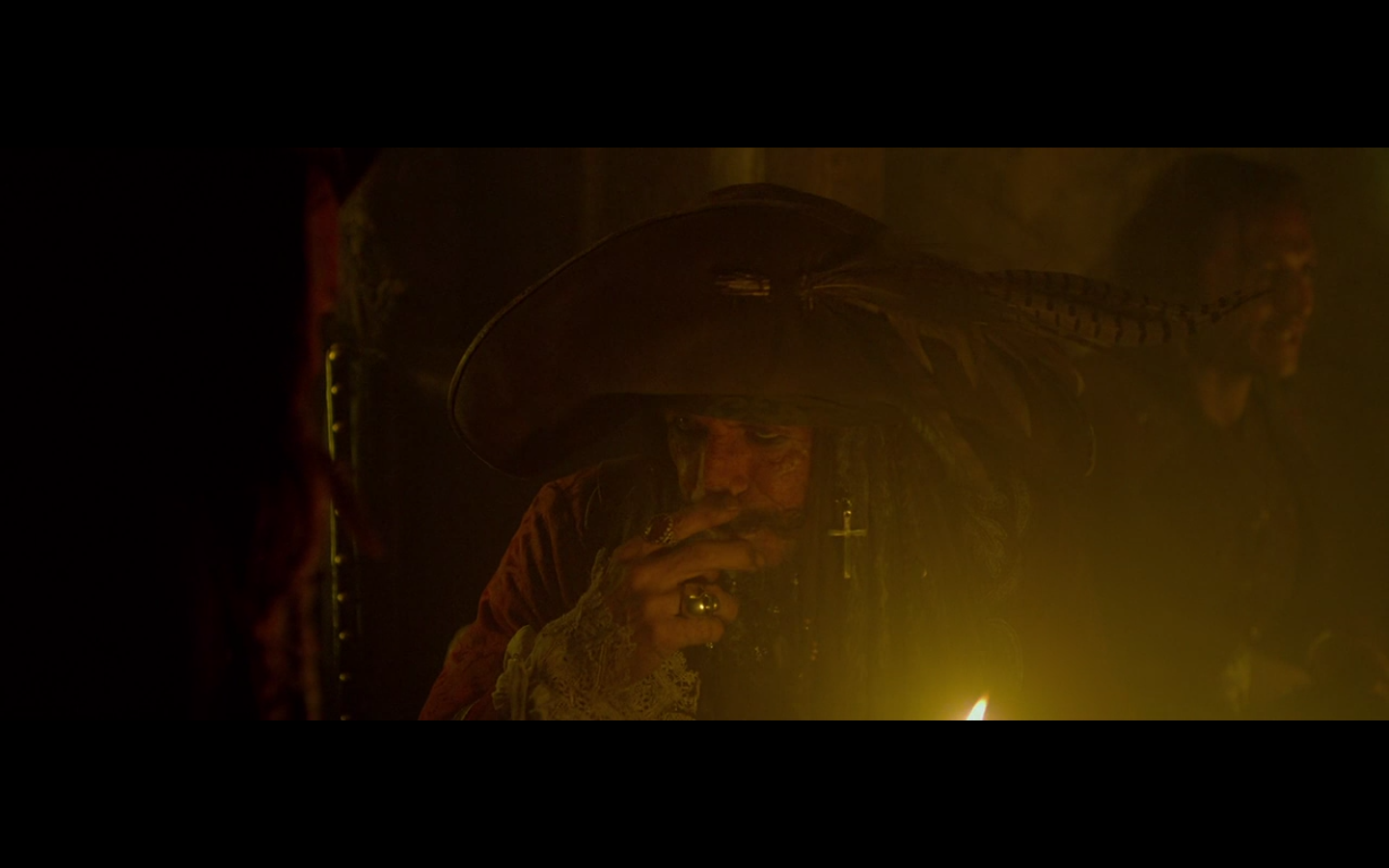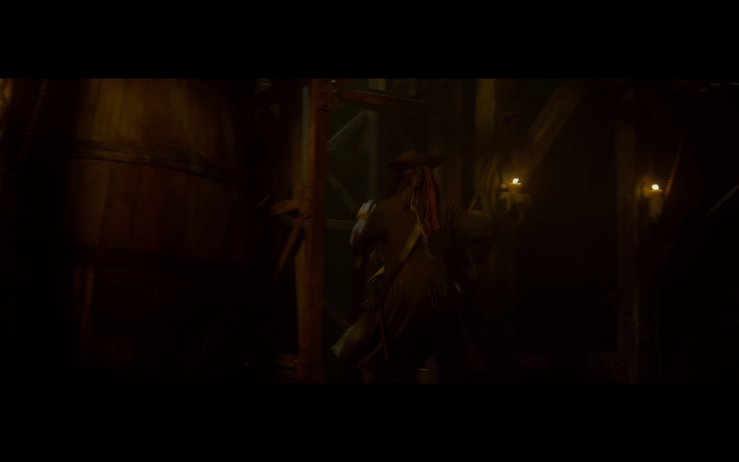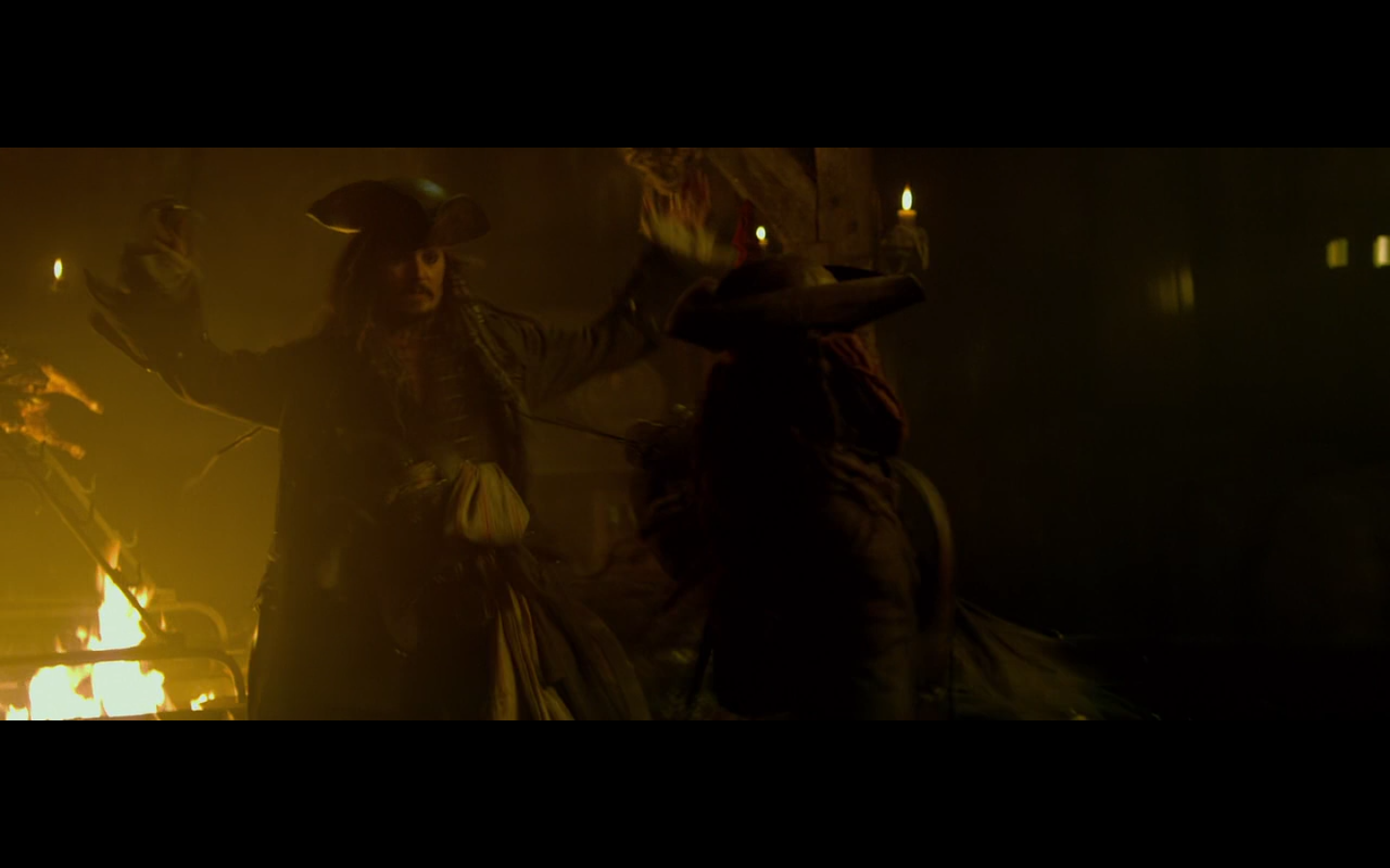 Remember how the other two pre-title sequences went? We met Elizabeth, Norrington, Gibbs and Will. We got characterization on all of them, and set up what was to essentially be the major story arc and conflict in the film. The other one — they hung like a hundred pirates until they sang, and Beckett said something that was cold-blooded as shit.