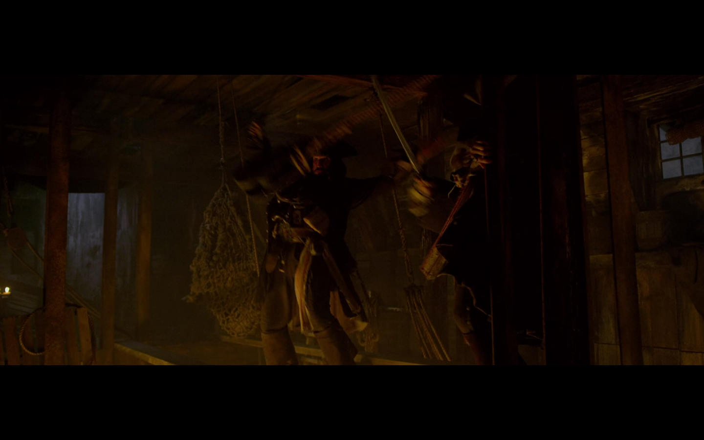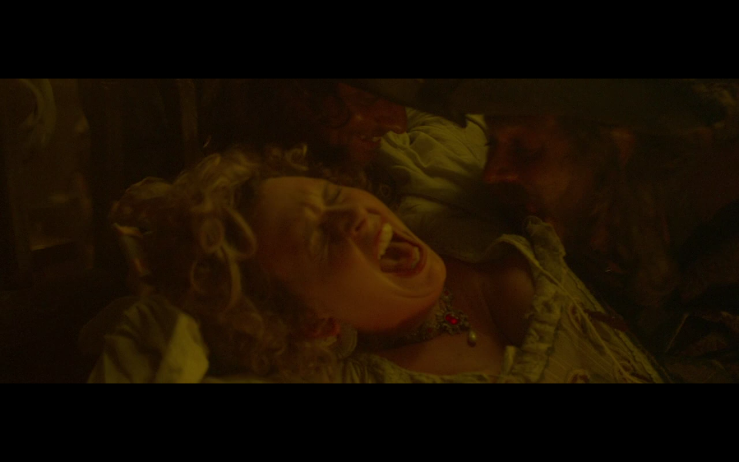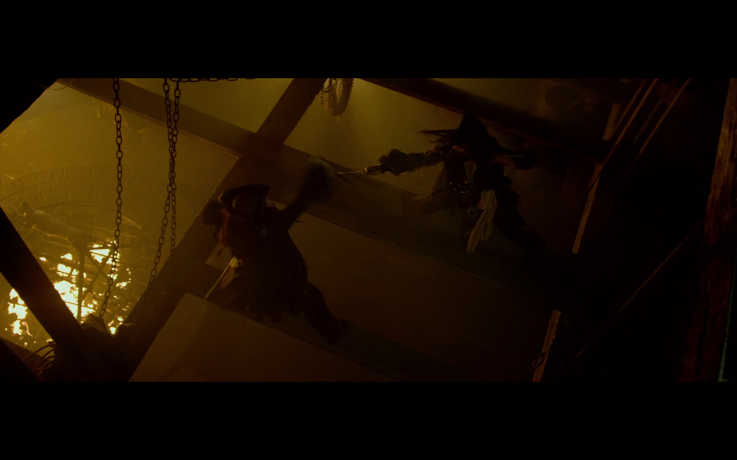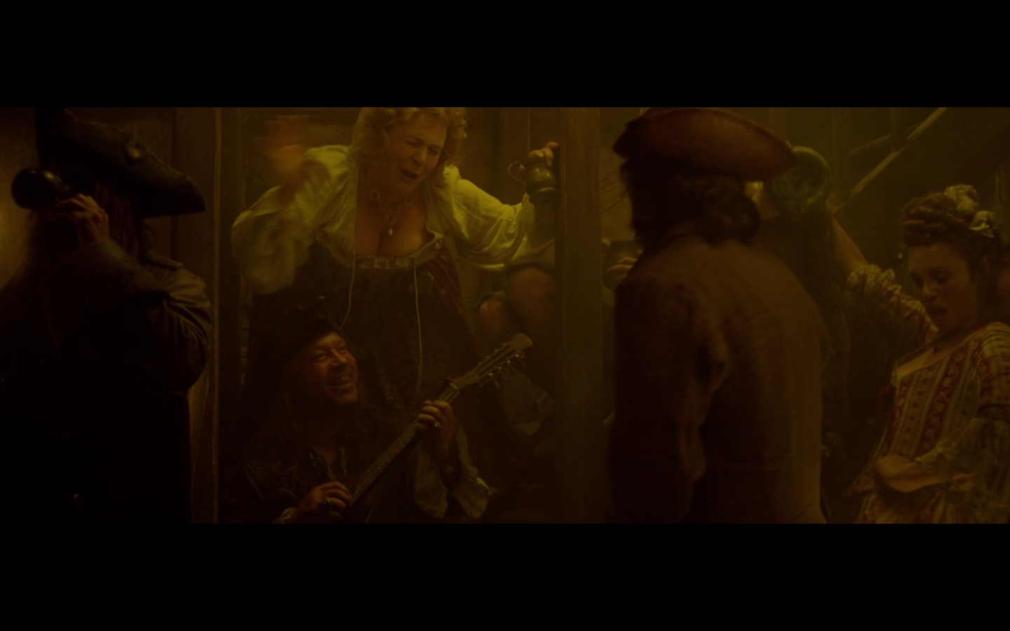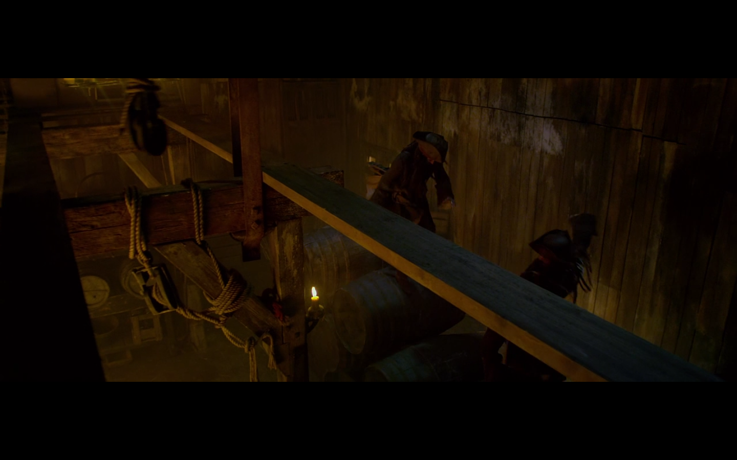 Remember how the other two pre-title sequences went? We met Elizabeth, Norrington, Gibbs and Will. We got characterization on all of them, and set up what was to essentially be the major story arc and conflict in the film. The other one — they hung like a hundred pirates until they sang, and Beckett said something that was cold-blooded as shit.