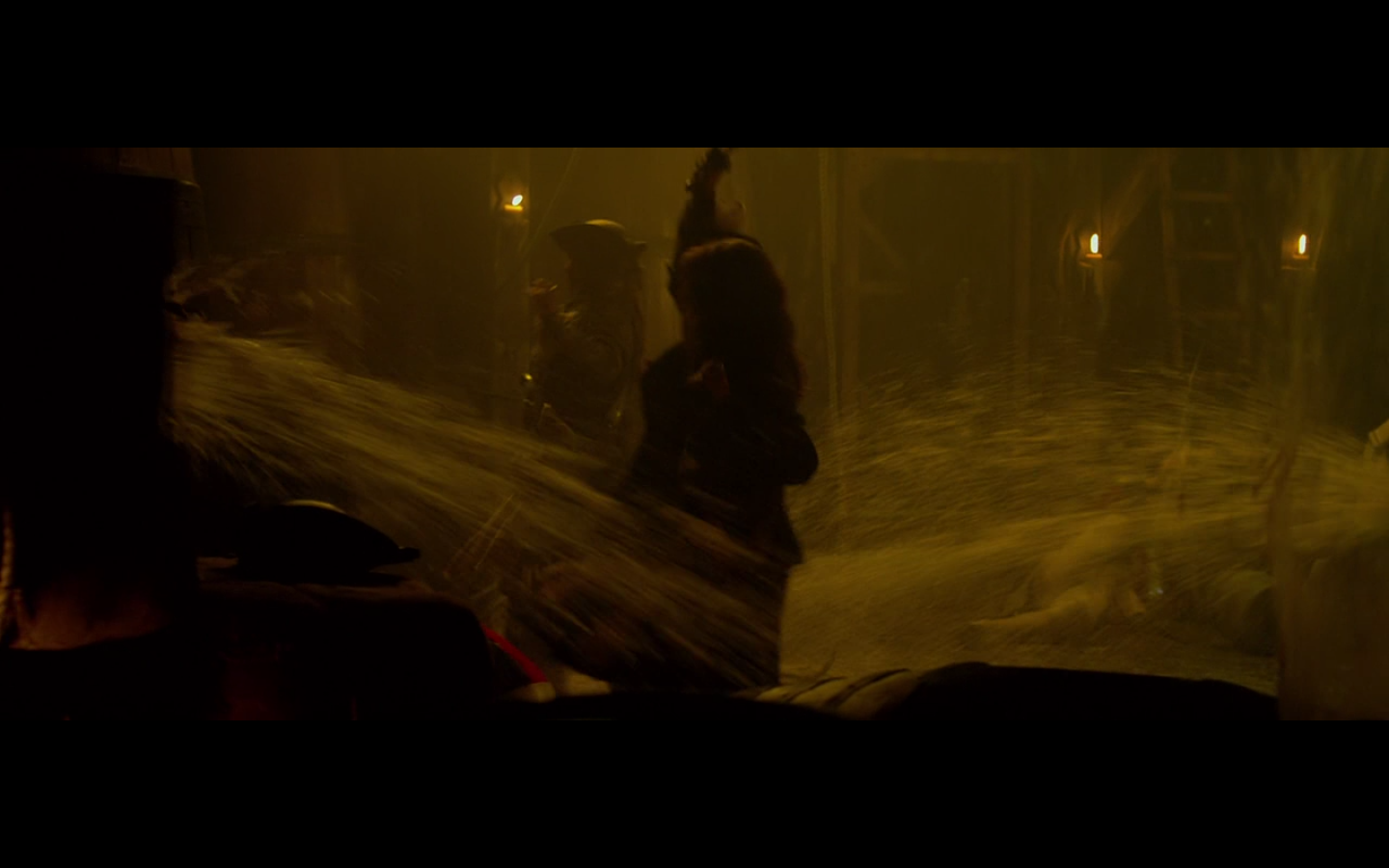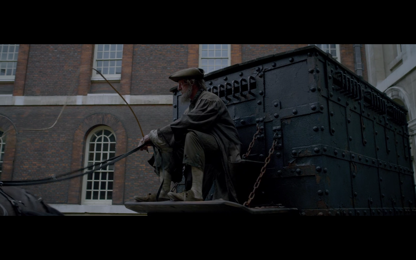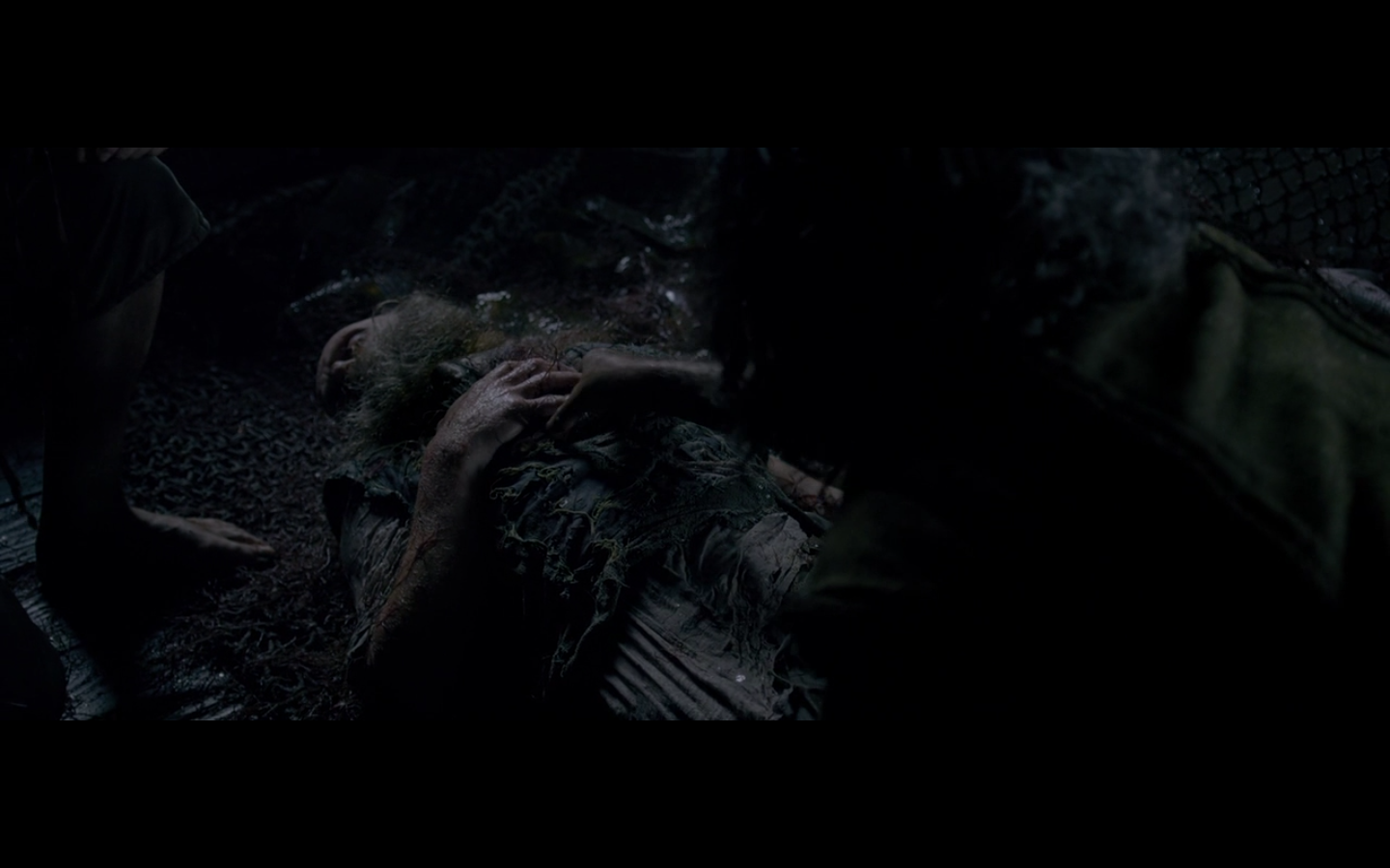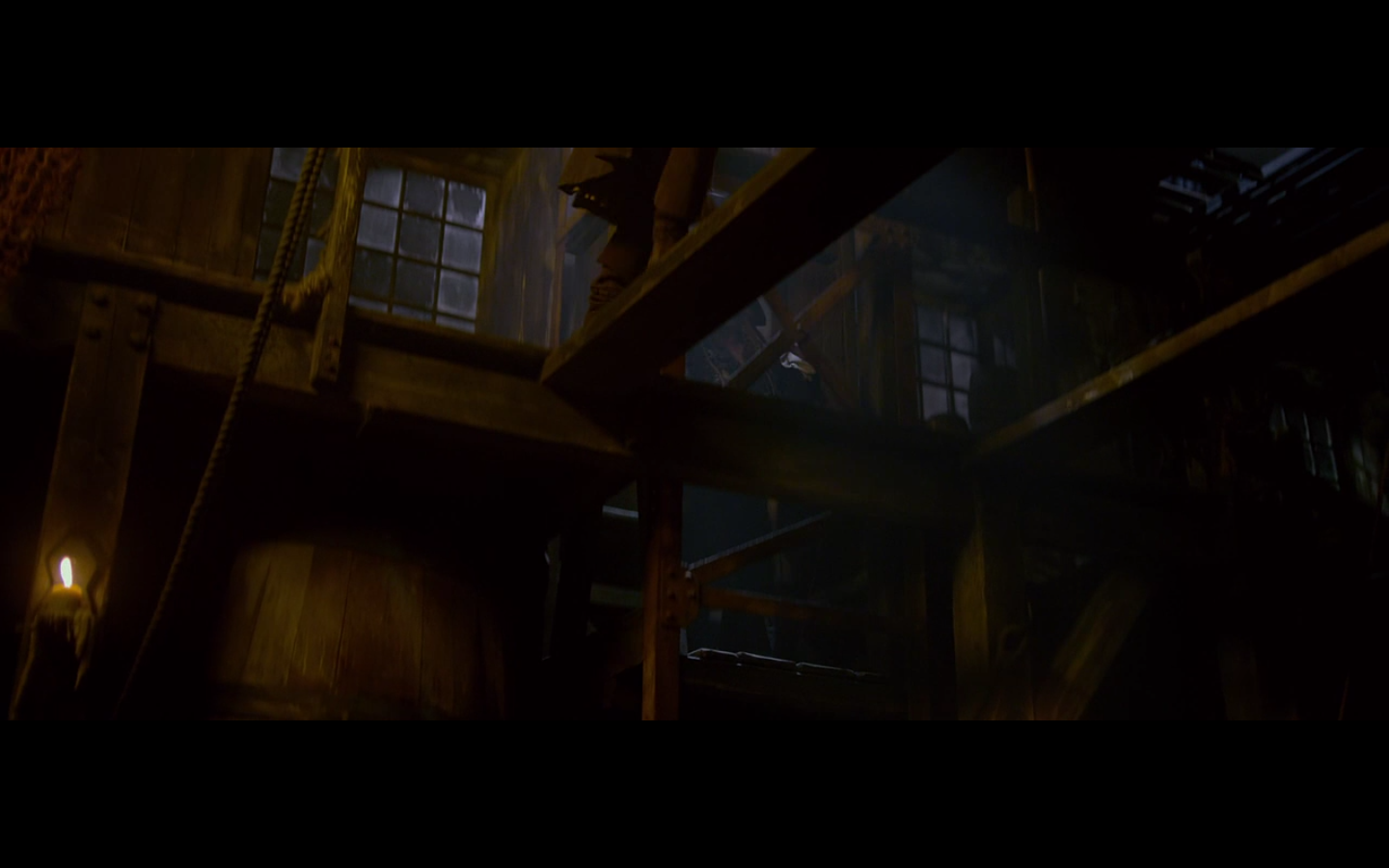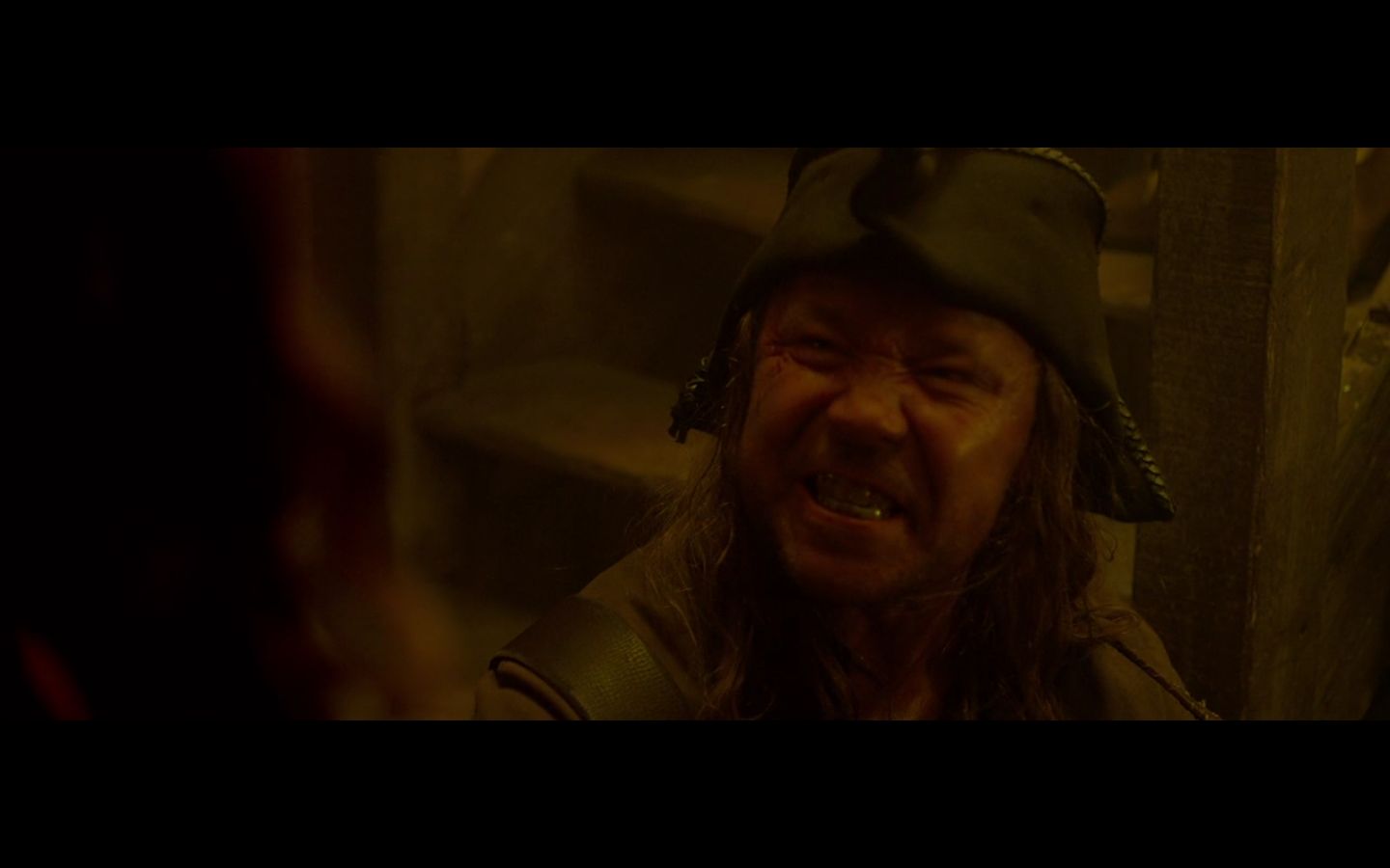 Remember how the other two pre-title sequences went? We met Elizabeth, Norrington, Gibbs and Will. We got characterization on all of them, and set up what was to essentially be the major story arc and conflict in the film. The other one — they hung like a hundred pirates until they sang, and Beckett said something that was cold-blooded as shit.