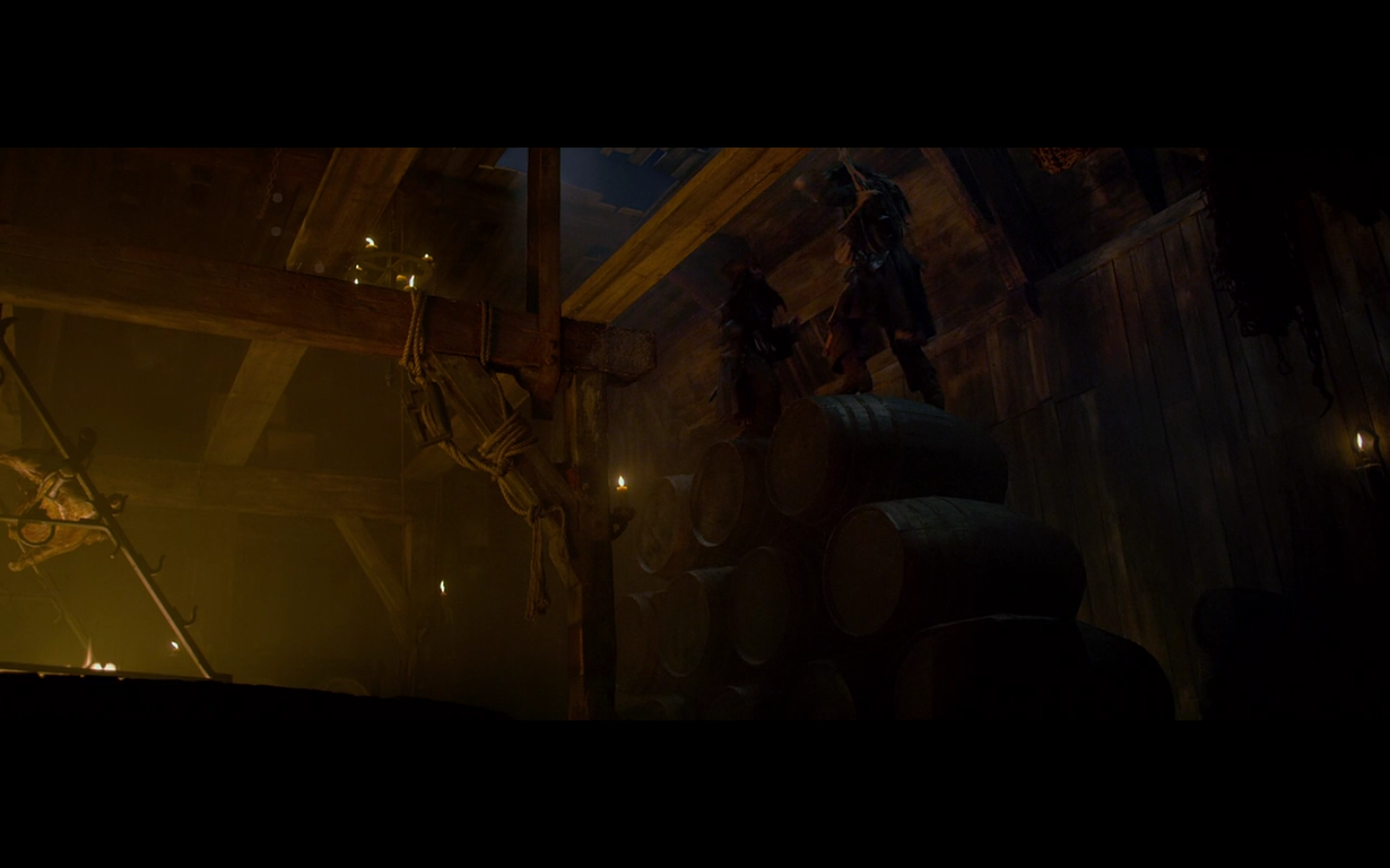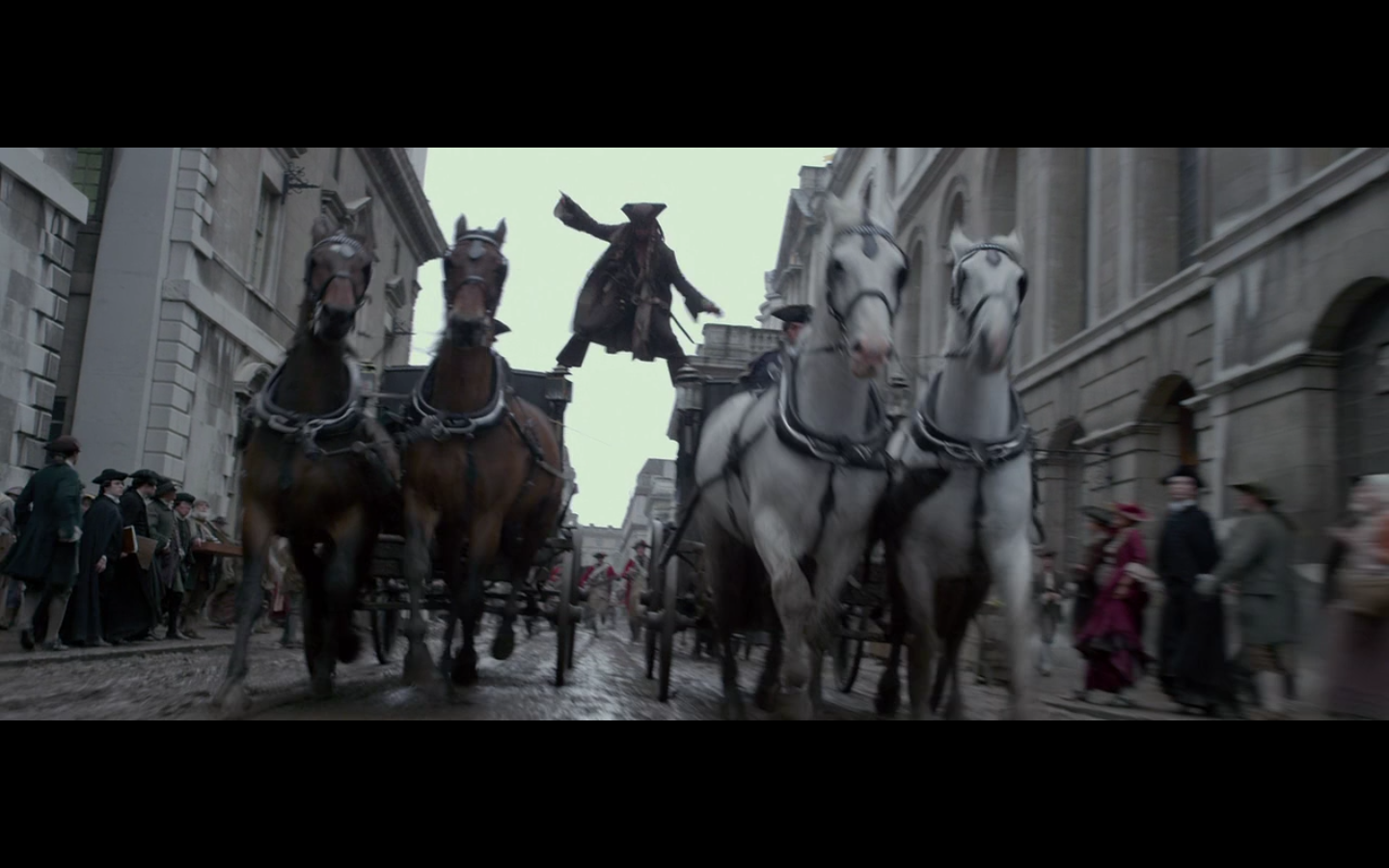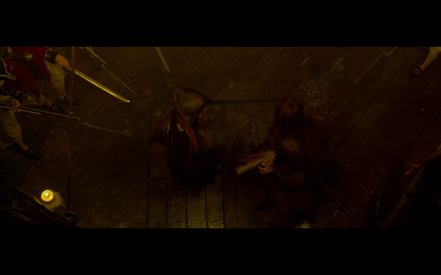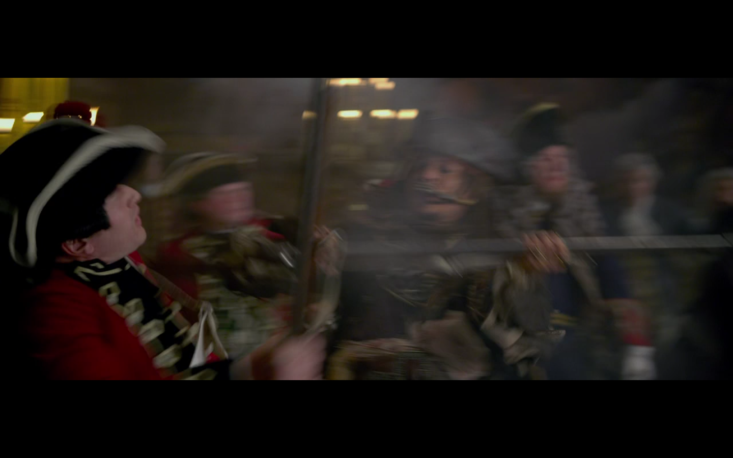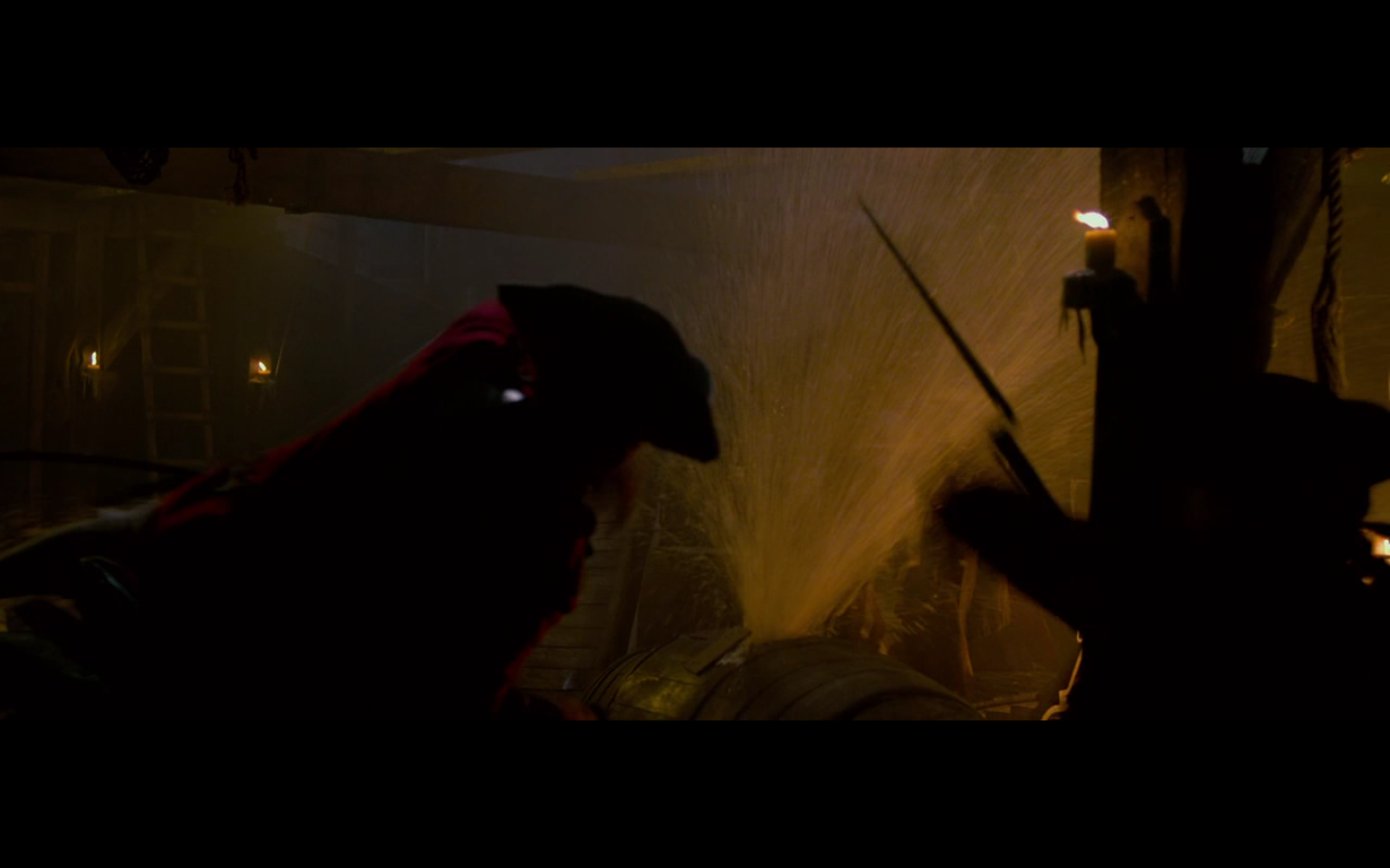 Remember how the other two pre-title sequences went? We met Elizabeth, Norrington, Gibbs and Will. We got characterization on all of them, and set up what was to essentially be the major story arc and conflict in the film. The other one — they hung like a hundred pirates until they sang, and Beckett said something that was cold-blooded as shit.