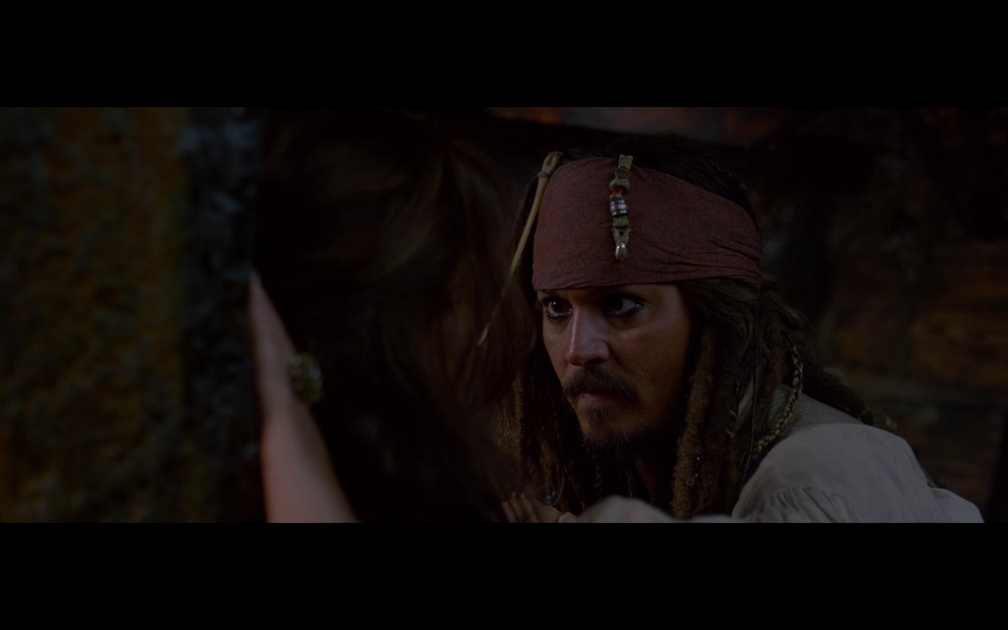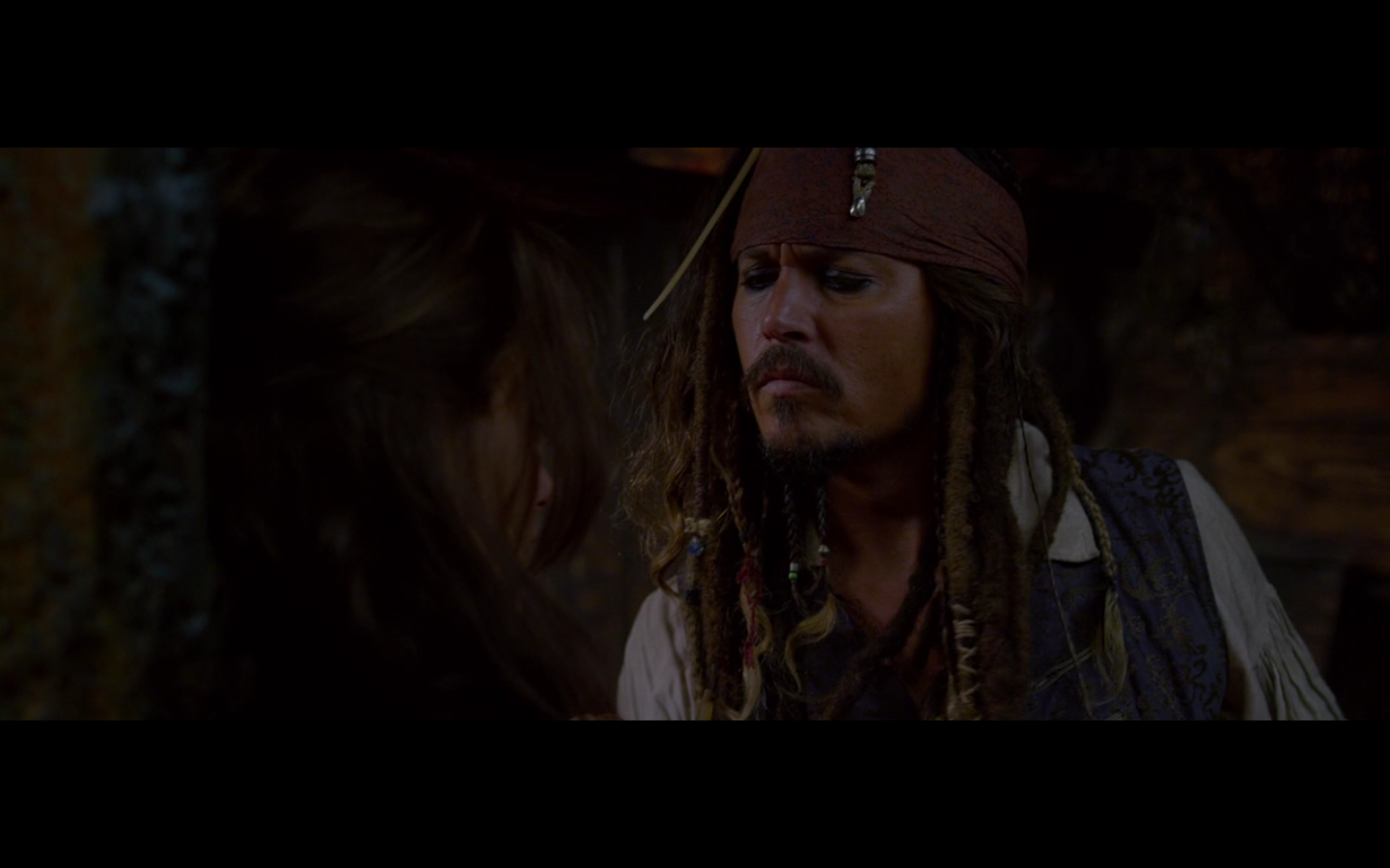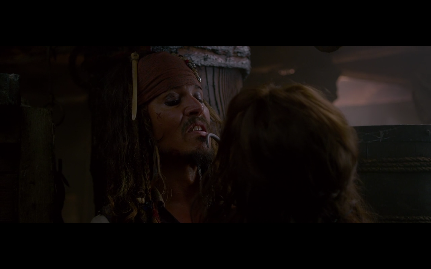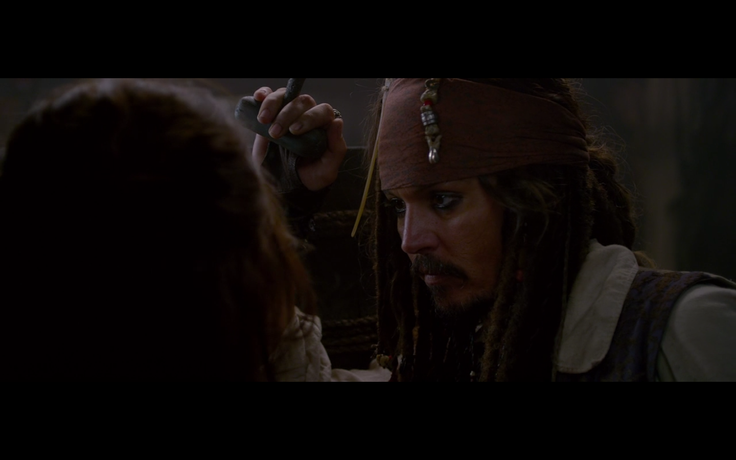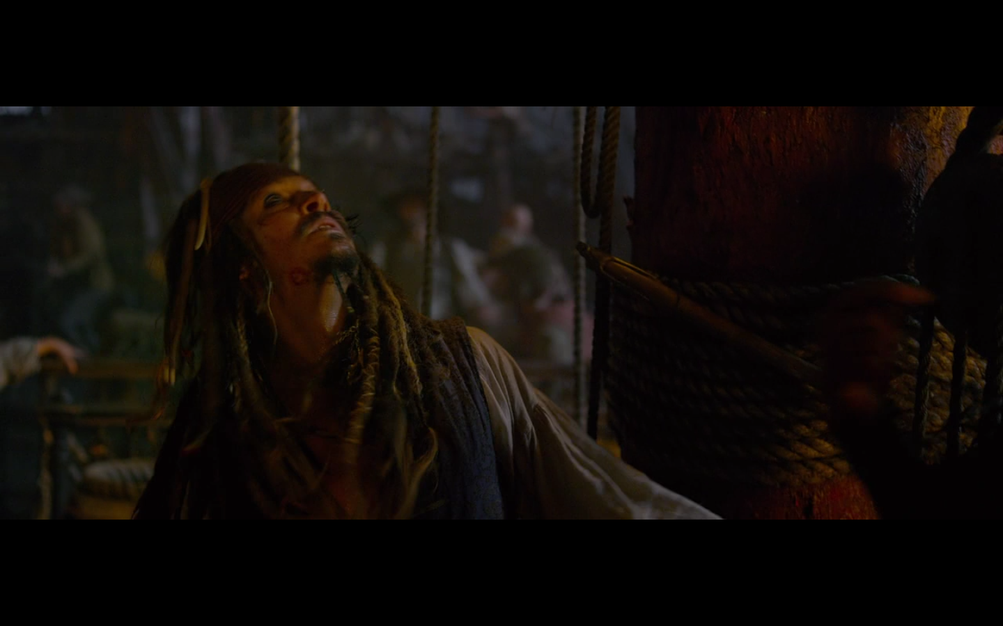 I hate this. He says that there’s been a horrible mistake, and that’s exactly what it is. Just like Barbossa and the leg, Jack has now lost status. Which makes me crazy. Even more so than the character himself, I’m like, “NO, YOU DON’T UNDERSTAND! HE DOESN’T SWAB DECKS! HE’S A PIRATE LORD.” For whatever reason, it bothers me.