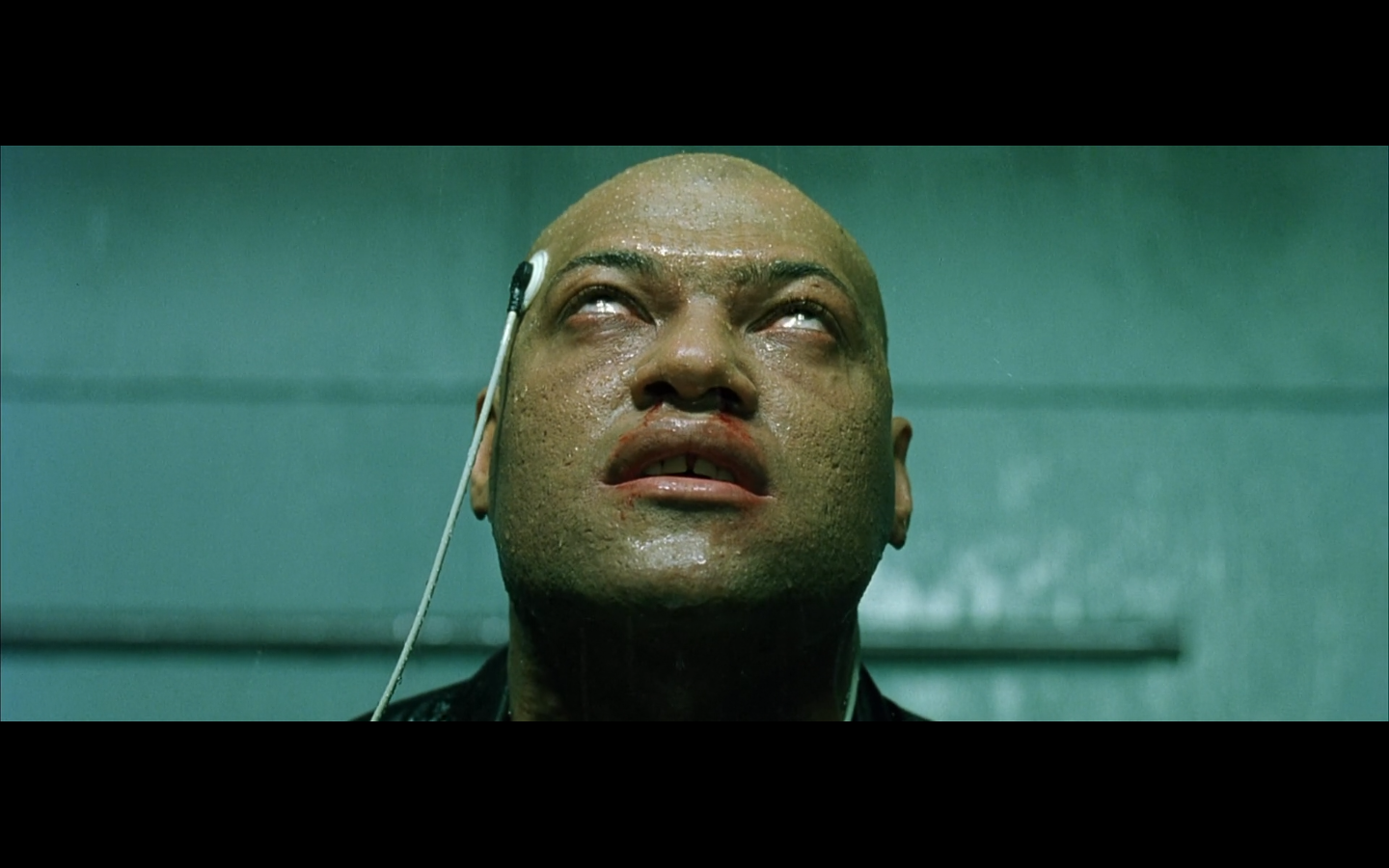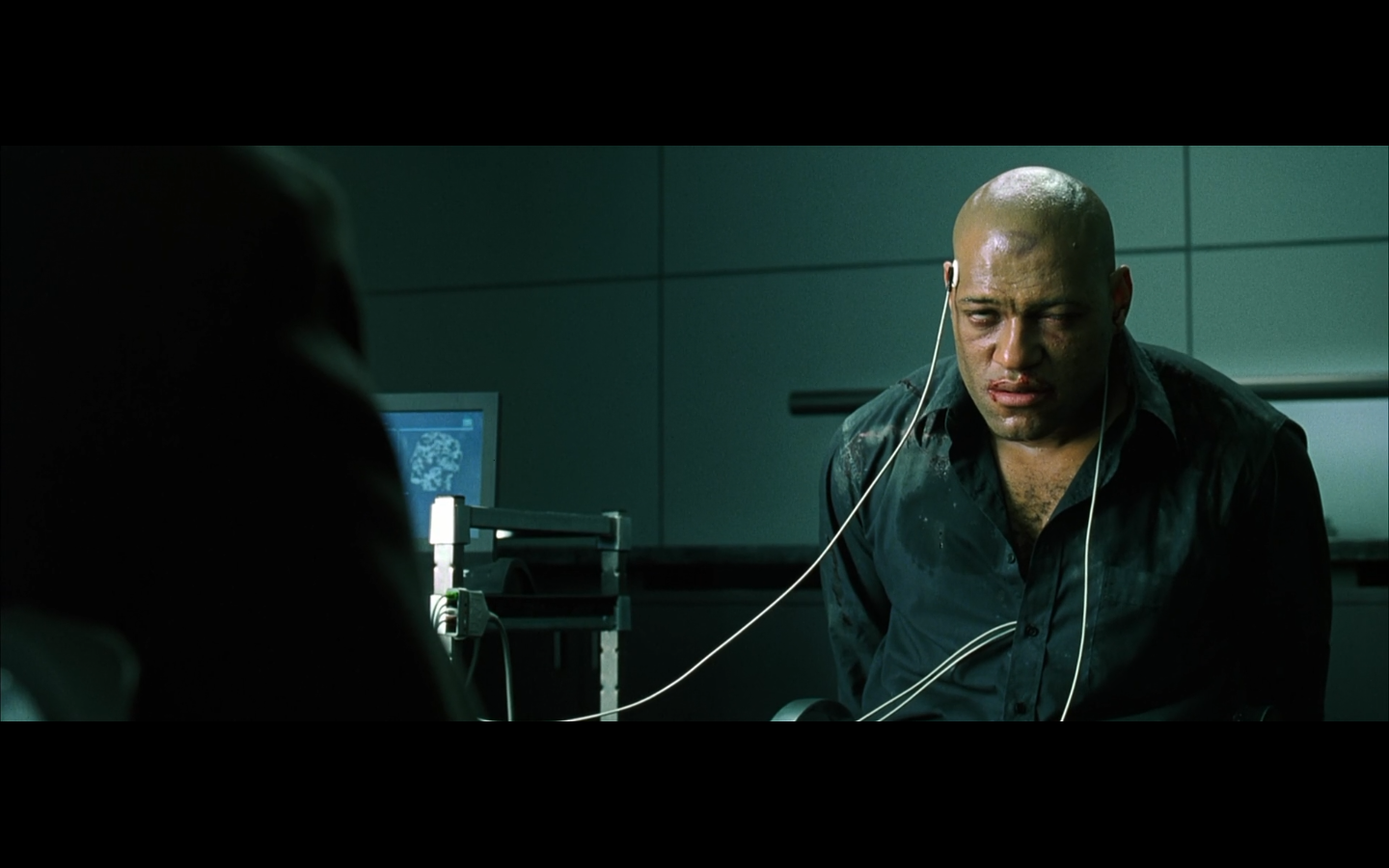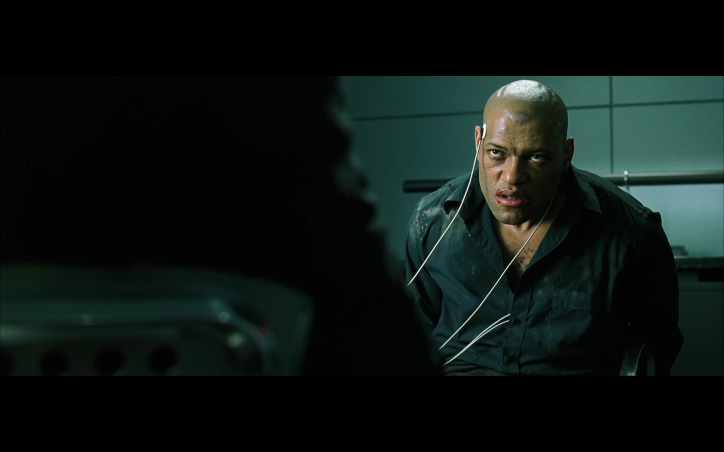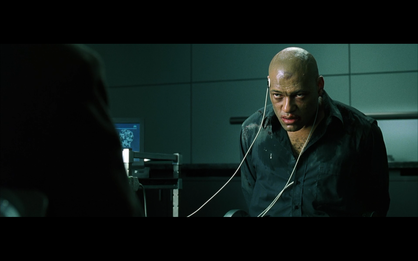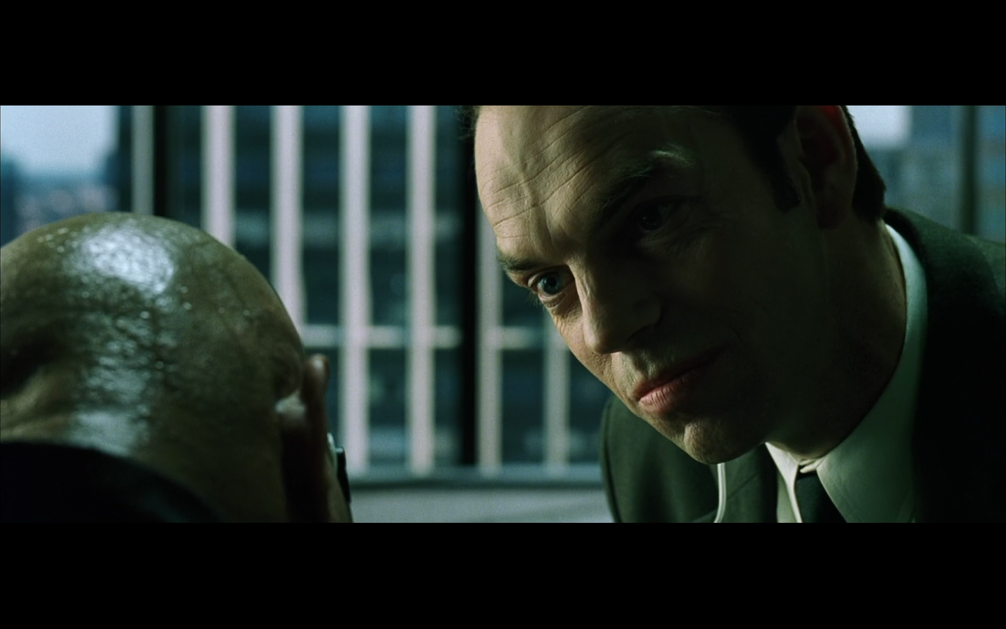 These scenes are probably my favorite in the franchise. Morpheus sitting there silently and Hugo Weaving just talks at him joyously.