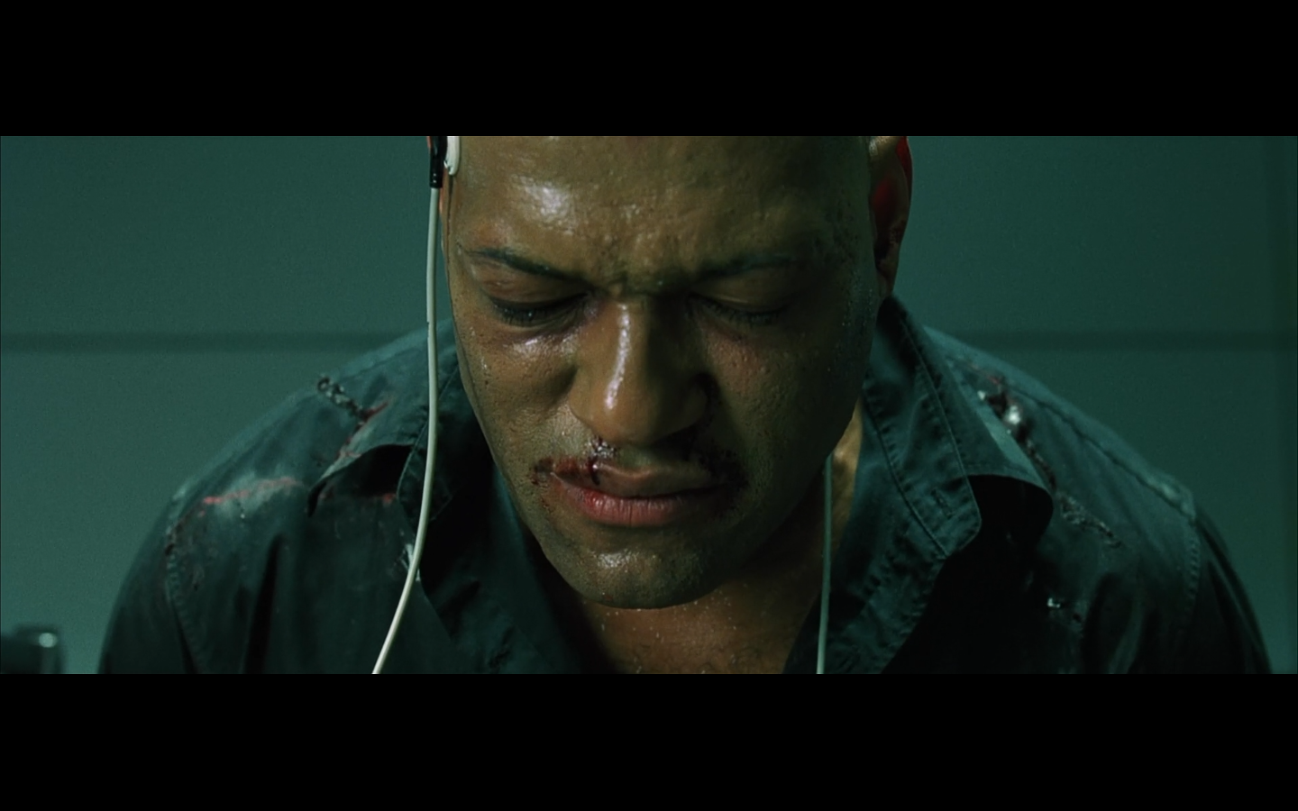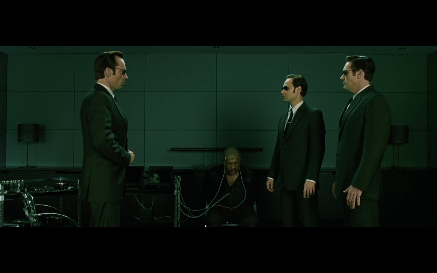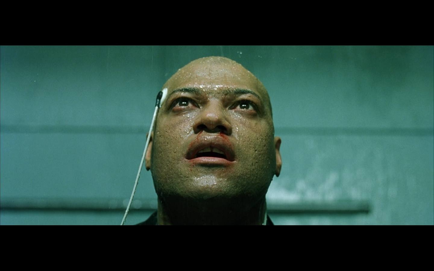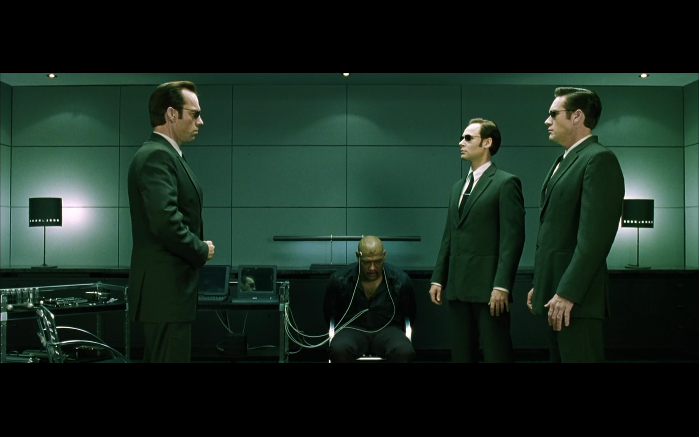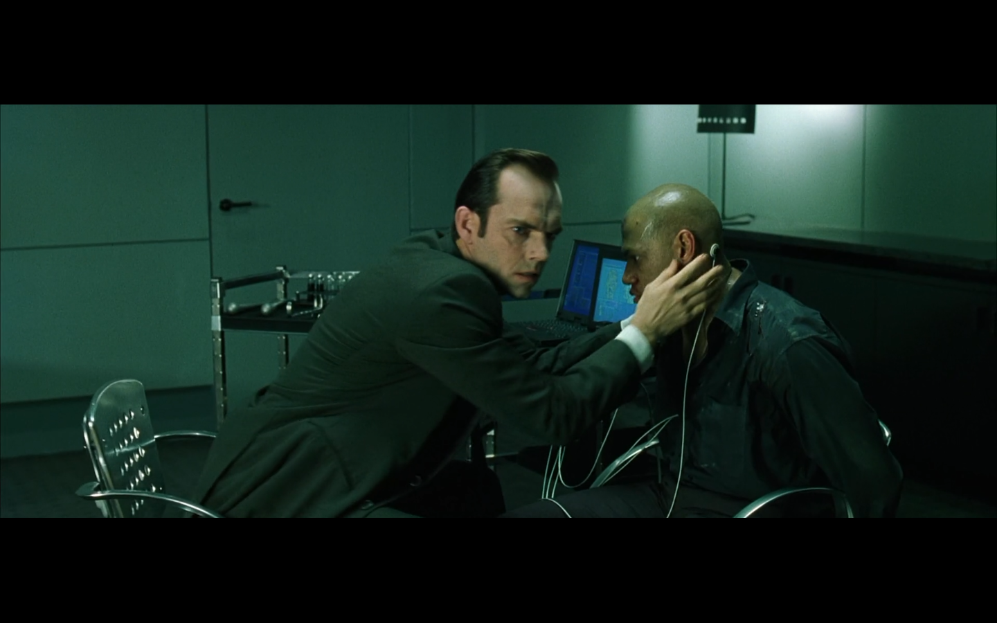 These scenes are probably my favorite in the franchise. Morpheus sitting there silently and Hugo Weaving just talks at him joyously.