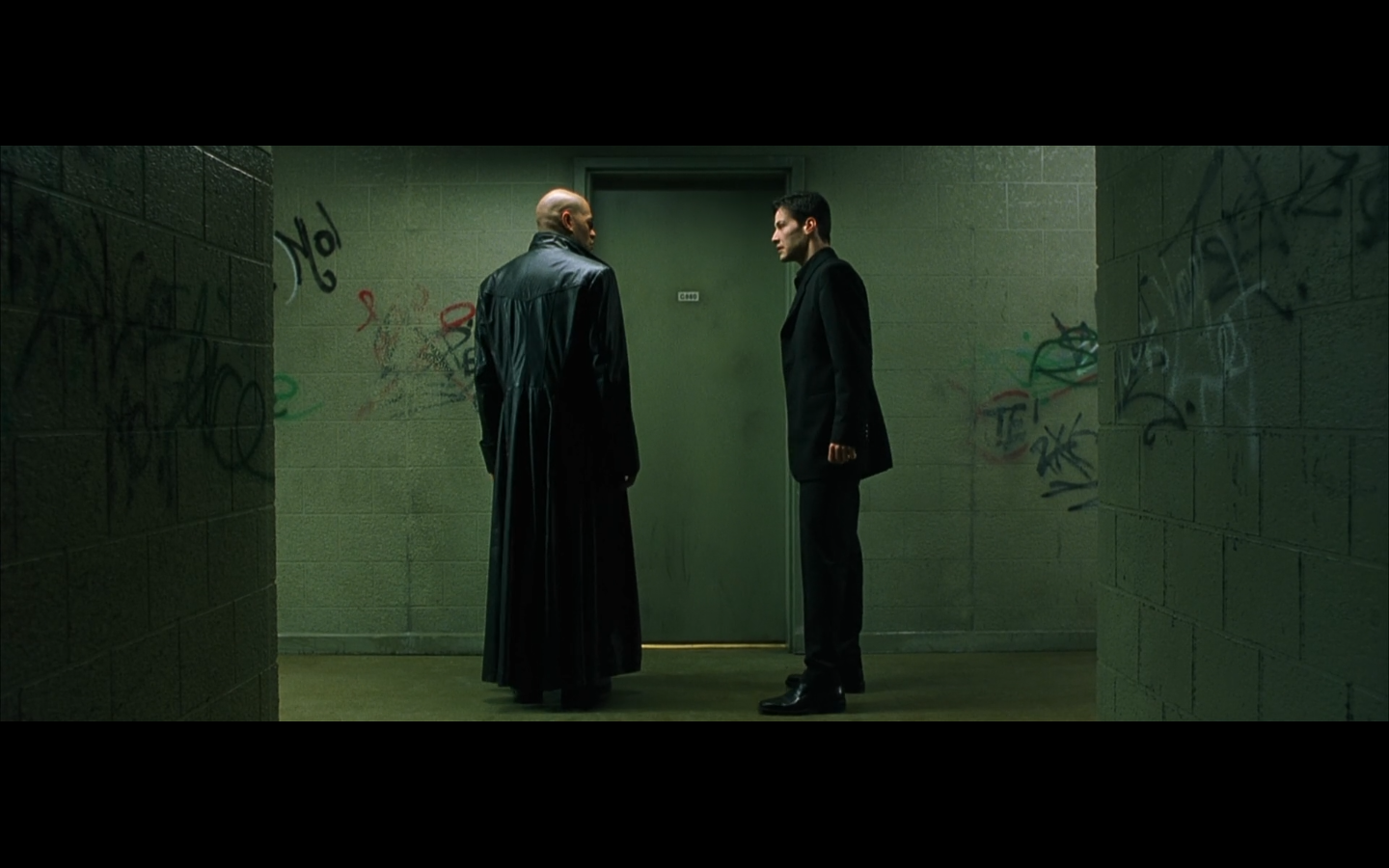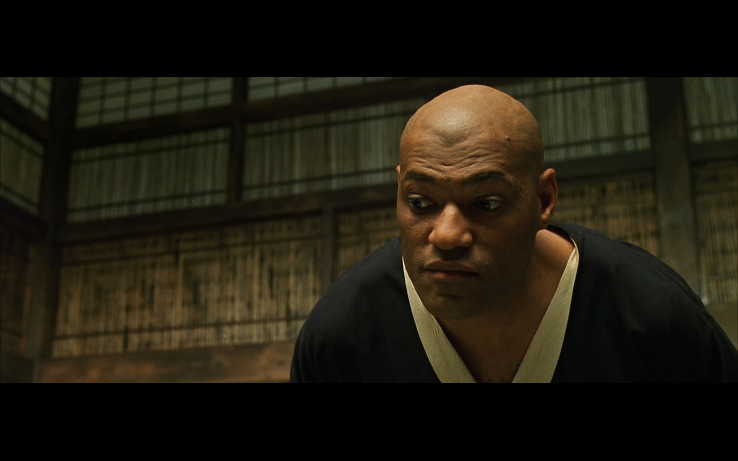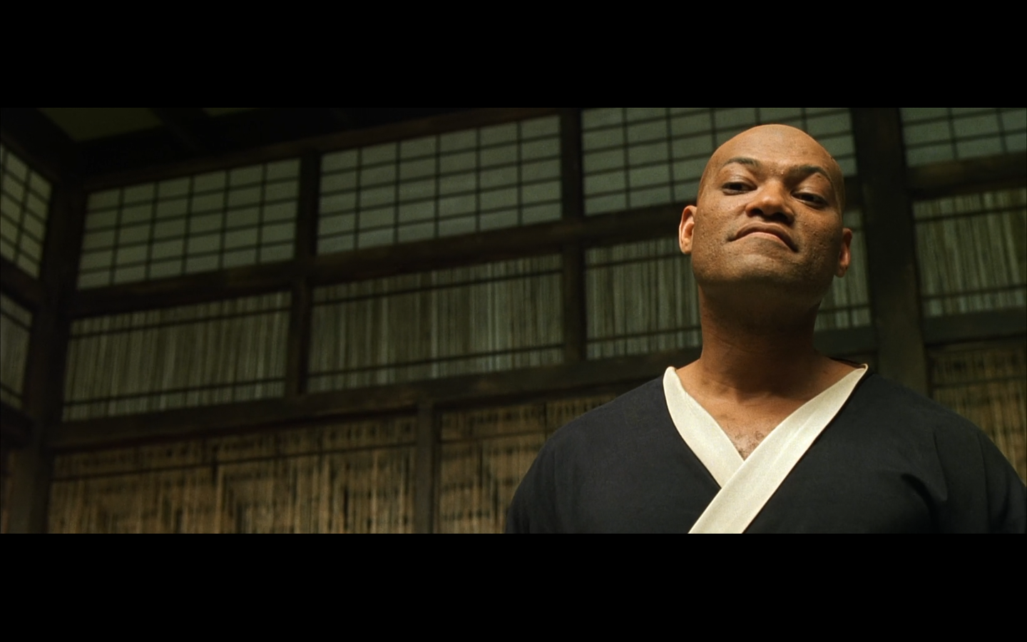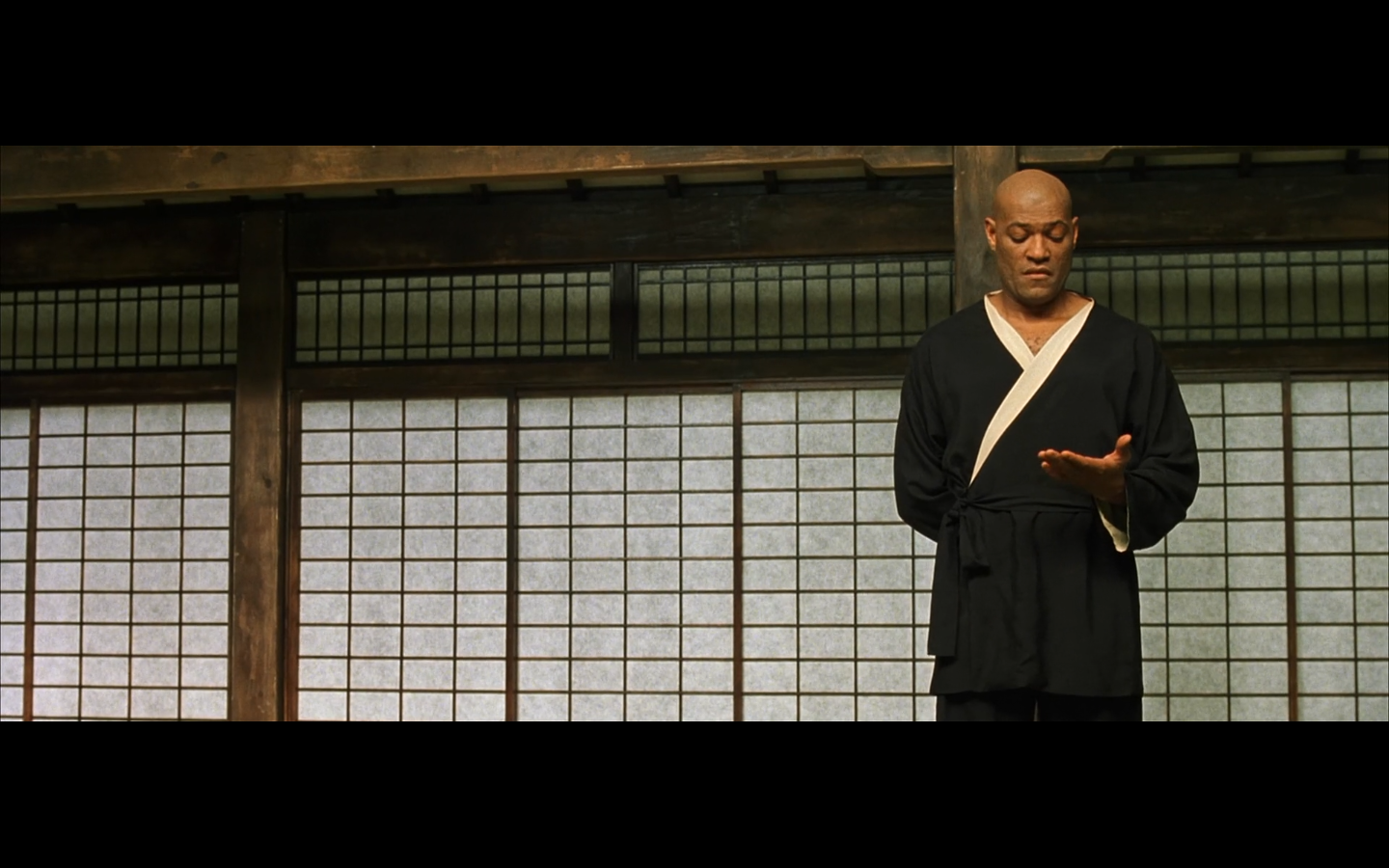 It’s a bigass dojo. First, there’s the massive scale of it and how wide they chose to make this shot. Then there’s the religious or symbolic significance; “dojo,” or 道場, is a combination of the characters for “the way” or “the path” and “place.” Just as he is the One, he is learning the Way. Japanese philosophy treats learning and discovery as a path — the terms are one and the same. So a dojo is the perfect place for Morpheus to be trying to open Neo’s mind for the first time, especially since he’s always making metaphors about knowing the path and walking the path and all that. It’s probably unintentional, but rather than setting up the fight lengthwise down the mats, they’re fighting across mats, which suggests the breaking of rules or boundaries. But again, probably unintentional.