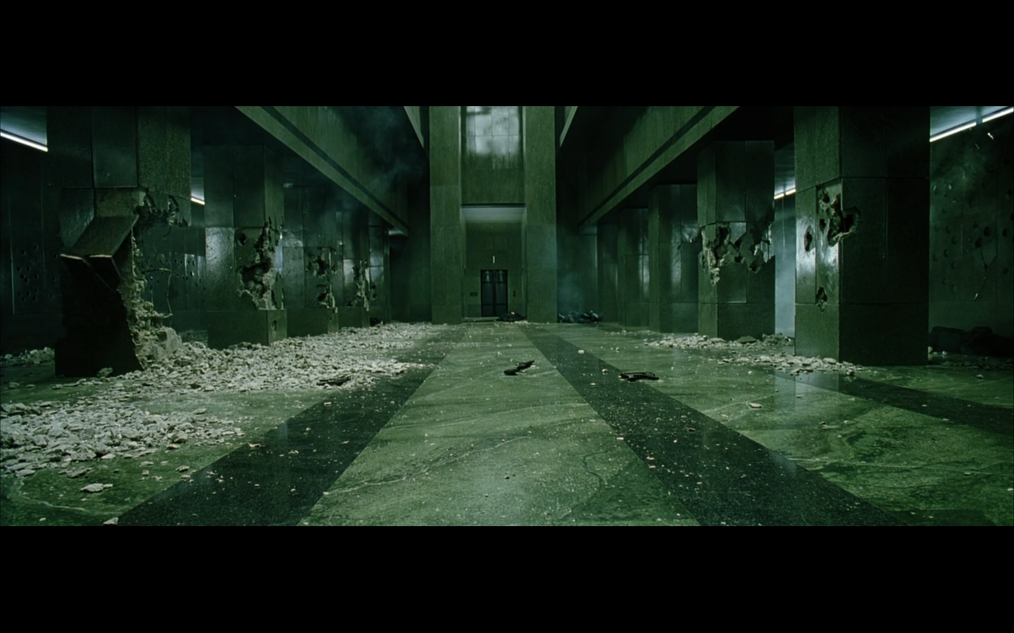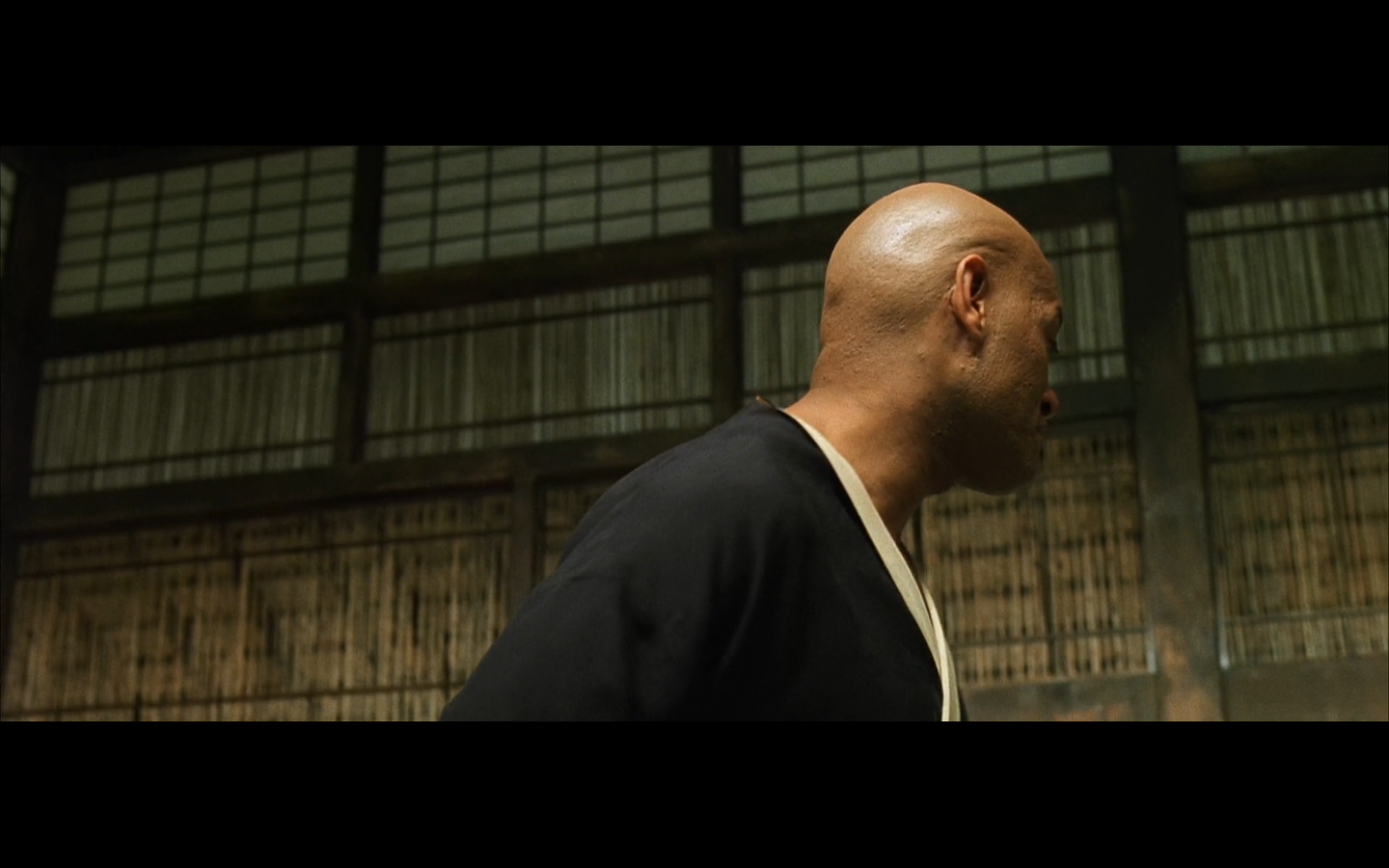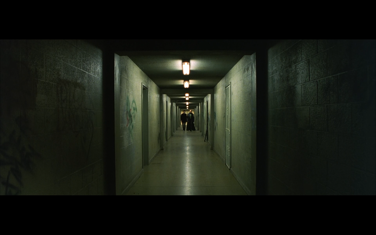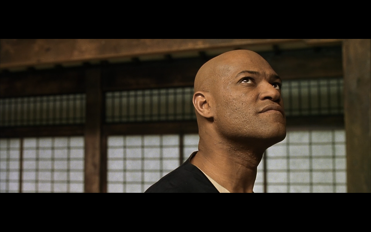 It’s a bigass dojo. First, there’s the massive scale of it and how wide they chose to make this shot. Then there’s the religious or symbolic significance; “dojo,” or 道場, is a combination of the characters for “the way” or “the path” and “place.” Just as he is the One, he is learning the Way. Japanese philosophy treats learning and discovery as a path — the terms are one and the same. So a dojo is the perfect place for Morpheus to be trying to open Neo’s mind for the first time, especially since he’s always making metaphors about knowing the path and walking the path and all that. It’s probably unintentional, but rather than setting up the fight lengthwise down the mats, they’re fighting across mats, which suggests the breaking of rules or boundaries. But again, probably unintentional.