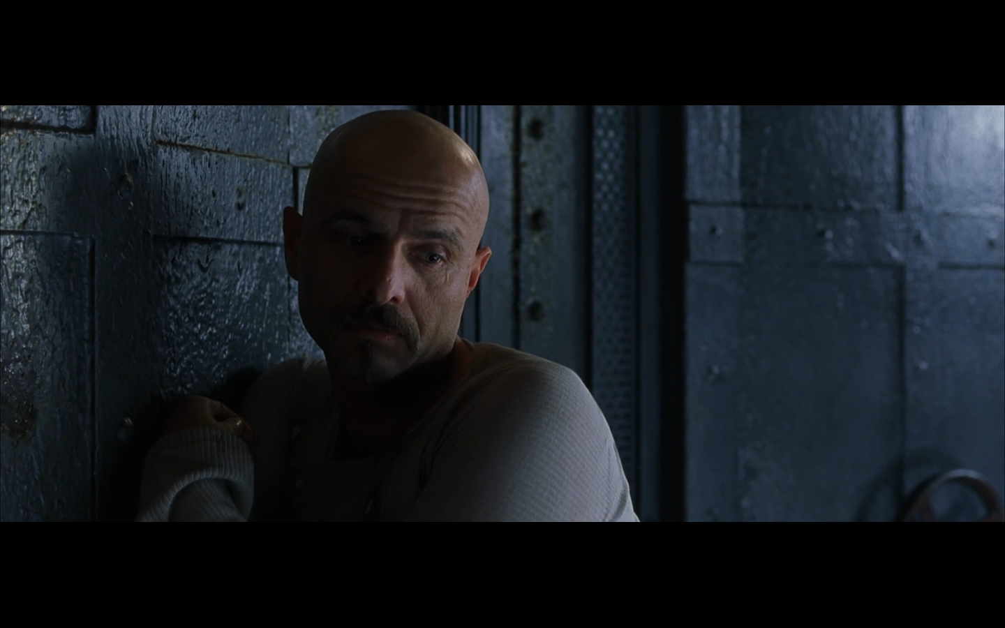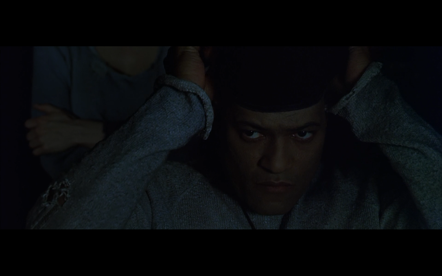 This whole shot was brilliantly designed. It’s a rotating camera shot. Two, in fact. One rotating camera in an empty room, close on a ringing phone. And a second rotating camera on the Nebuchadnezzar (still can spell that right without thinking about it), as everyone is plugged in. We pan around in a circle to the entire crew. And at the end of the shot, this is what we see. And then Morpheus walks forward and answers the phone, saying, “We’re in.” It’s badass as shit.